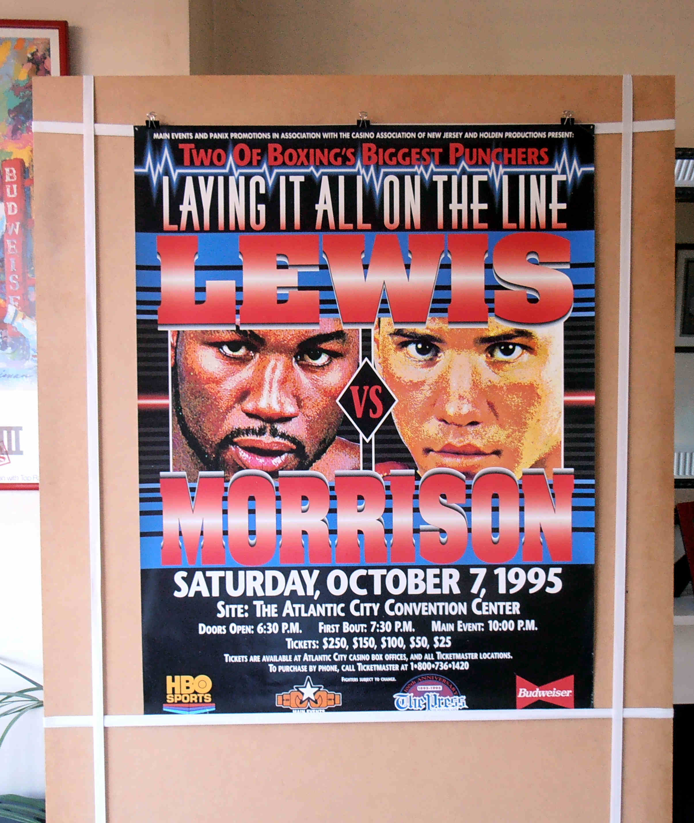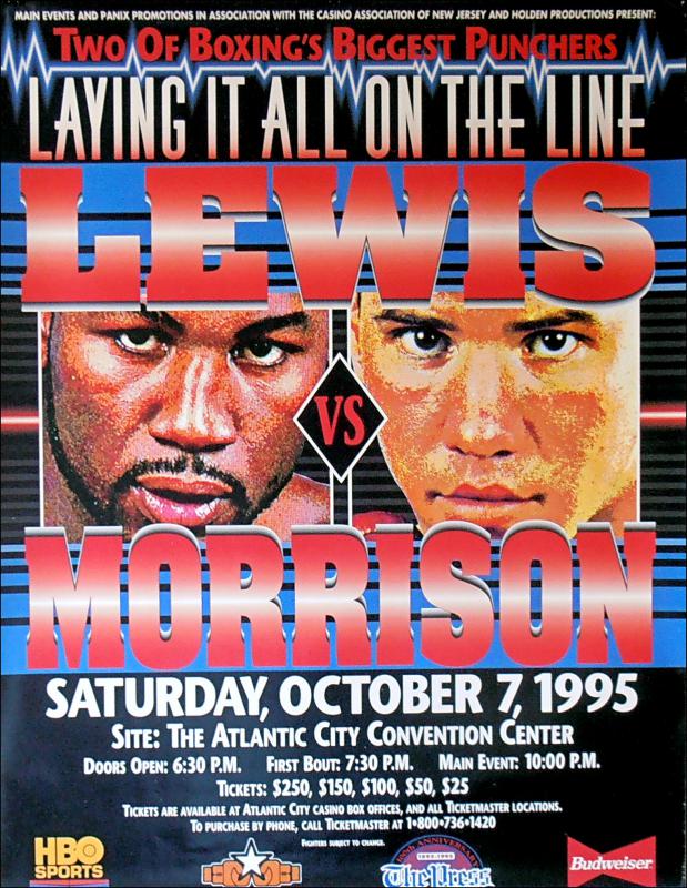 Description : Here we have an original onsite poster for the WBC Heavyweight Championship eliminator, WBC No#1 contender-Lennox Lewis vs. No#2 contender, Tommy Morrison. Billed as "Laying it all on the Line", contested on October 7, 1995 at the Convention Center in Atlantic City, New Jersey.