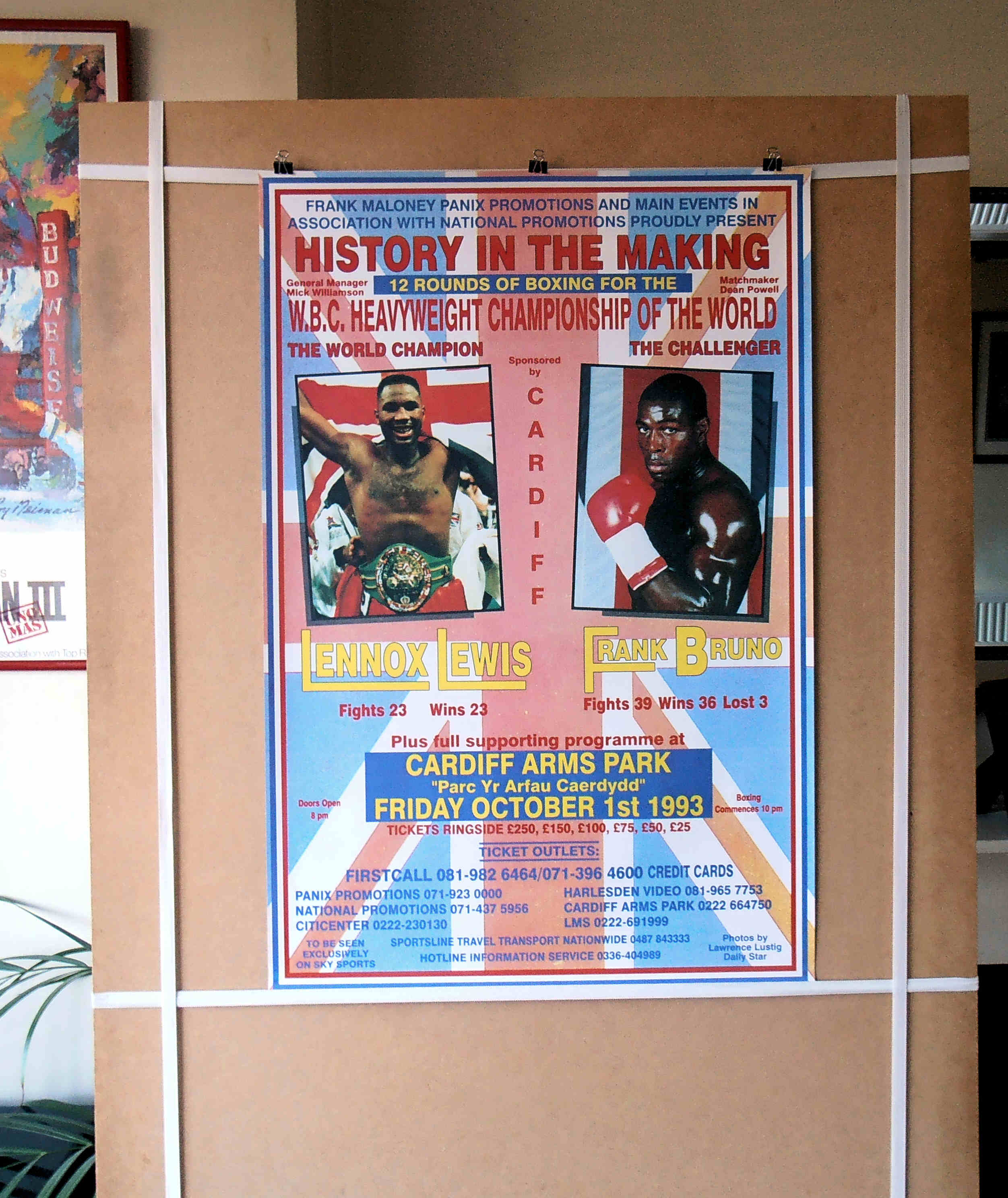 Description : Here we have an original onsite poster for the heavyweight SuperFight of 1993....This all British affair got the handle of "The Battle of Britain" This fight took place on 1 October 1993, at the National Stadium, Cardiff Arms Park, Cardiff, Wales. It was between WBC Heavyweight Champion Lennox Lewis, who was making the second defence of his title and Frank Bruno, who was fighting in his third world title bout, his two previous title attemps where against Tim Witherspoon & Mike Tyson.