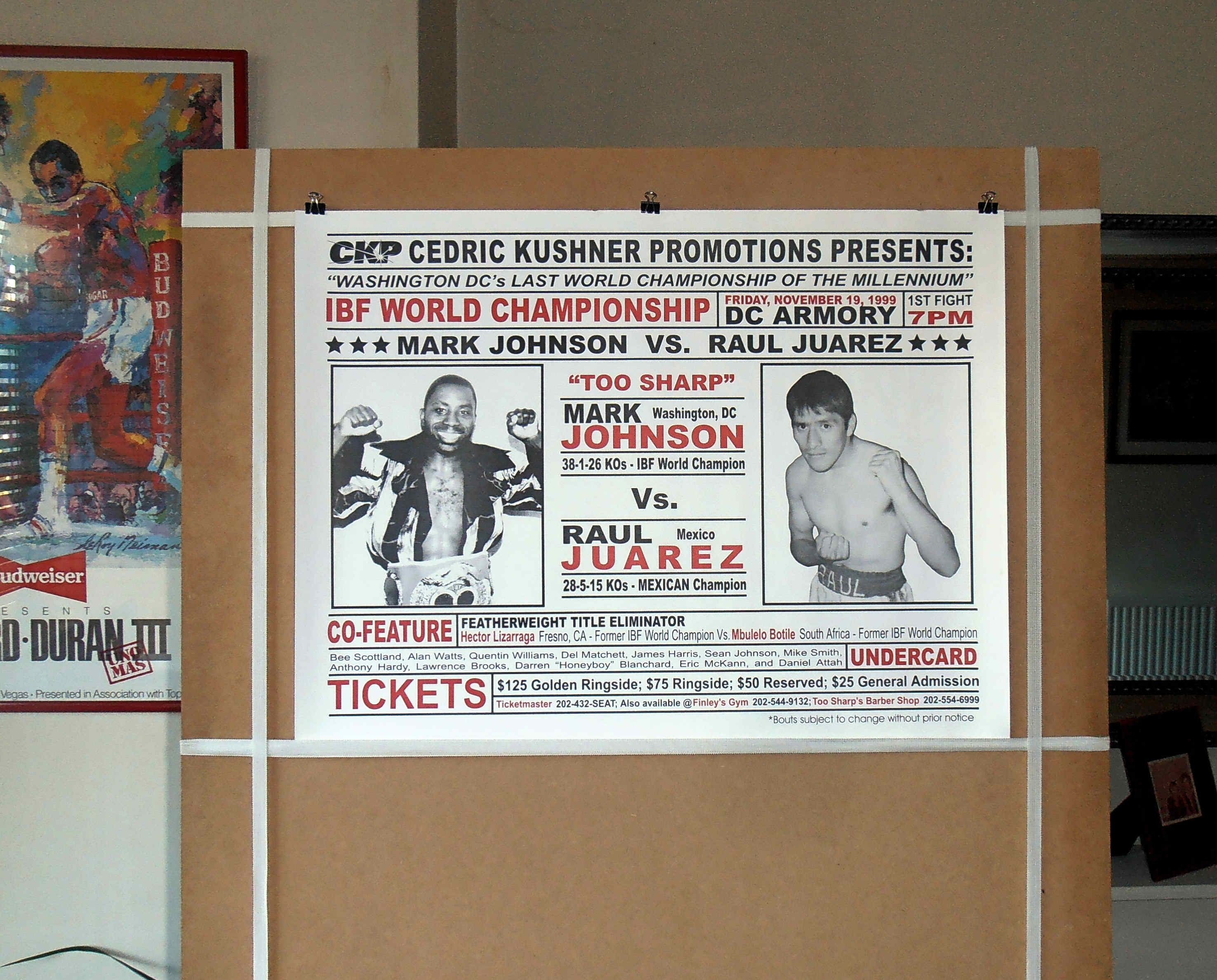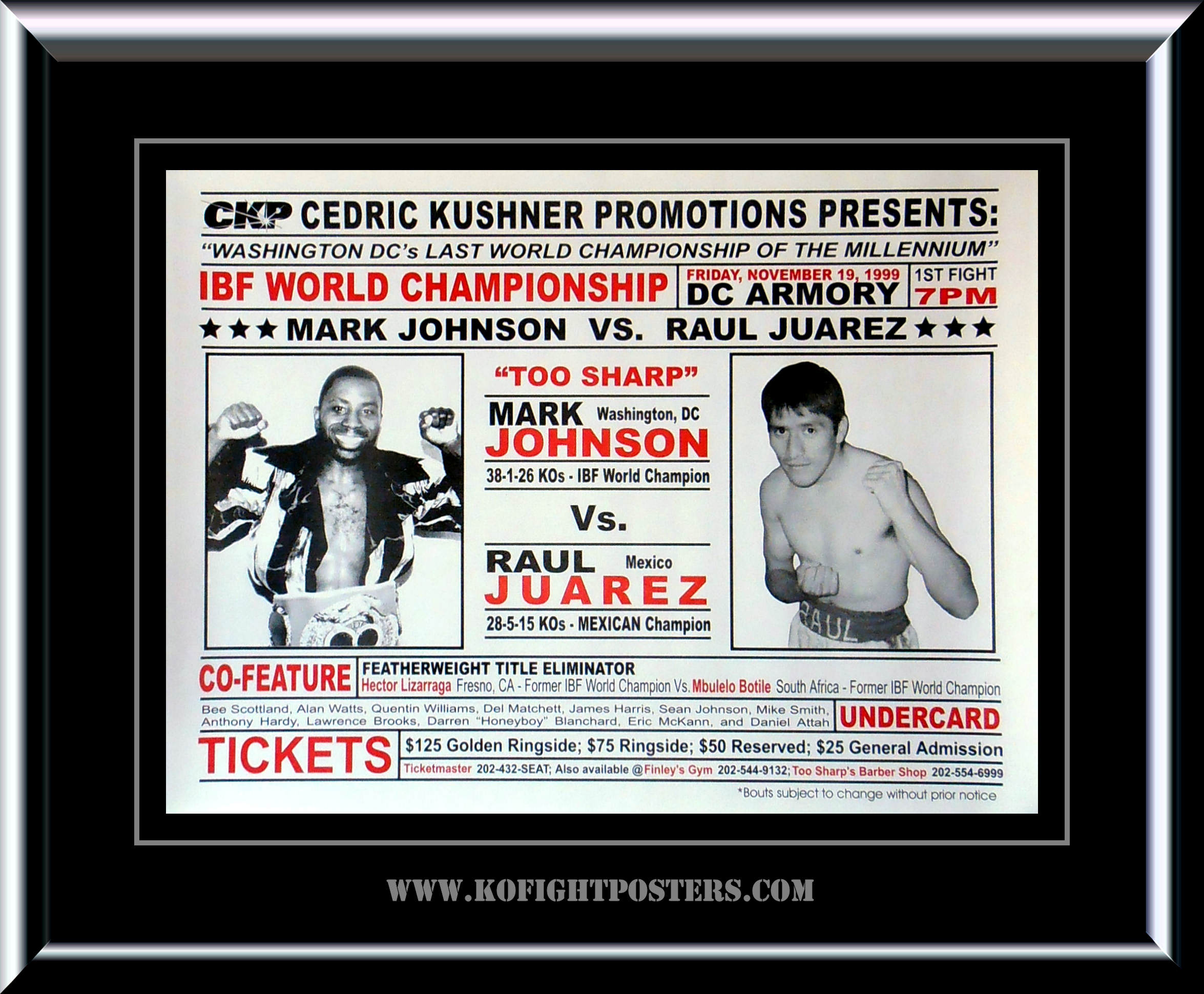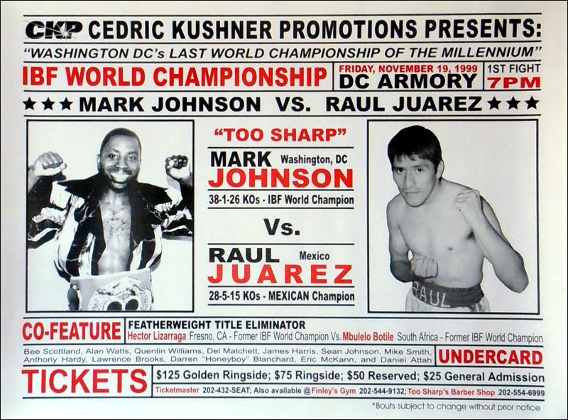 Description : Here we have an original onsite boxing fight poster from the bout held at the DC Armory, Washington, District of Columbia, USA for the IBF World super flyweight title on 19th November 1999.