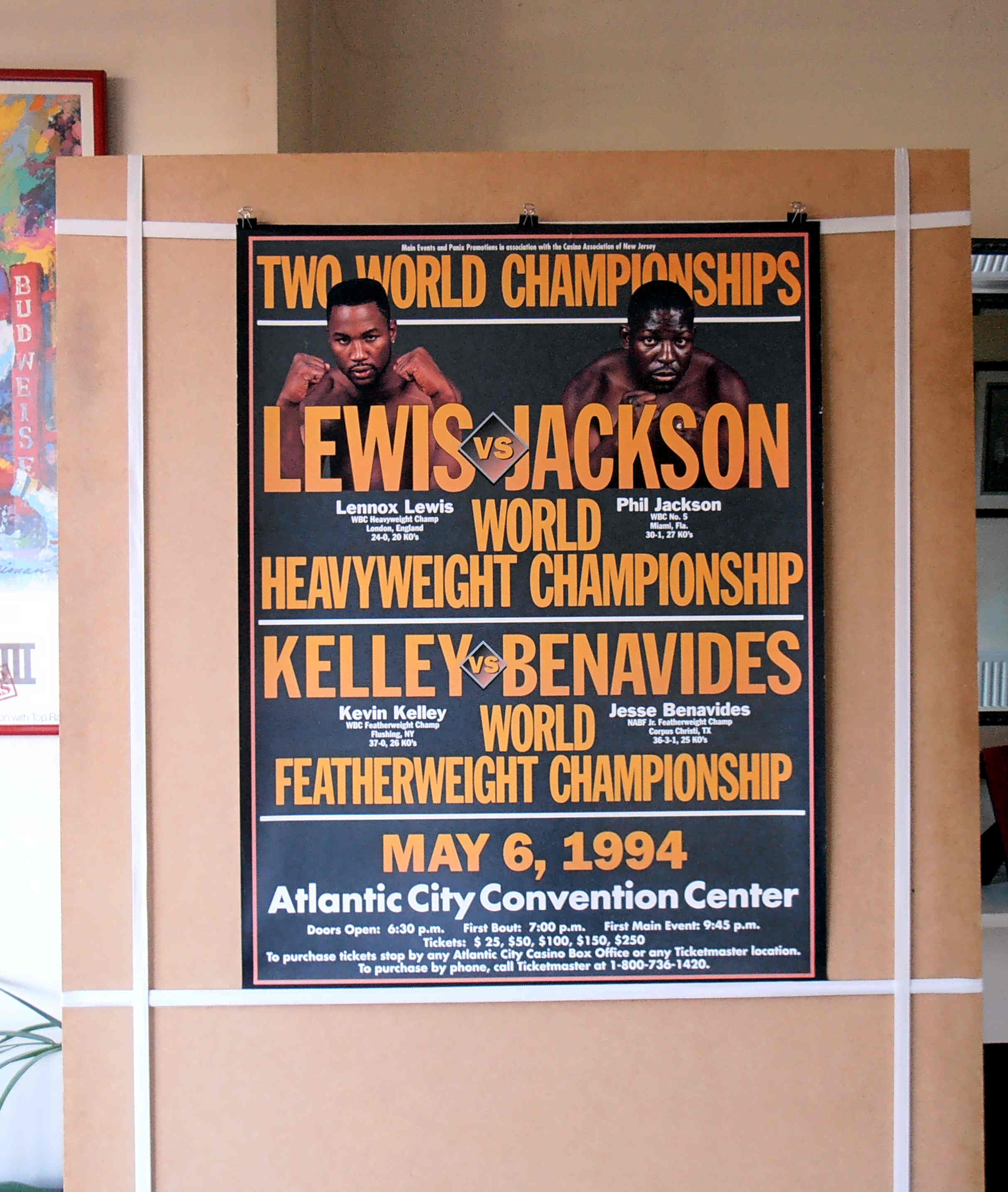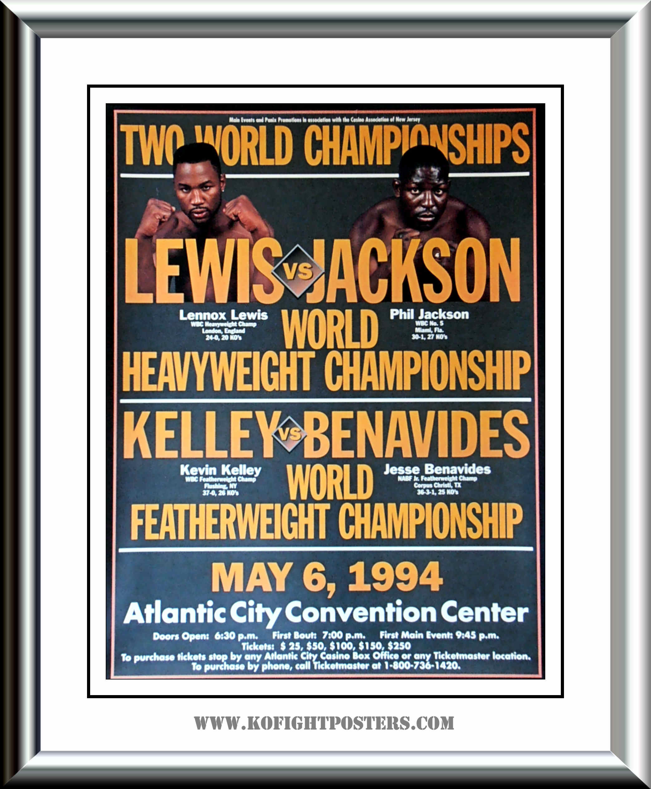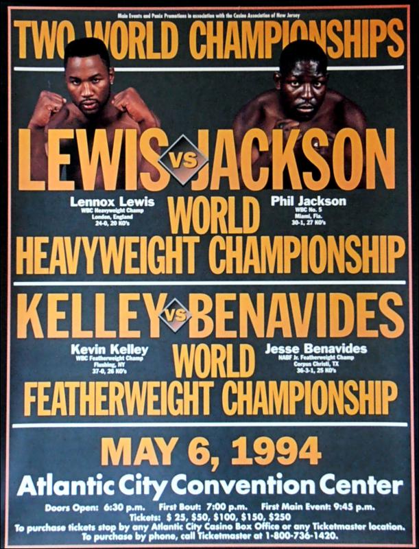 Description : Here we have an original onsite boxing fight poster for the Lennox Lewis vs. Phil Jackson match contested on May 6th, 1994 at the Atlantic City Convention Centre, New Jersey USA, for the WBC Heavyweight Championship.