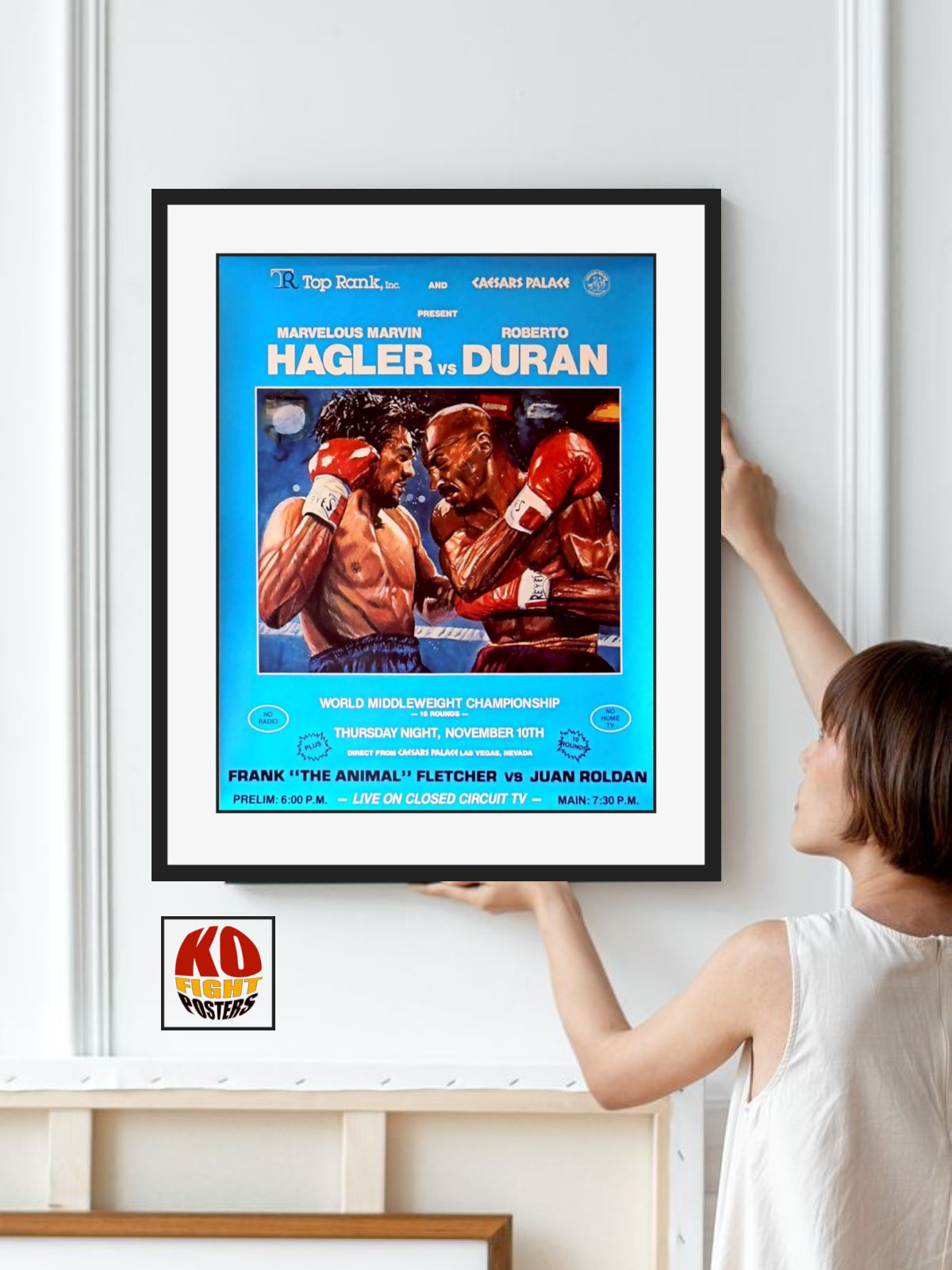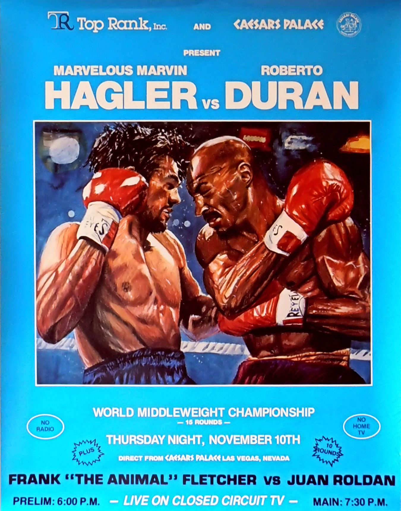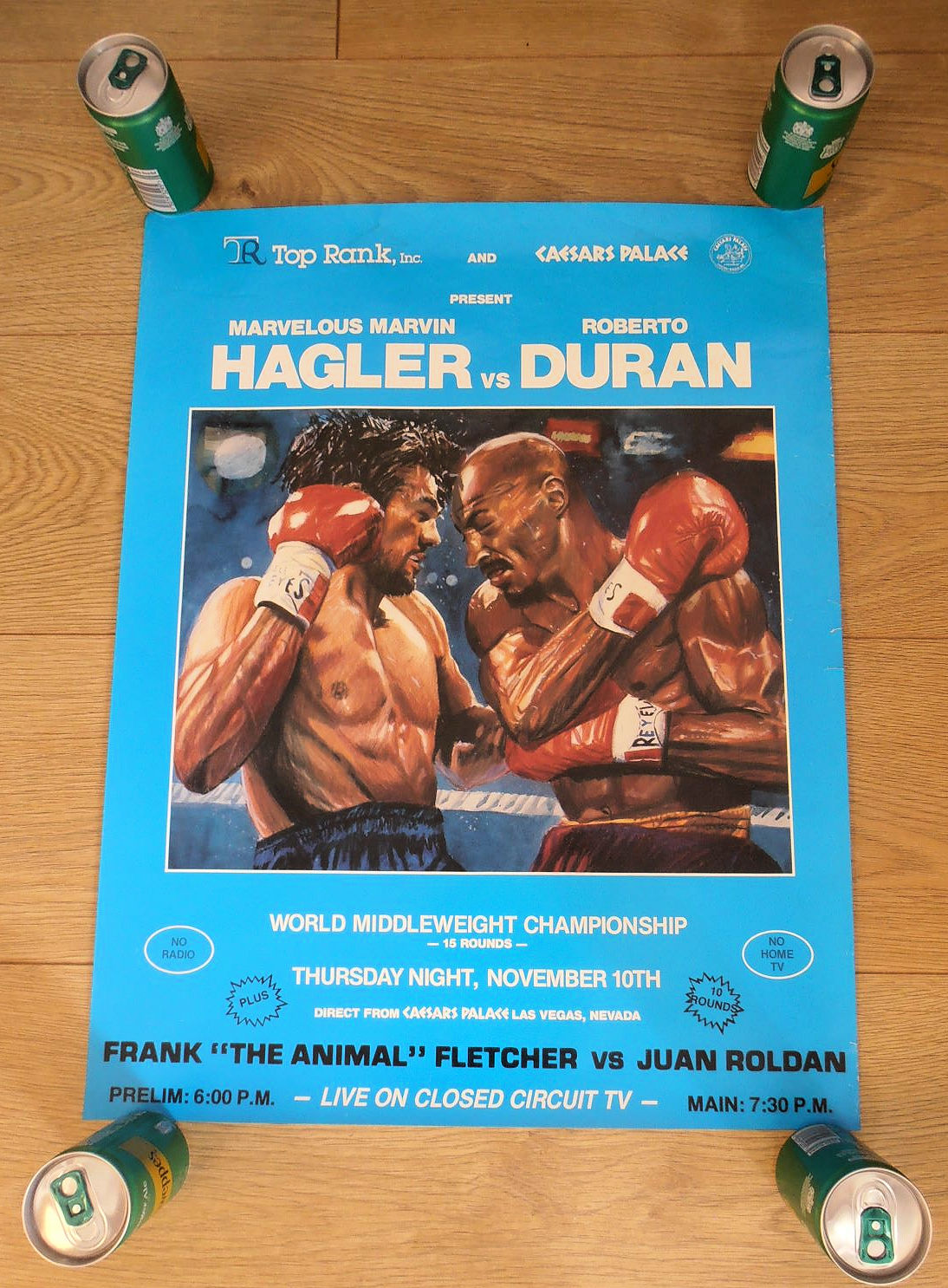 Description : Here we have a super rare vintage Caesars Palace closed circuit poster for the mega fight showdown for the undisputed middleweight championship between the reigning & defending champion Marvelous Marvin Hagler & the challenger, the reigning WBA Light/Middleweight champion the Legendary Roberto Duran who was attempting to become the first fighter in history to win 4 world crowns in 4 weight divisions.