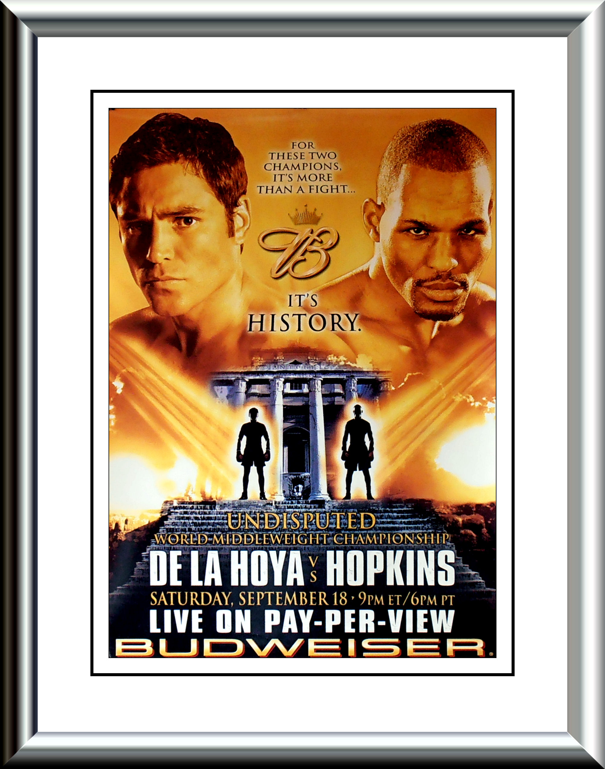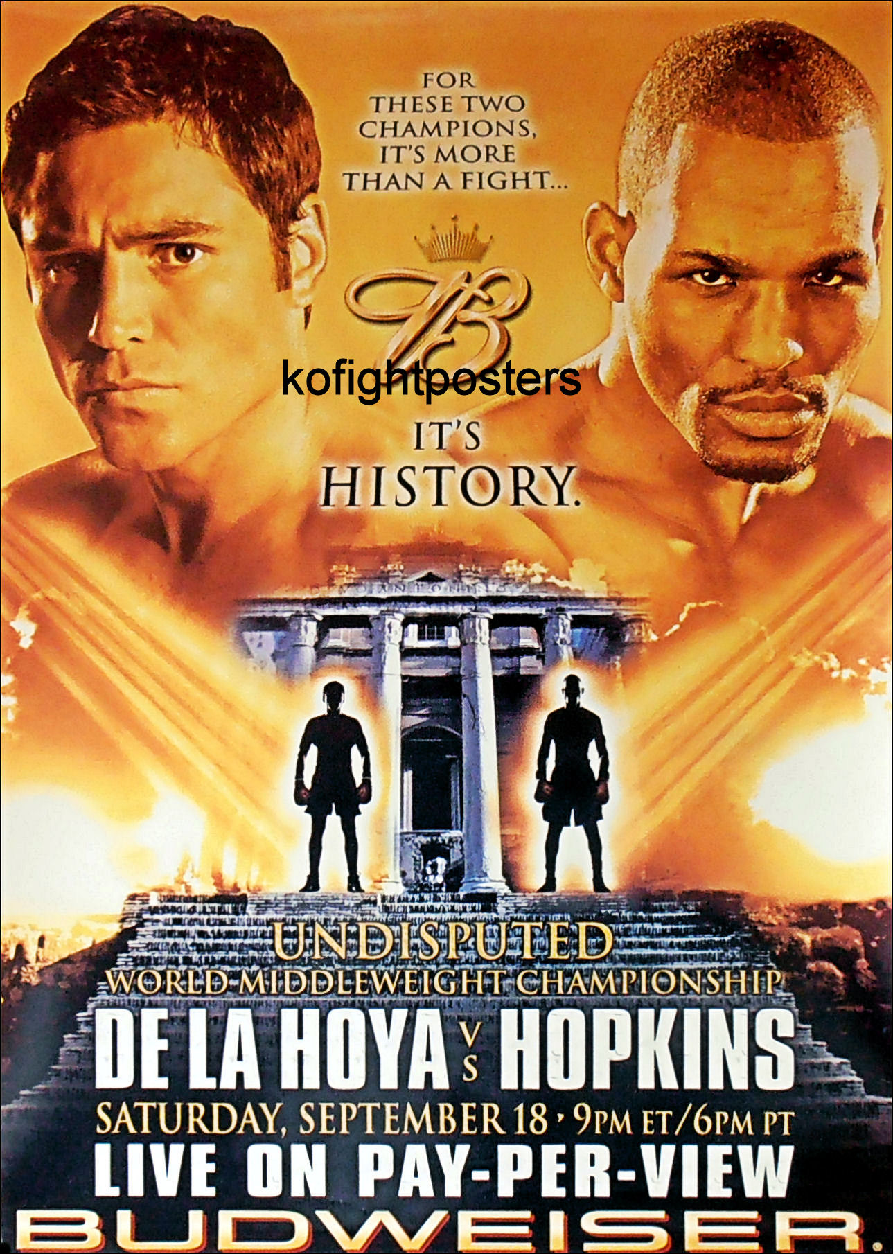 De La Hoya fought Bernard Hopkins (44-2-1) in mega unification match on September 18, 2004 at the MGM GRAND Garden Arena in Las Vegas. Hopkins held the WBC, WBA, and IBF middleweight titles, was recognized as Lineal and The Ring champion, and was considered by many to be the number one pound for pound fighter in the world. Although the fight was at a catchweight of 158 pounds, 2 pounds under the Middleweight 160 LB limit to compensate for De La Hoya moving up in weight to challenge Hopkins on a supposed equal weight basis. Many thought De La Hoya was too small for the weight class and Hopkins was considered a heavy odds-on favorite........