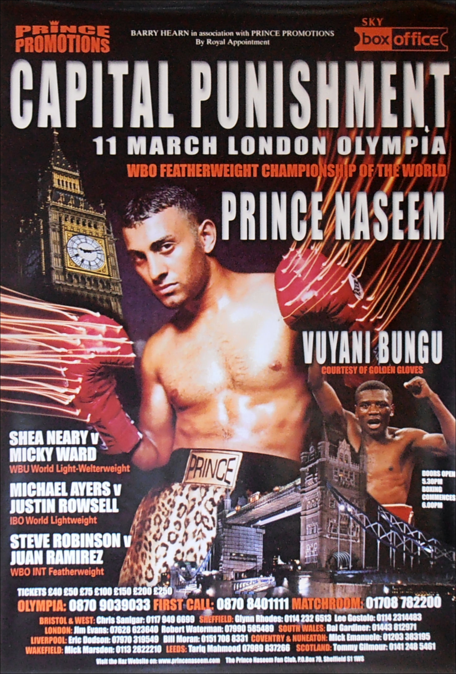 Prince Naseem was making his 14th defence of his WBO World featherweight title when he faced South African challenger Vuyani Bunga. Hamed, known for his extravagant ring entrances, entered the ring on a "magic carpet" suspended from the ceiling. From the opening bell Bungu fought from a slouched stance, trying to outbox the highly unorthodox Hamed. However, Hamed's superior reflexes, power, and overall boxing ability were too much for his over-matched opponent. Though Bungu occasionally landed some good shots, they did not appear to have an effect on Hamed. Having underwhelmed in his previous three bouts, Hamed dominated this fight from start to finish. Referee Joe Cortez stops the bout after a hard left hand from Hamed put Bungu down at 1.38 of the 4th round.