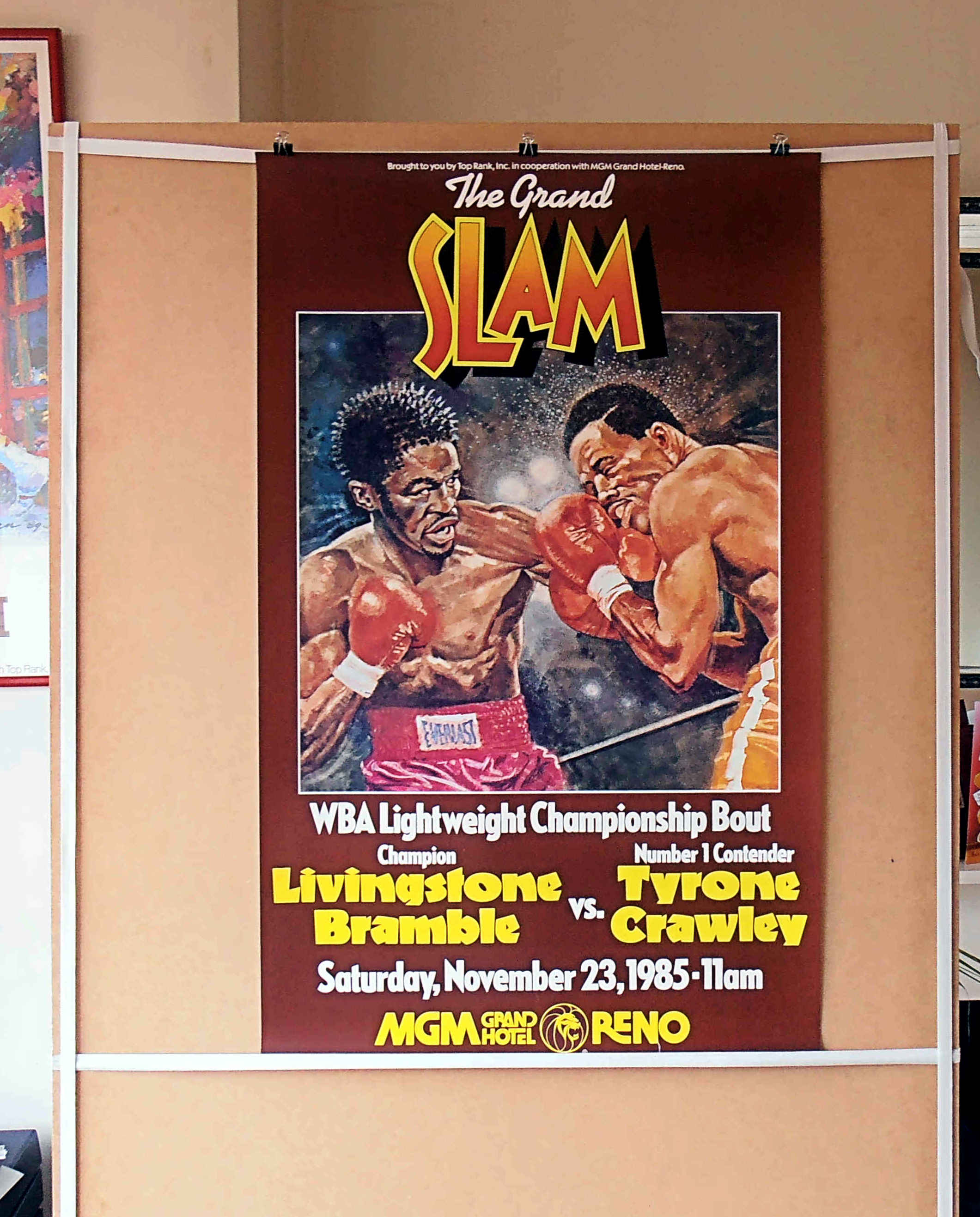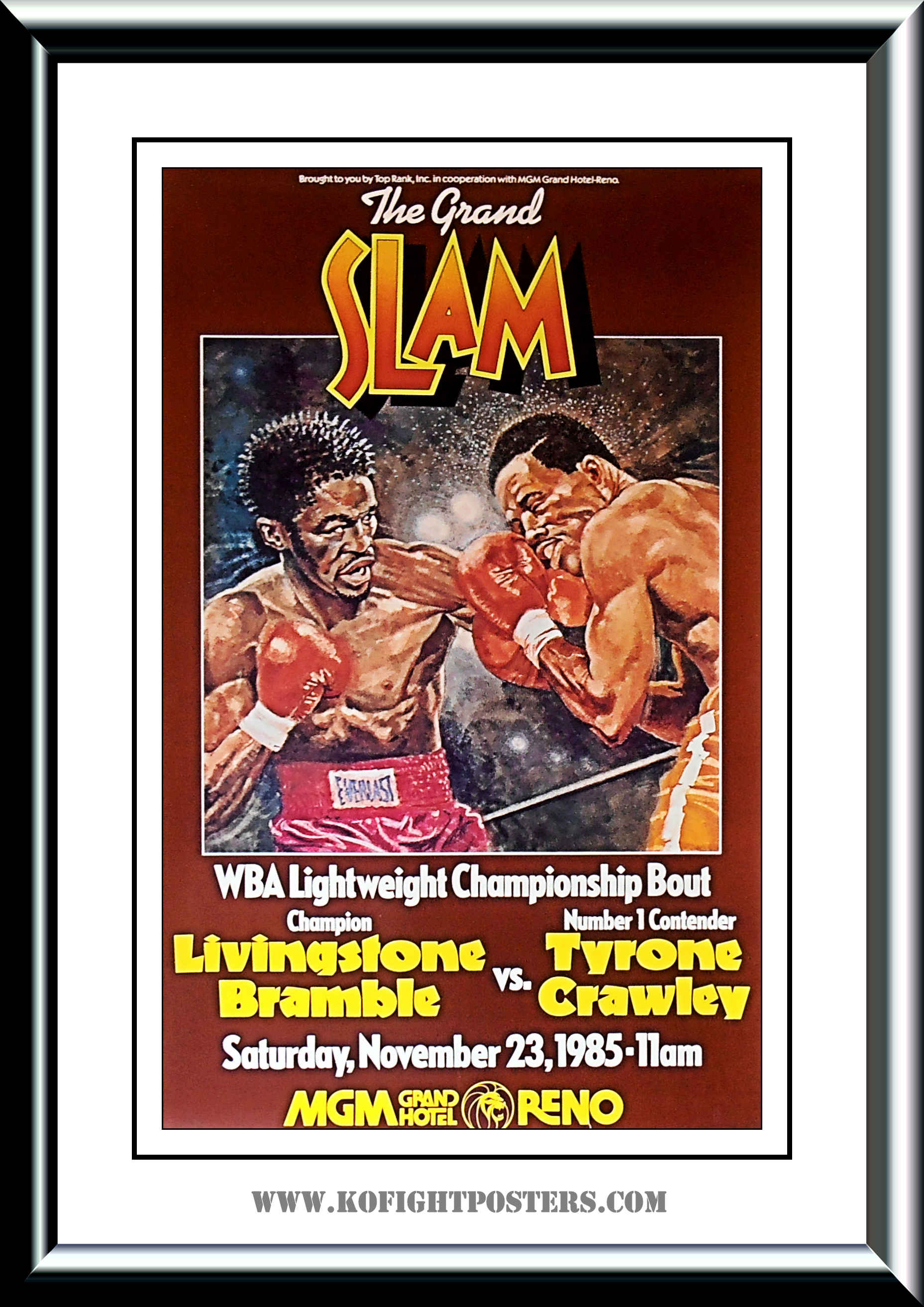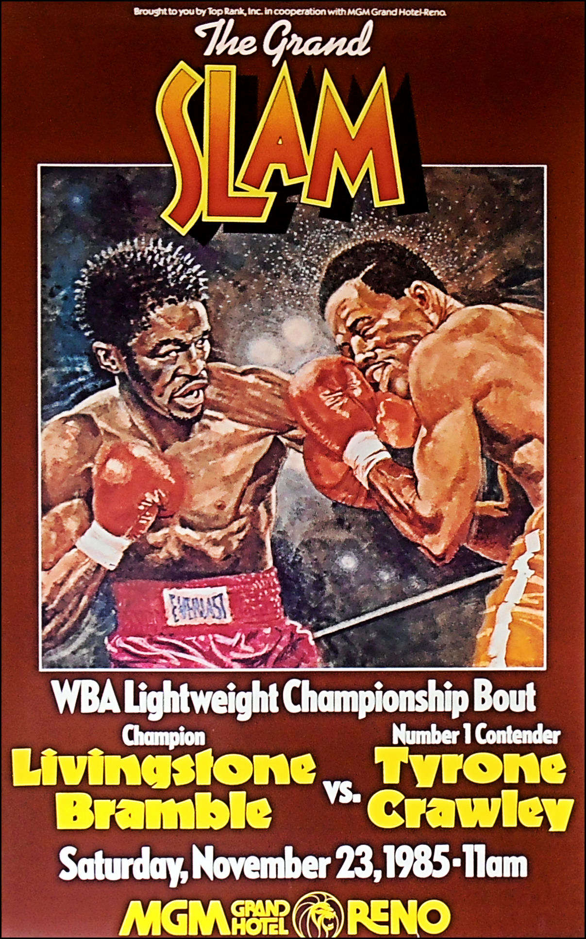 Description : Here we have an original vintage onsite boxing fight poster for Livingstone Bramble vs. Tyrone Crawley, contested on November 23rd 1985 at the MGM Grand Hotel, Reno Nevada, for the WBA World Lightweight Championship.