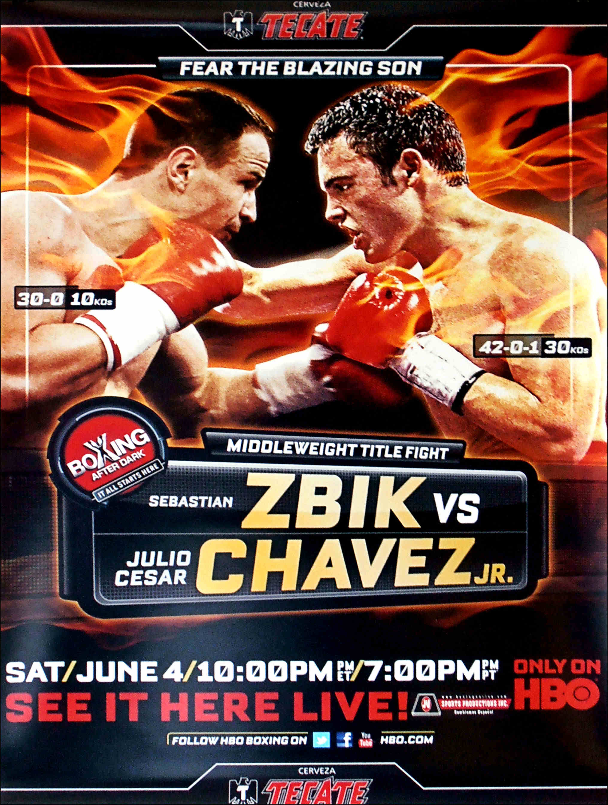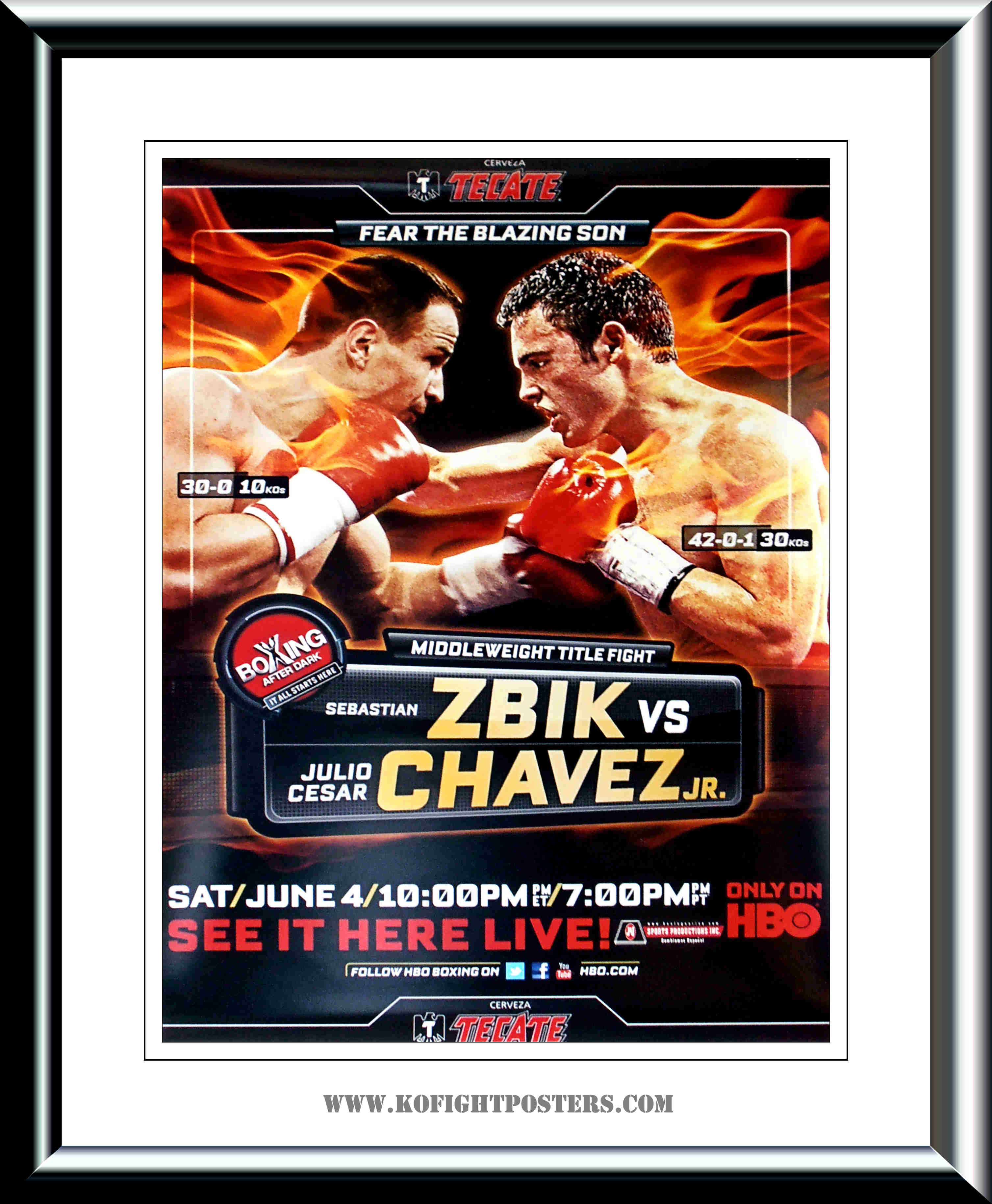 Description : Here we have an original Tecate official fight sponsors poster for the WBC Middleweight Championship held at the Staples Center Los Angeles 14th June 2011. It was the first time that the son of legendary boxing Champion Julio Csar Chvez, fought for a world title, Chvez, Jr. went on to become the new WBC Middleweight Champion, out pointing the German champion and winning by majority decision | judge: John Keane 116-112 | judge: Raul Caiz Jr 115-113 | judge: Steve Morrow 114-114.