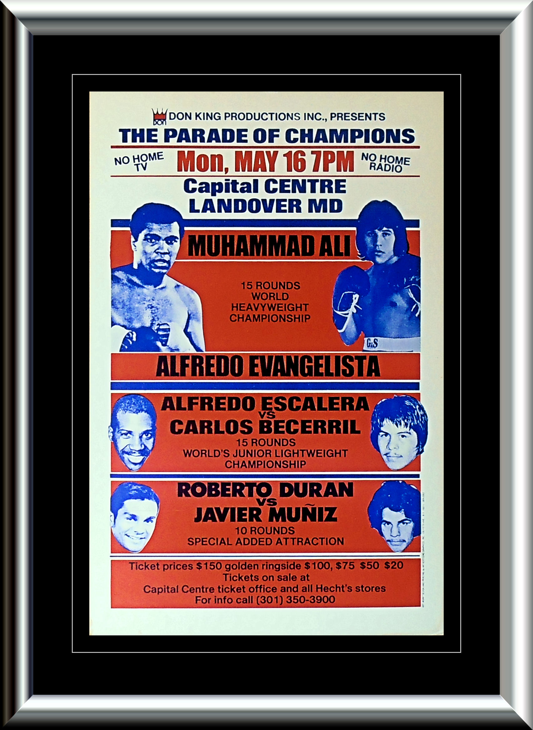 Description : Here we have an original Vintage 1977 onsite poster presented by Don King Productions for the World Heavyweight Championship fight between Muhammad Ali & Alfredo "The Lynx of Montevideo" Evangelista.
