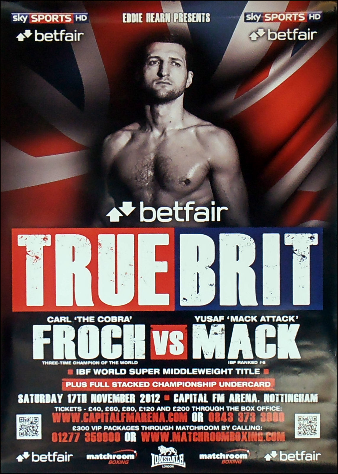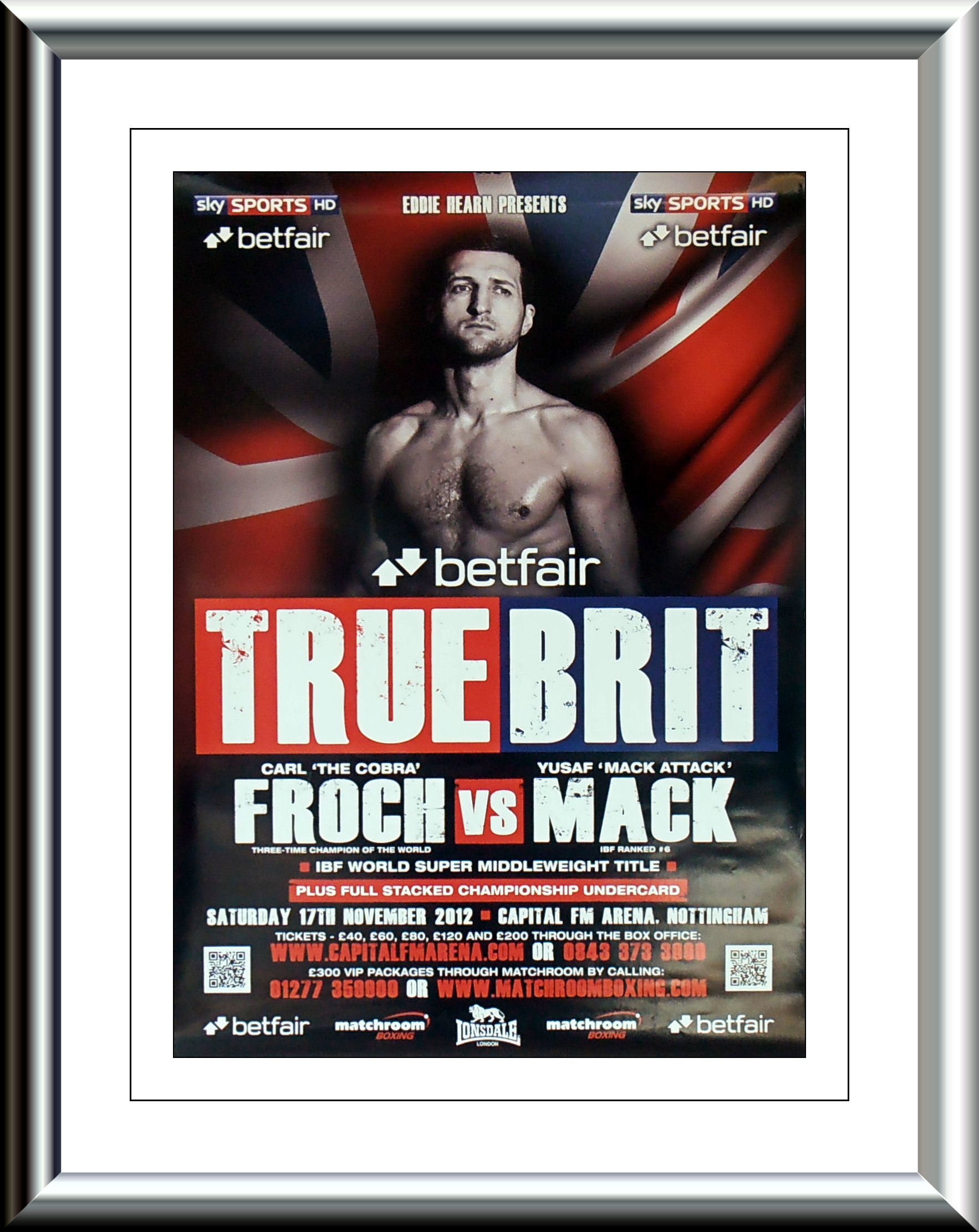 Description : Here we have the Official Matchroom Boxing promotional poster, these are not made available for public consumption hence the scarcity. This was the Cobra's 1st defence of his IBF Title he ripped from defending champion Lucian Bute in 5 brutal rounds. After the Bute fight and acquiring IBF belt, Froch defeated Yusaf Mack via knockout. The British website BoxRec named Froch the "Fighter of the Year" at the end of 2012 and rightly so!