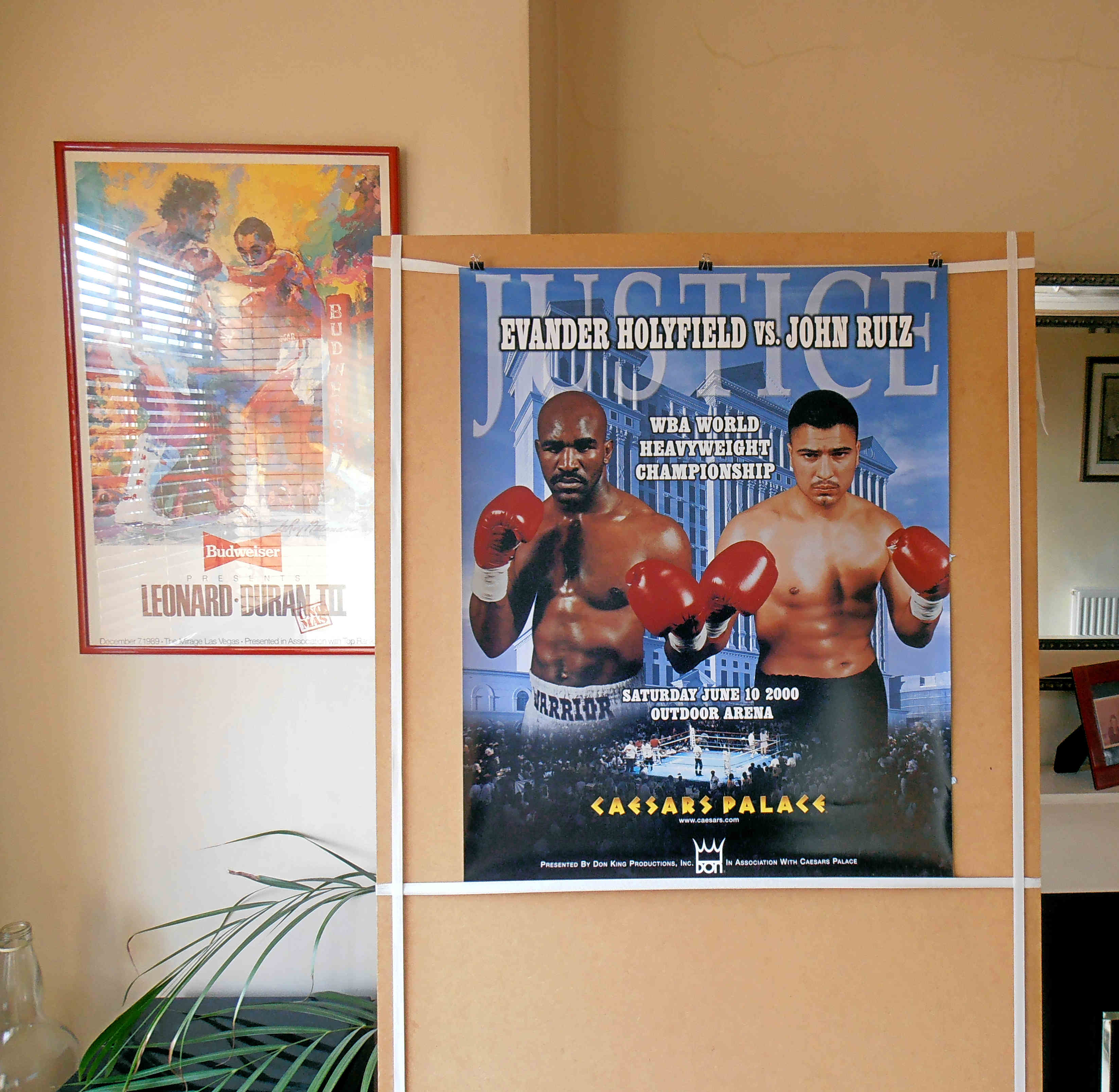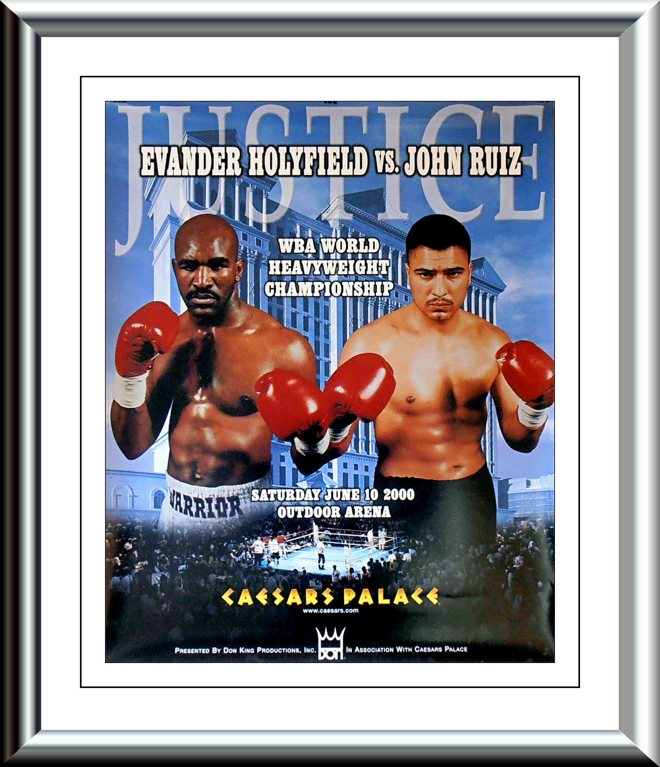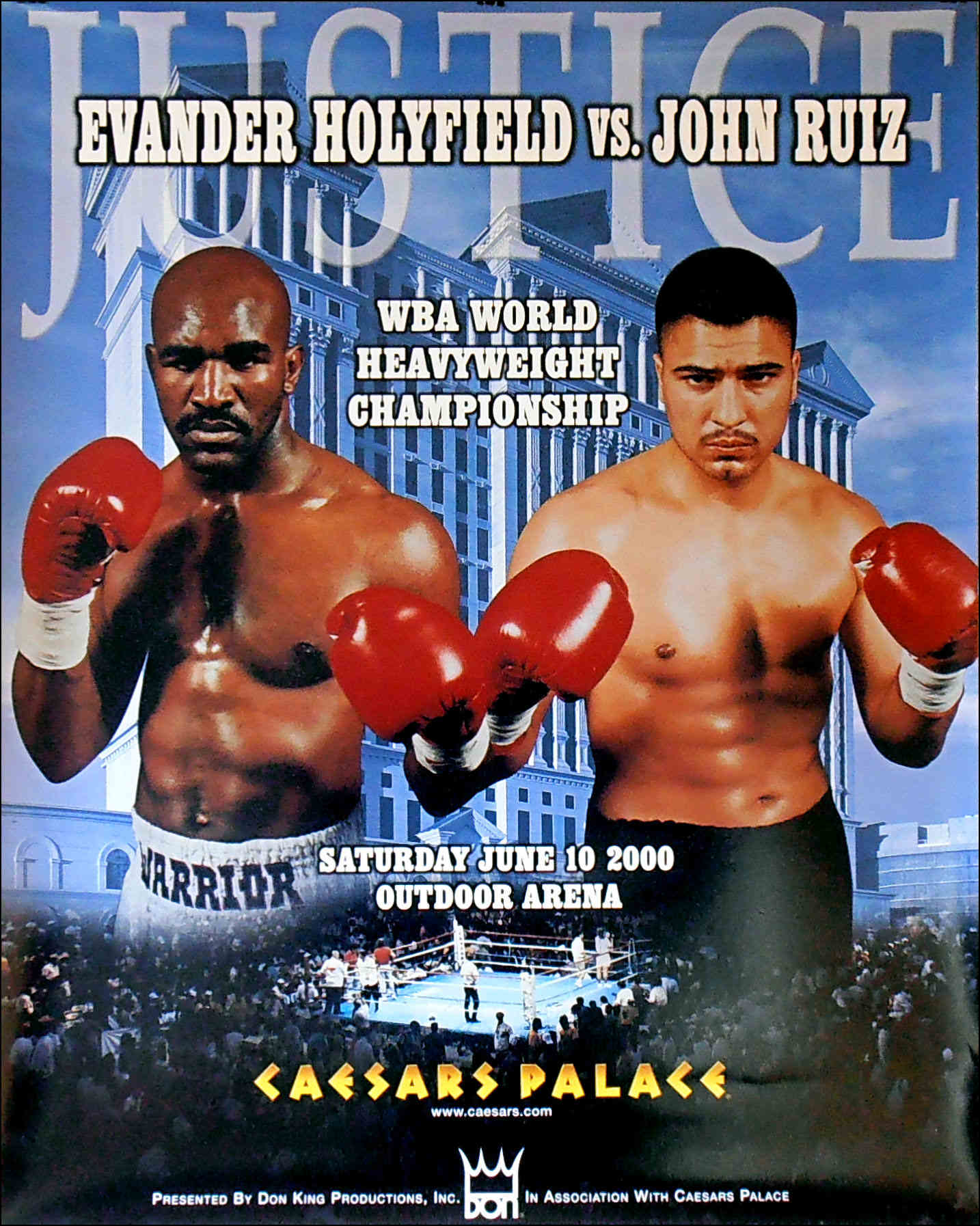 Description : Here we have an original onsite poster from Caesars Palace for the 1st meeting between Evander Holyfield & John (Juan) Ruiz for the WBA Heavyweight Title. This fight was cancelled & rescheduled for the 8th August over the road at the Paris, I attended this fight at the Paris Casino in Las Vegas & not a cheap ticket to be had, considering the fight took place in a ballroom!