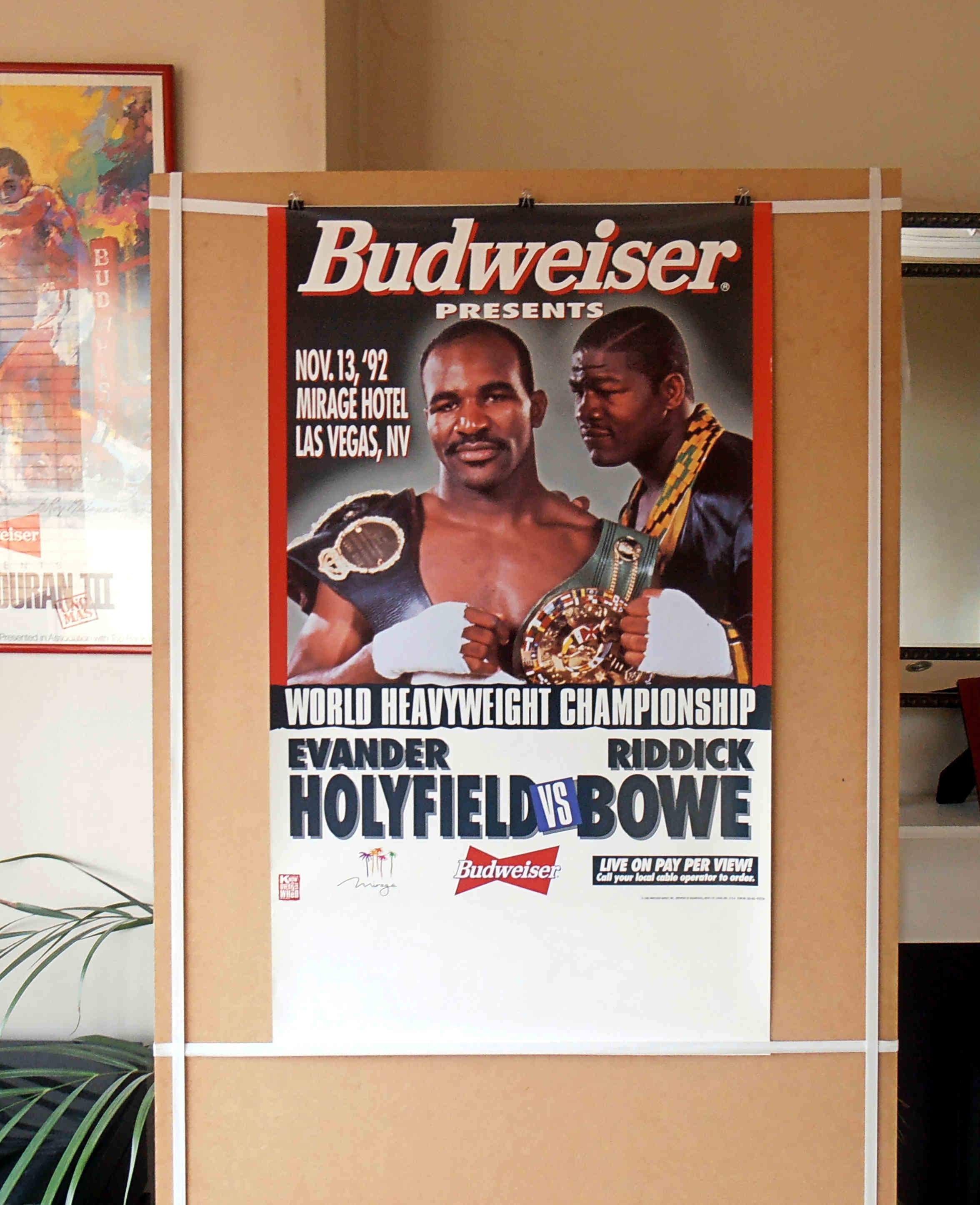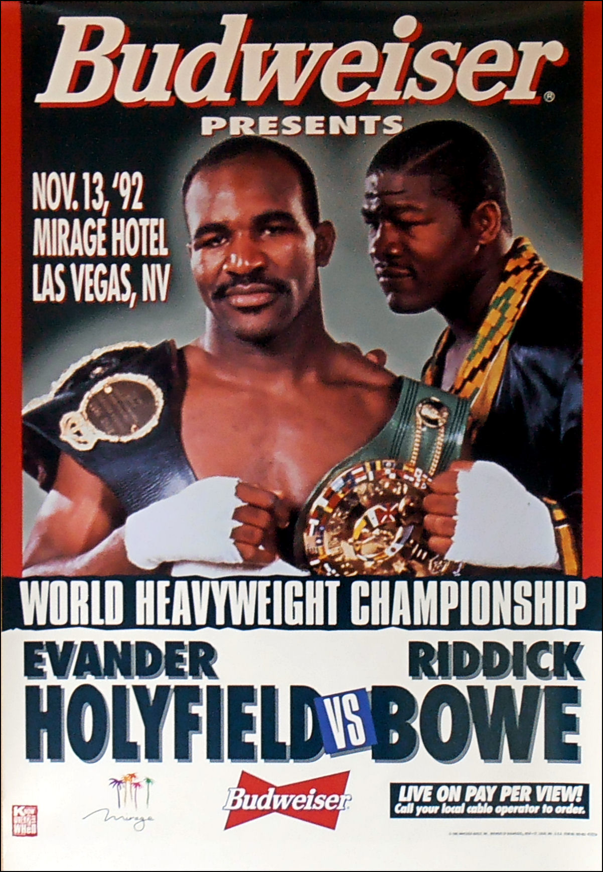 Description : Here we have an original Budweiser main event Mirage PPv fight sponsors poster from November 13, 1992 for the WBA, WBC and IBF Heavyweight championships held at the Thomas & Mac Centre, Las Vegas Nevada.