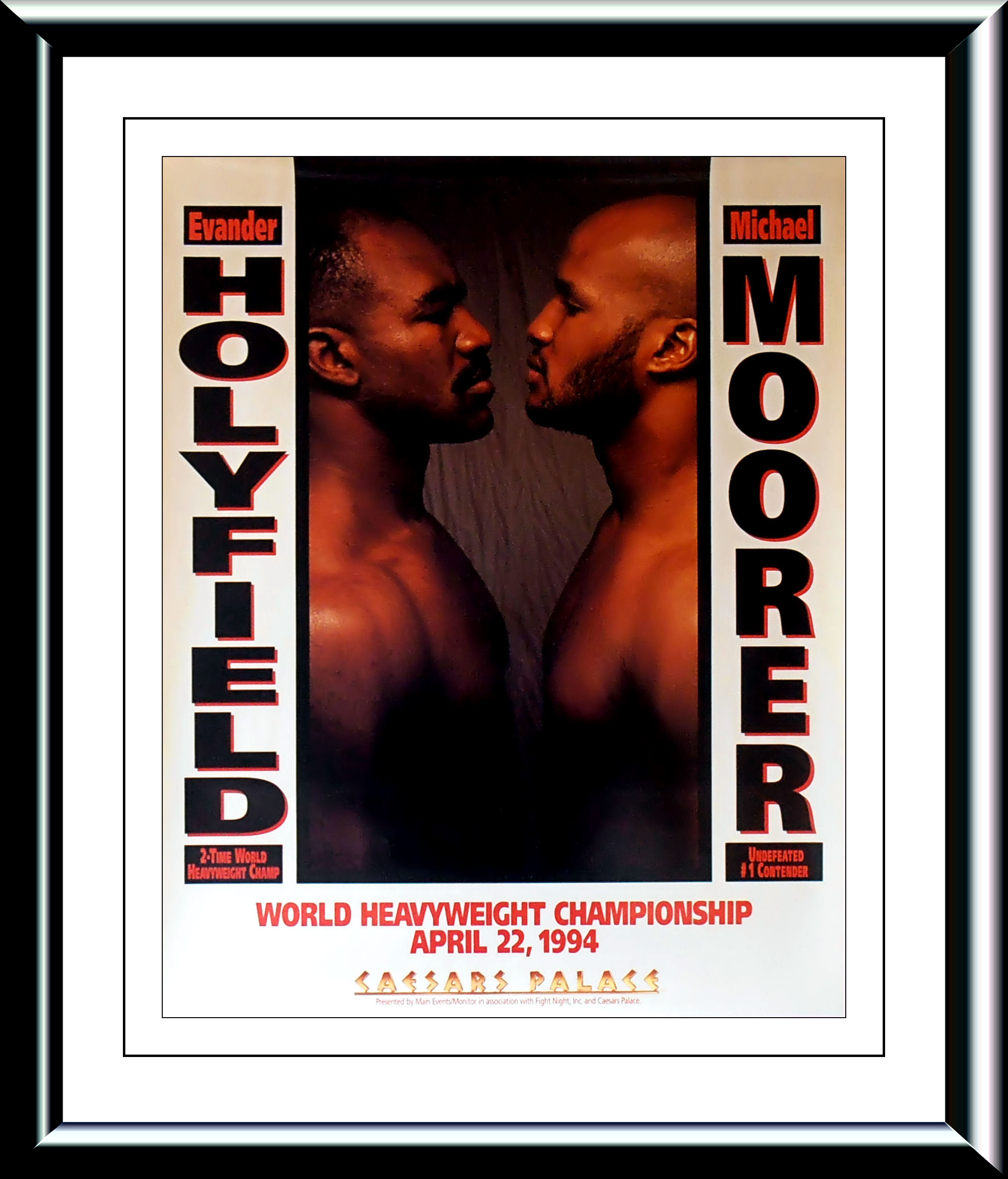 Description : Here we have the original onsite poster from Caesars Palace, April 22, 1994 for the WBA, IBF and Lineal Heavyweight Championships. After defeating Riddick Bowe in a closely contested rematch to regain his WBA, IBF and Lineal Heayweight titles, Holyfield had hoped for a unification match with the WBC Heavyweight Champion Lennox Lewis. Instead, the WBA and IBF demanded Holyfield face the mandatory challenger, undefeated southpaw Michael Moorer.