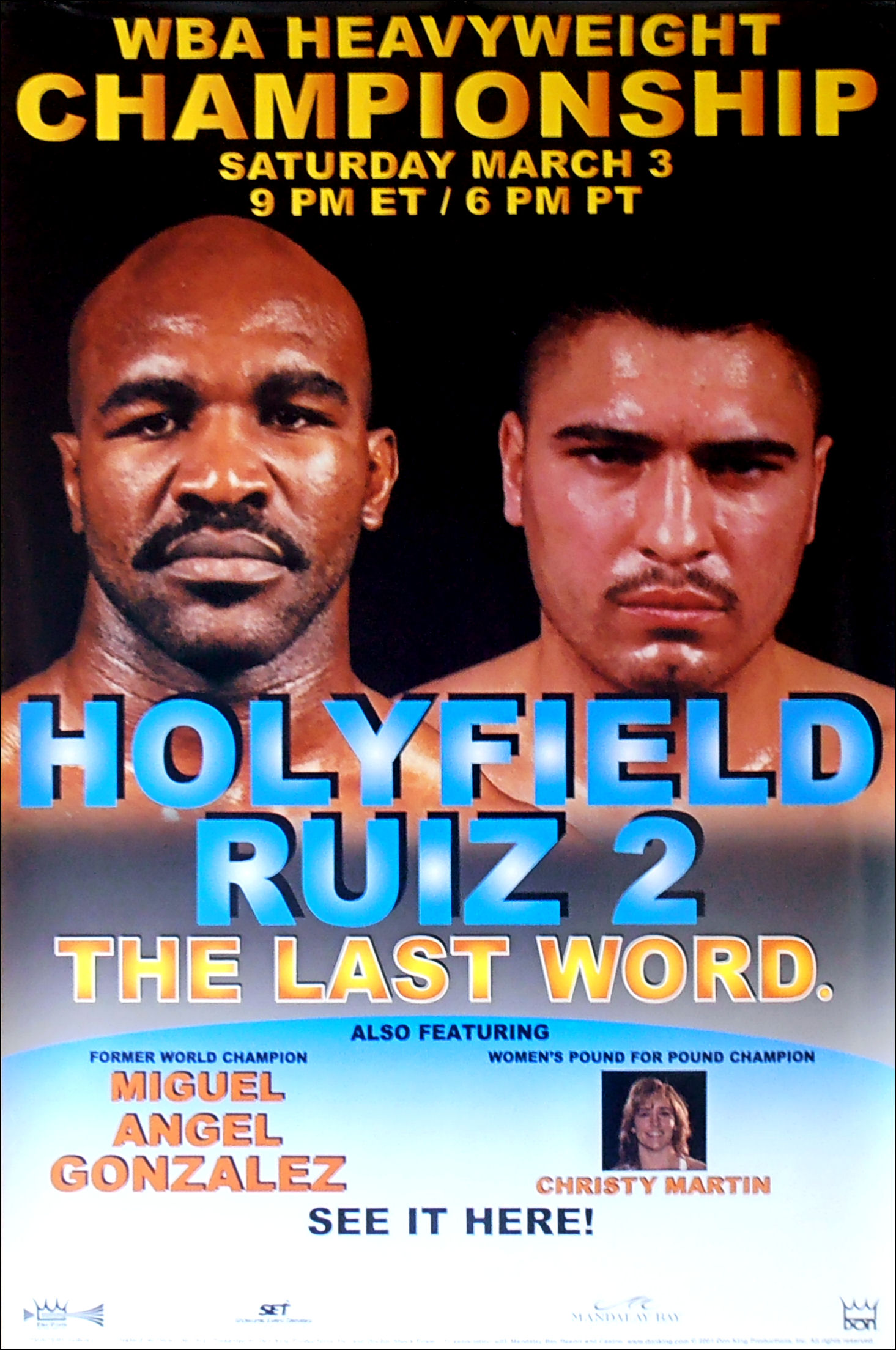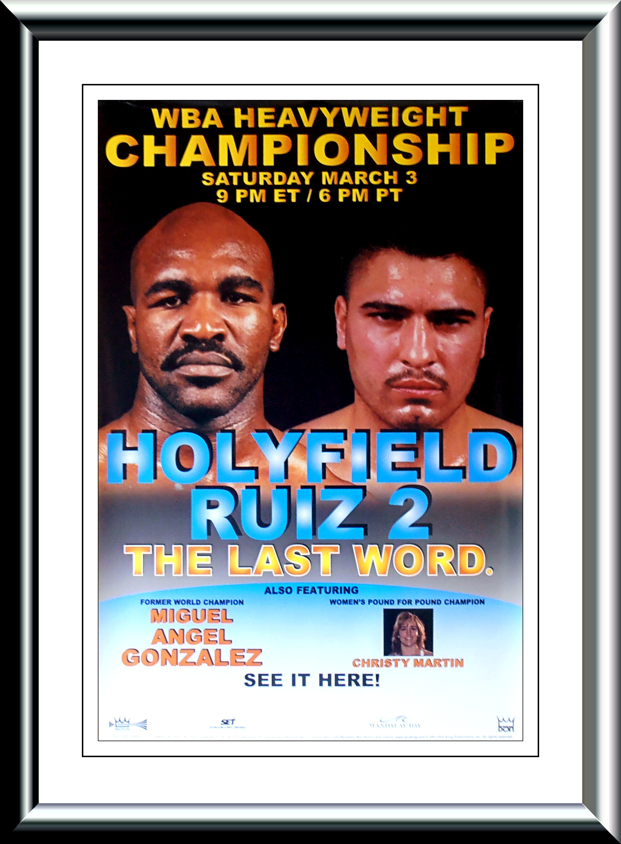 Description : Here we have an original Closed Circuit poster from Don King (Kingvision) for the rematch between Evander Holyfield & John (Juan) Ruiz for the WBA Heavyweight Title.