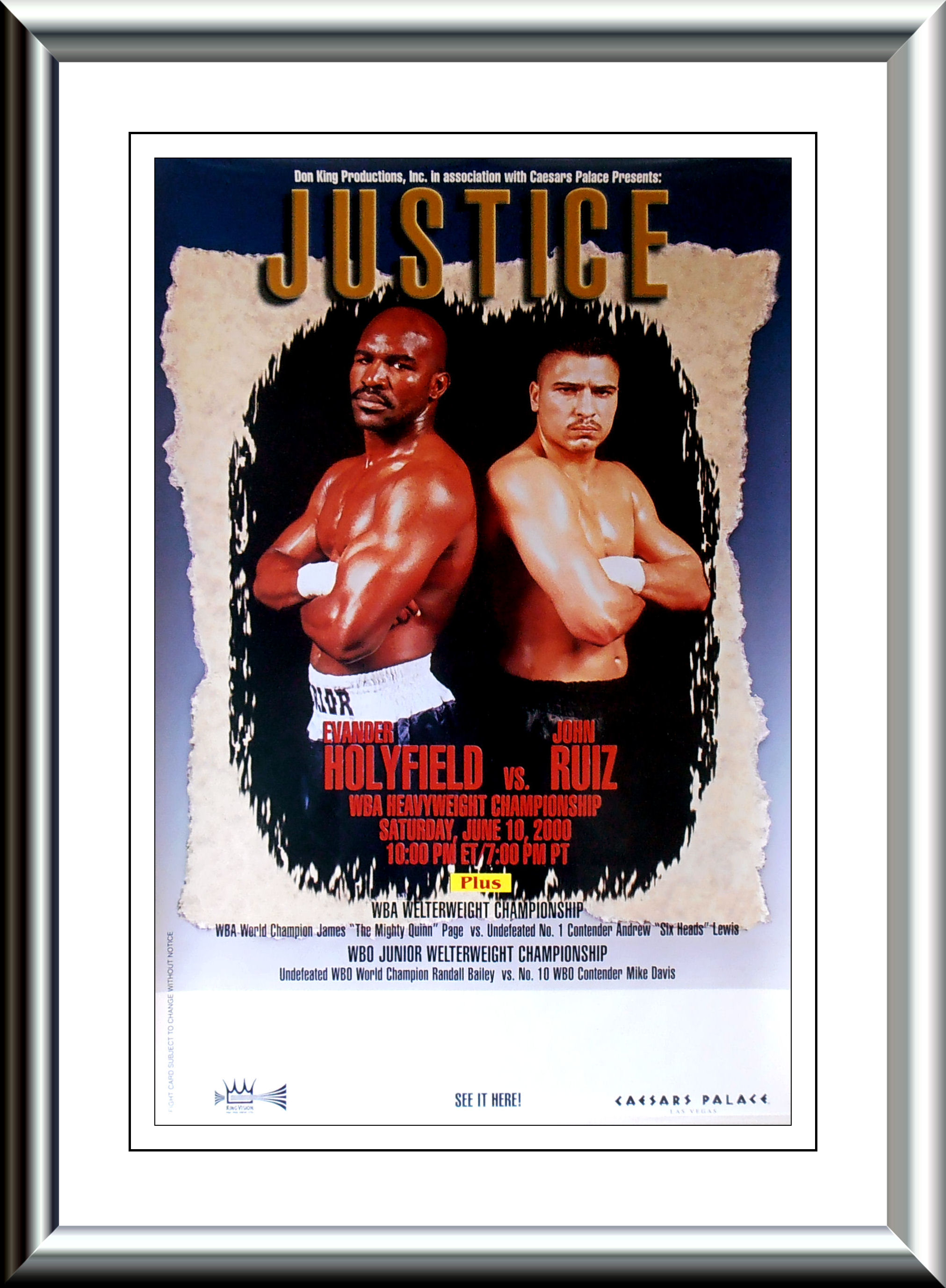 Description : Here we have an original poster from Caesars Palace for the 1st meeting between Evander Holyfield & John (Juan) Ruiz for the WBA Heavyweight Title. This fight was cancelled & rescheduled for the 8th August over the road at the Paris, I attended this fight at the Paris Casino in Las Vegas & not a cheap ticket to be had, considering the fight took place in a ballroom!