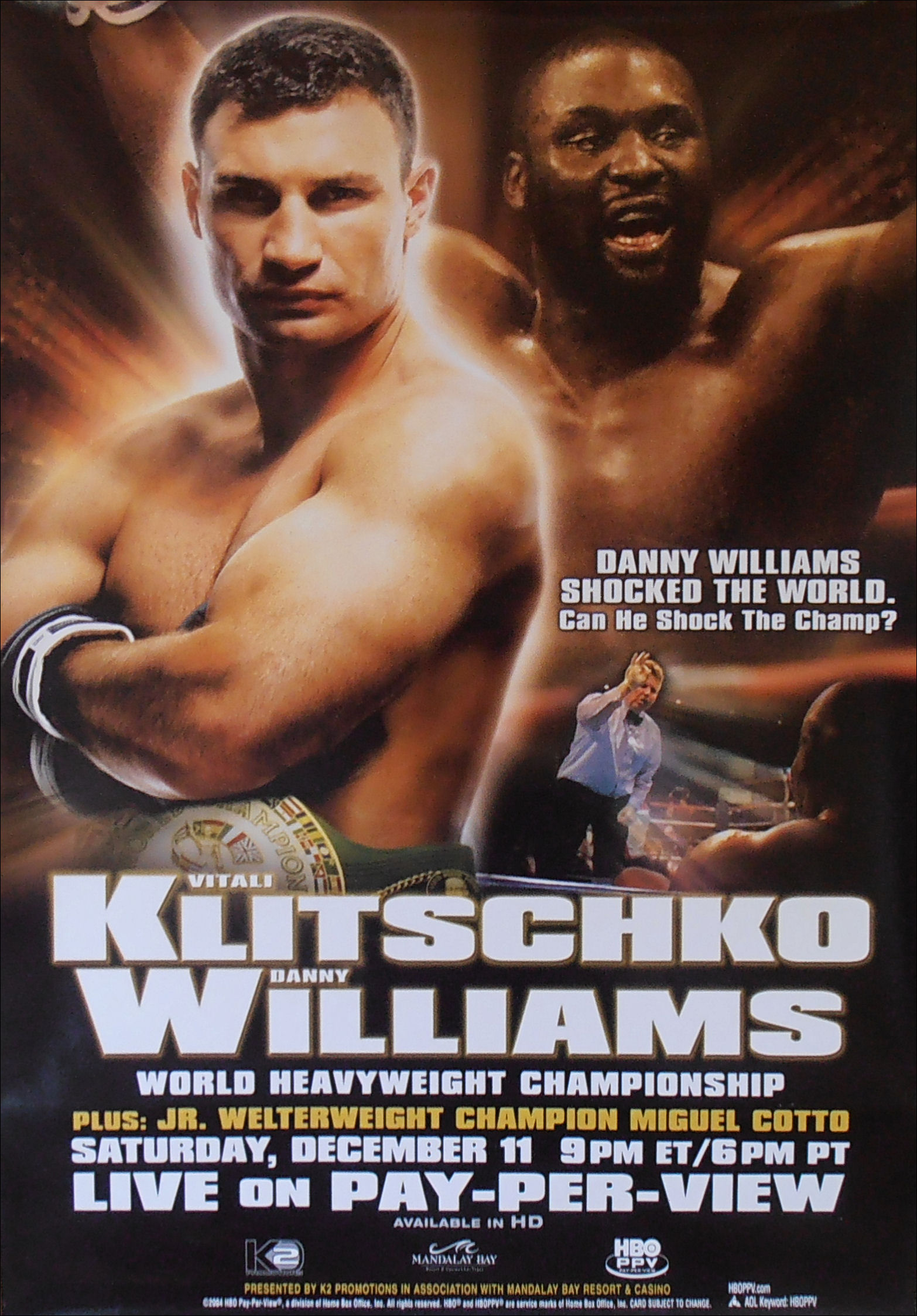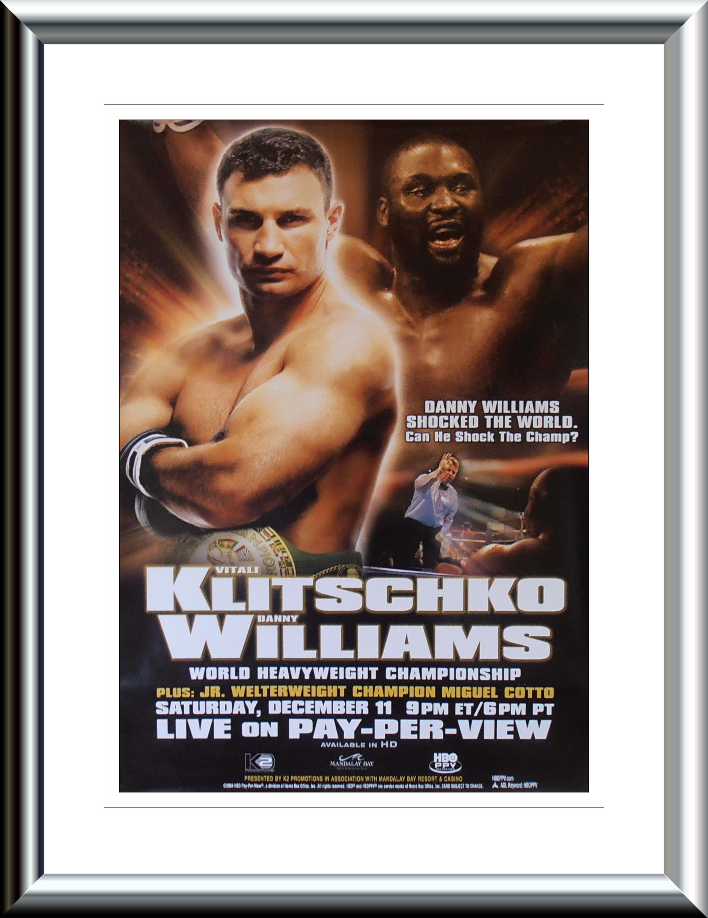 Description : Here we have an original full-size official HBO Boxing pay-per-view closed circuit poster for the WBC world heavyweight title held at the Mandalay Bay Las Vegas between reigning & defending champion Vitali Klitschko & British challenger Danny Williams,11th December 2004.
