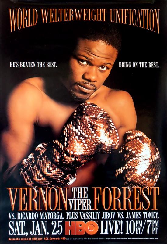 What a shocker! No one saw this coming! Reigning & defending WBC welterweight boss Vernon "The Viper" Forrest was sensationally TKO'd by Nicaraguan Wildman Ricardo Mayorga at 2.06 of the 3rd round. Forrest was knocked down in rounds 1 and 3. A right cross dropped Forrest in the third round. When he got back up his feet, still dazed, Referee Marty Denkin stepped in and stopped the bout to protect him from further punishment. Mayorga won The Ring Magazine Welterweight Championship of the World.