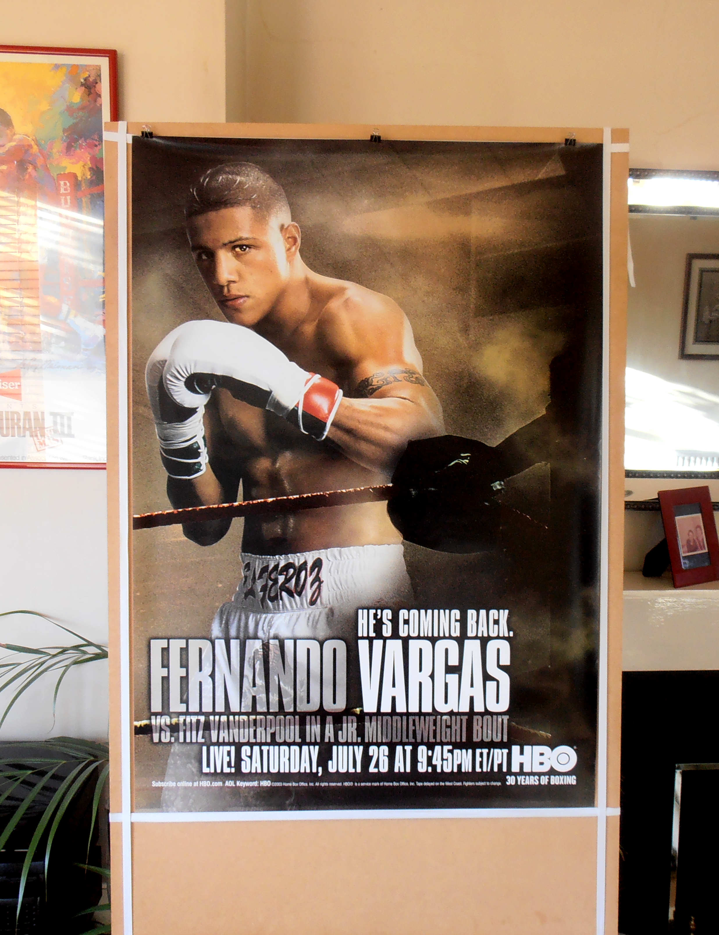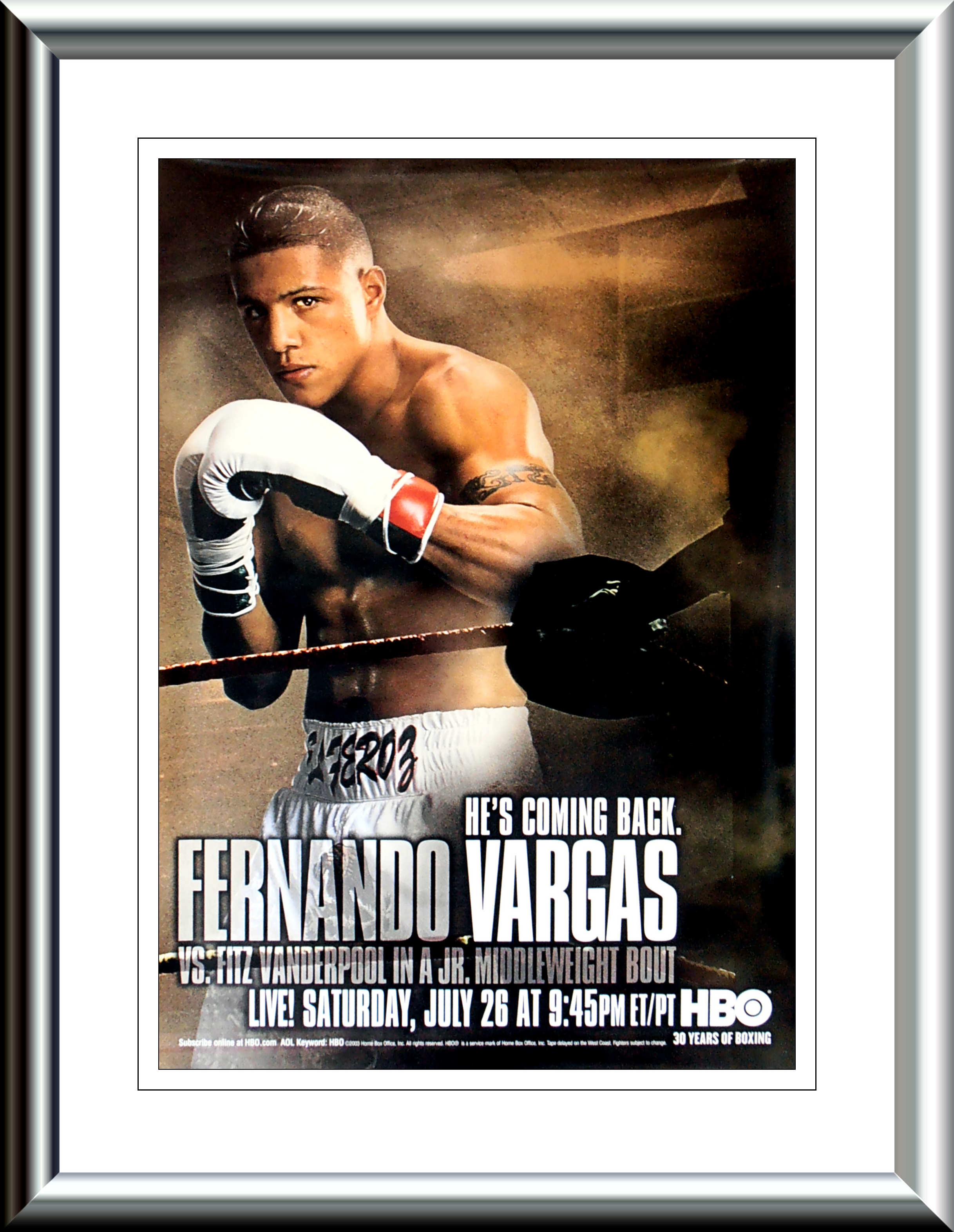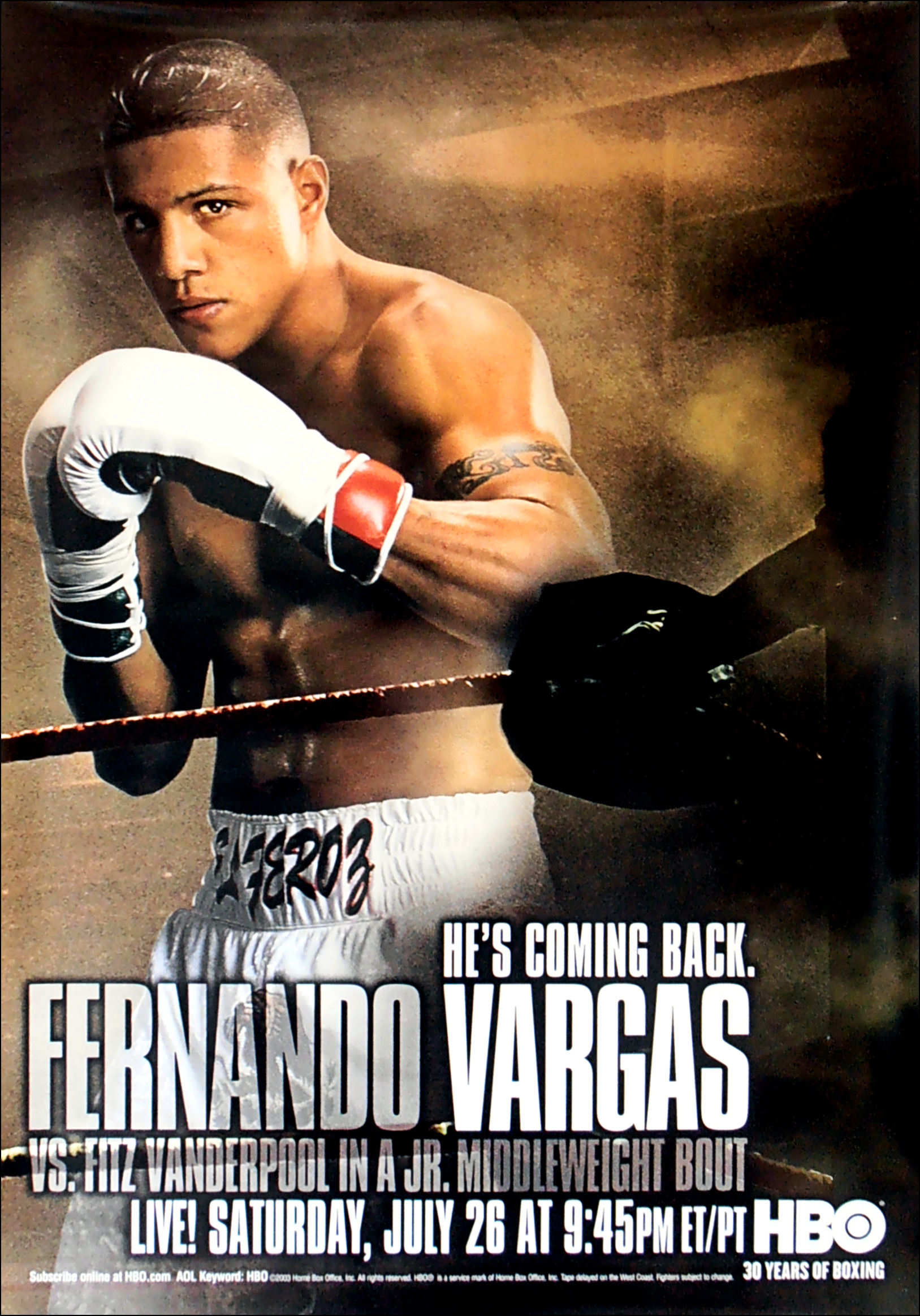 Description : Here we have a fantastic full size original HBO boxing poster from his comeback fight against Fitz Vanderpool after his defeat at the hands of Oscar De La Hoya in their Light/Middleweight unification clash in 2002. After his knockout win over Fitz Vanderpool on July 26, 2003, he stood in a corner and yelled "I love you guys!" to his fans, who had always stuck with him.