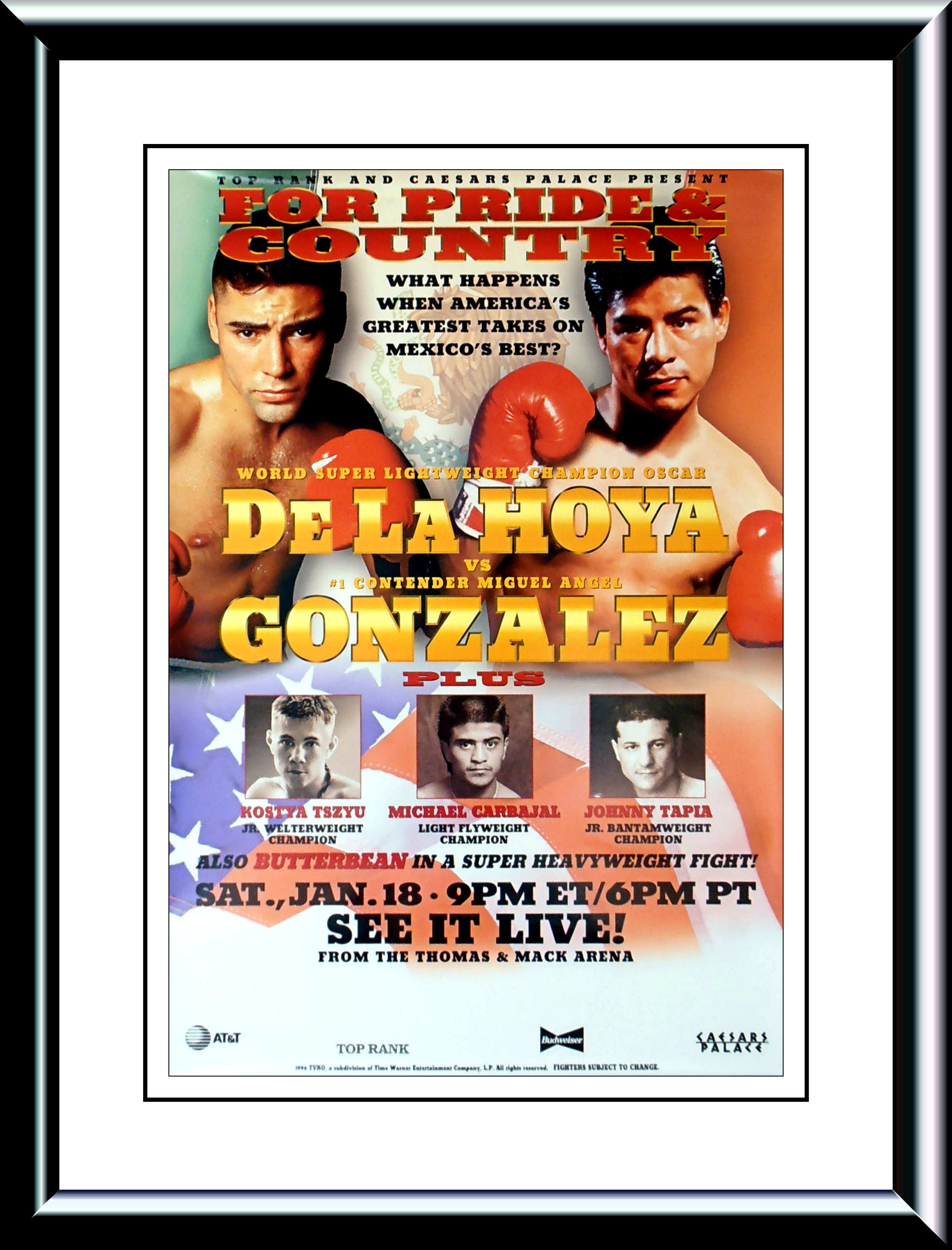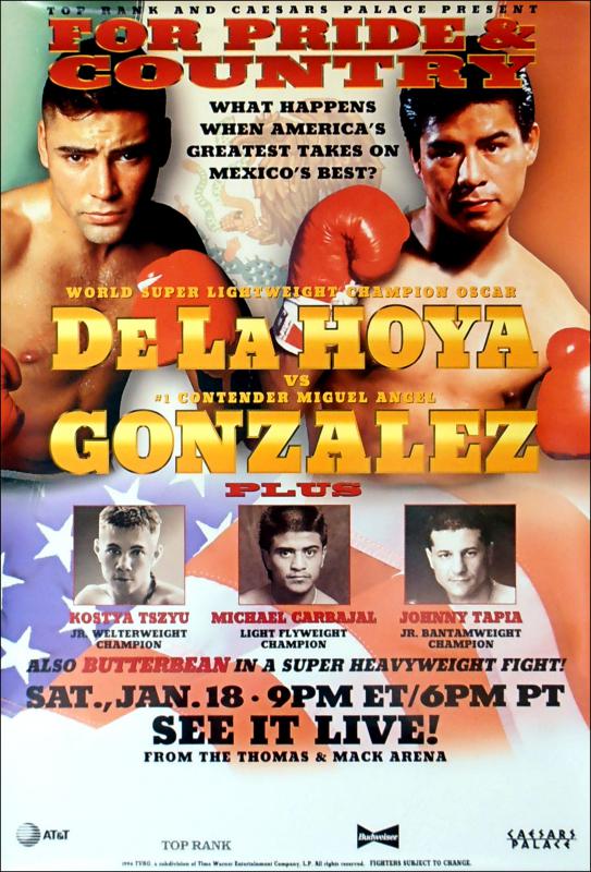 Description : Here we have an original Top Rank Boxing closed circuit poster in association with Caesars Palace Las Vegas the official fight sponsors for the Oscar De La Hoya WBC Light/Welterweight title defence that took place at the Thomas & Mack Centre in Las Vegas.