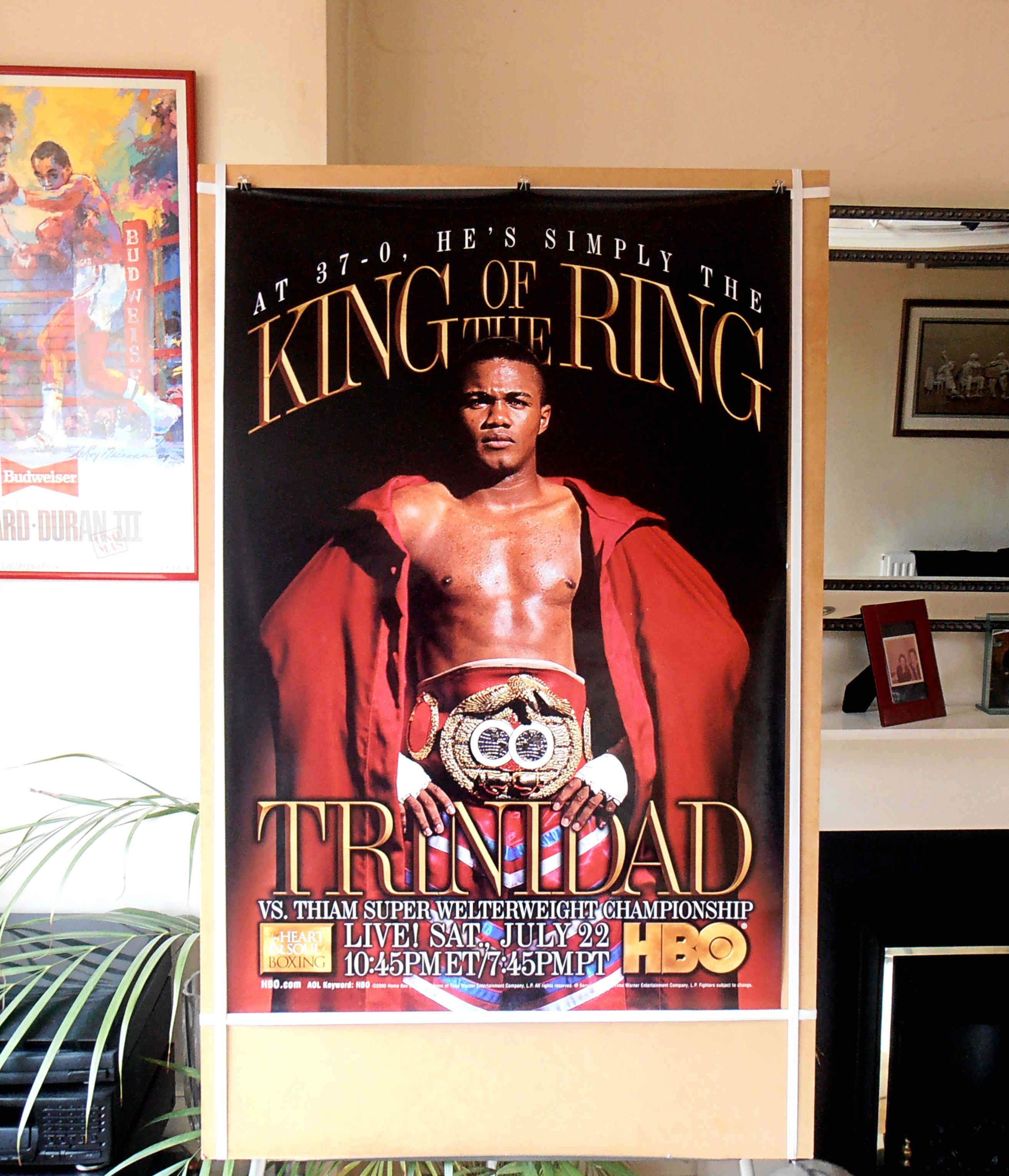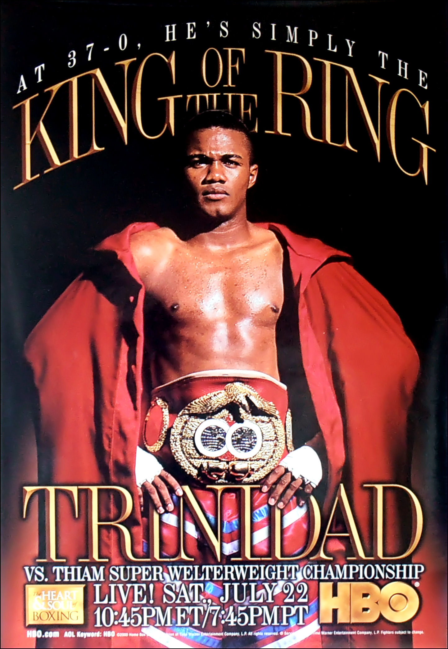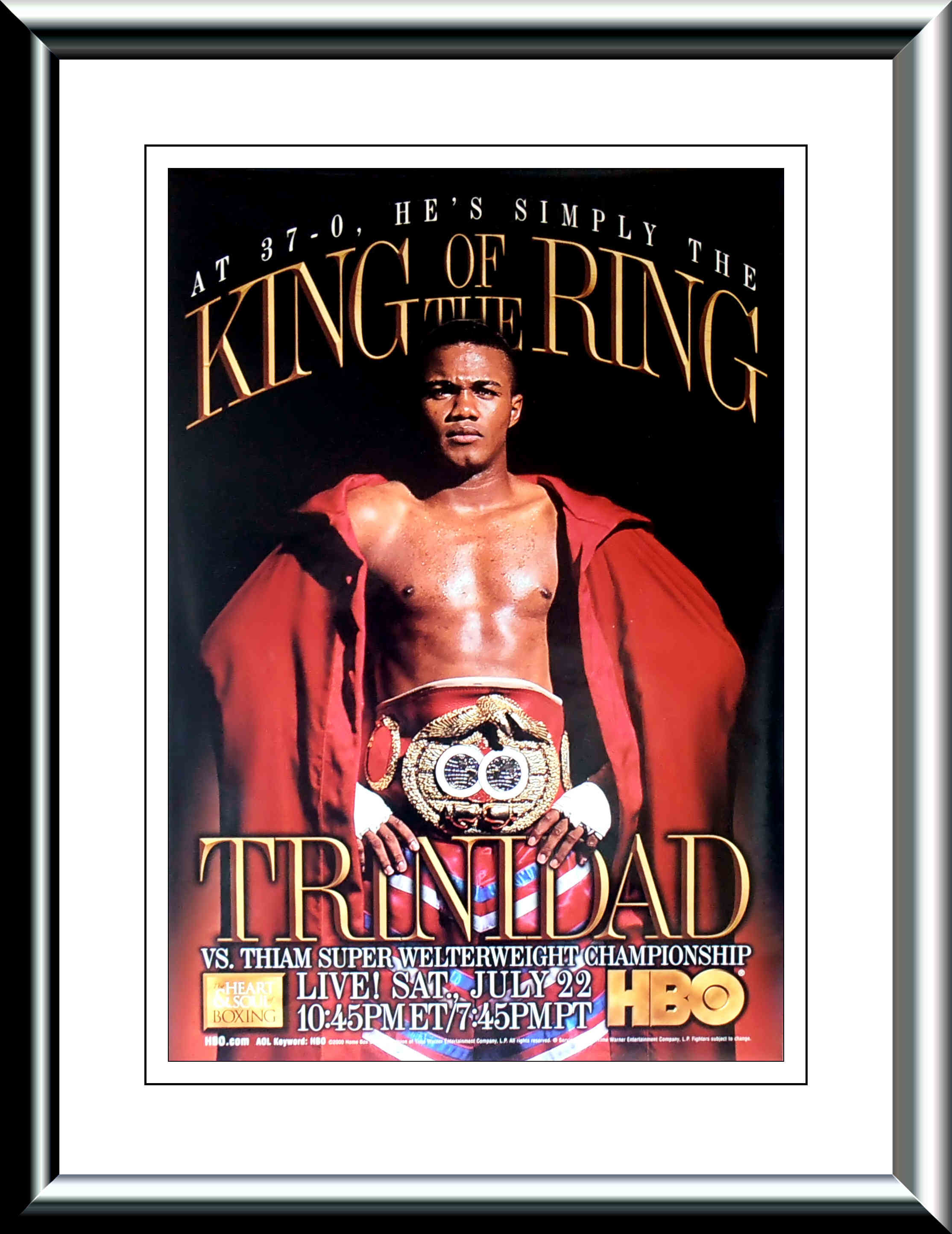 Description : Try finding one of these! Here we have the original full size HBO boxing closed circuit poster for the WBA Super Welterweight Title defense of Felix 'TiTo' Trinidad against challenger Mamadou Thiam held at the American Airlines Arena Miami Florida. Trinidad got down to work quick demolishing the challenger in 3 rounds.