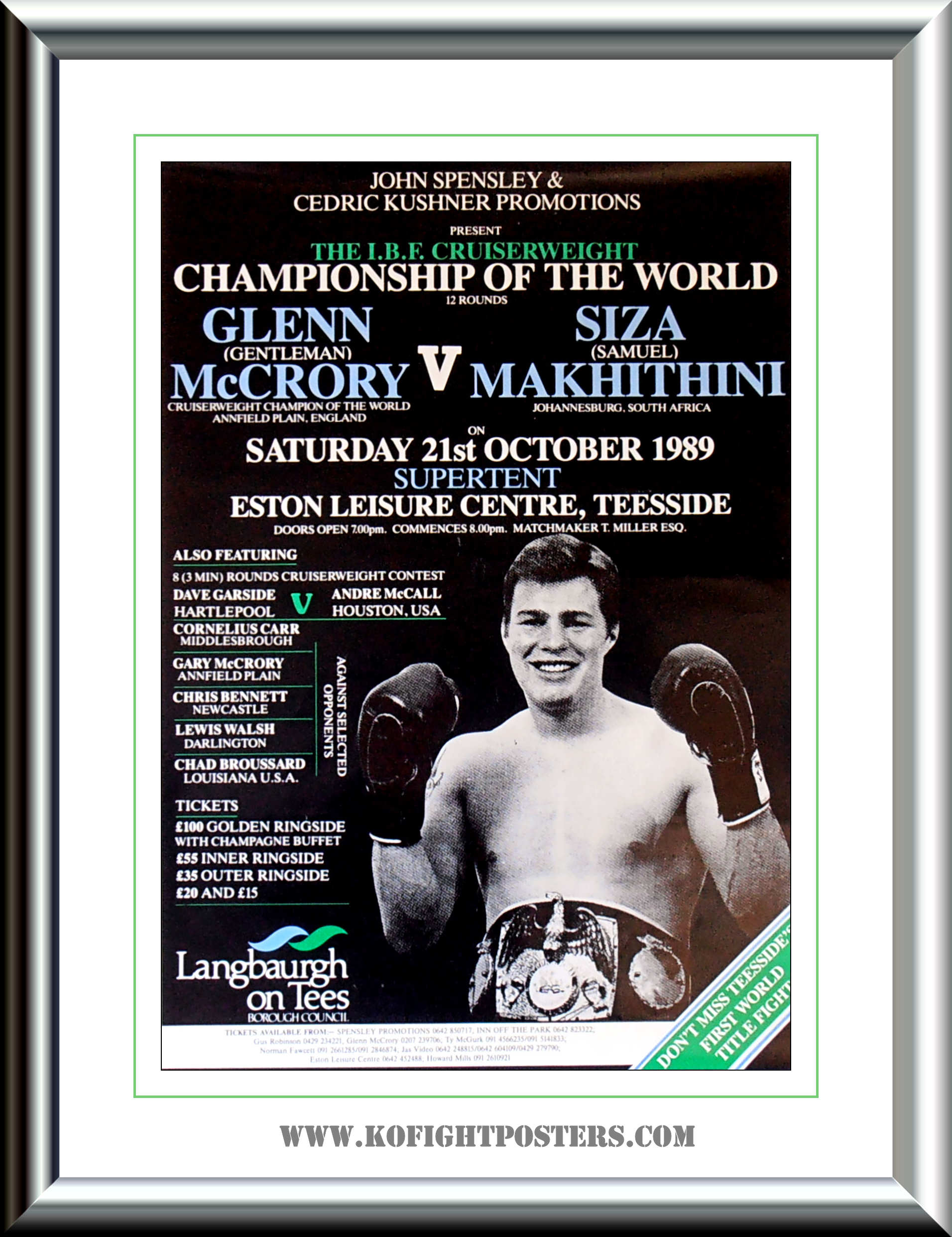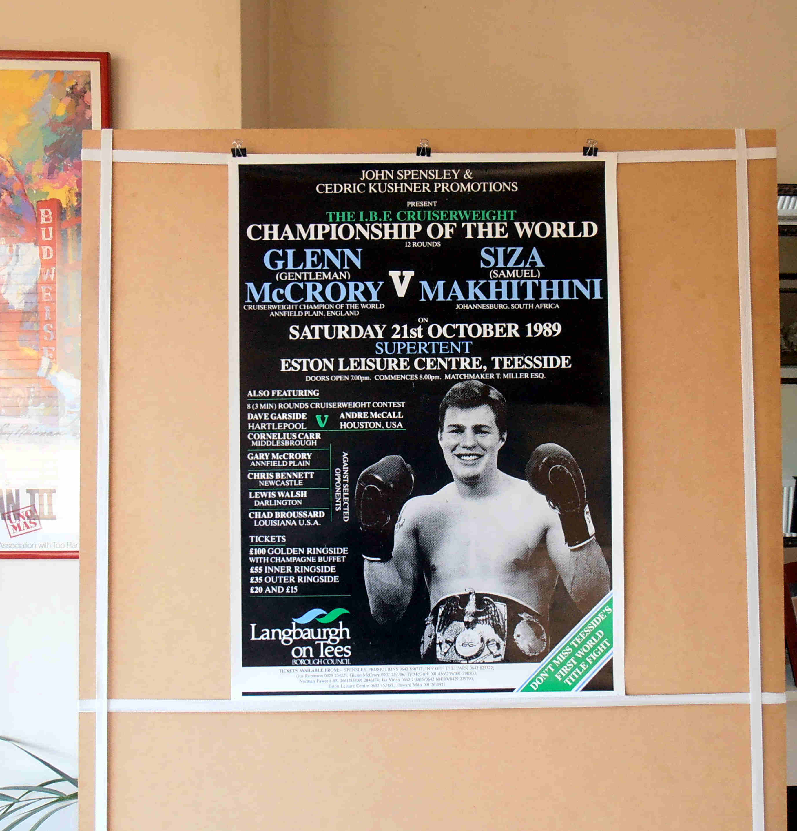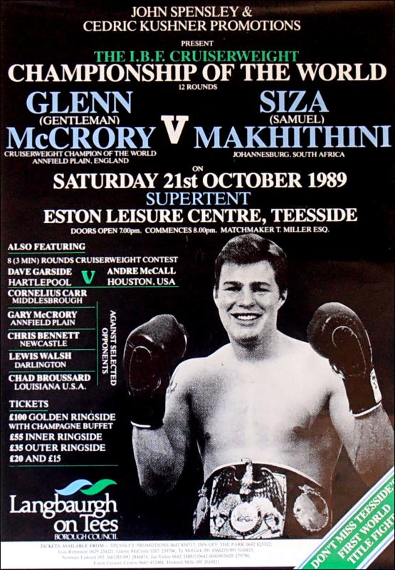 Description : Here we have an original onsite poster for the IBF World Cruiserweight Title defence between reigning & defending champion Glenn McCrory & South African challenger Siza Makhithini. McCrory emerged victorious in his 1st defence of his IBF crown by 11th round TKO, judges had Glenn well in front up till the conclusion 1 minute 7 seconds of 11th round | judge: Chris Wollesen 118-110 | judge: Bernie Friedkin 116-111 | judge: Mike Glienna 118-111.