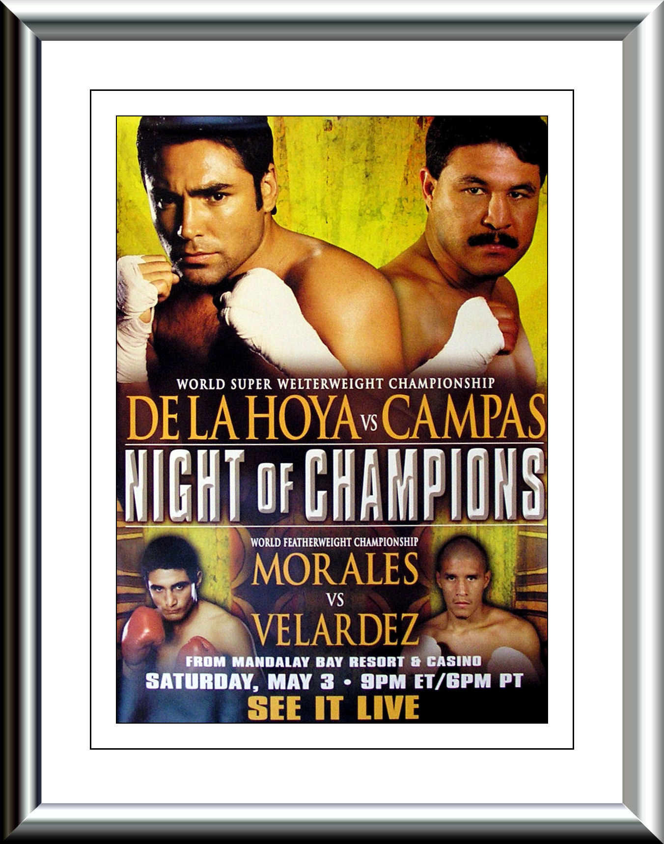 Description : Here we have an original Mandalay Bay Las Vegas closed circuit poster for the Oscar De La Hoya Super/Welterweight title defence at the Mandalay Bay Las Vegas. Also on the bill was Eric Morales defending his WBC featherweight Title against Fernando Veladez. Oscar De la Hoya stopped Yori Boy Campas in 7 rounds so setting up the long awaited rematch with Sugar Shane Mosley.