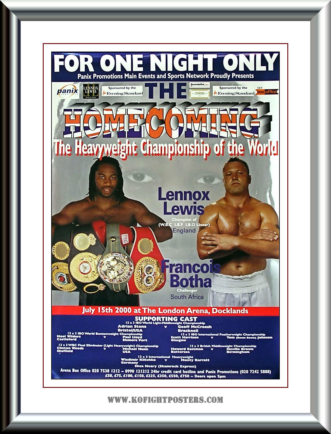 Description : Here we have an original Sportsnetwork main event poster for the for the WBC, IBF, IBO and Lineal Heavyweight Championships between reigning & defending heavyweight champion of the world,Lennox Lewis vs. Francois Botha, billed as "The Homecoming", on July 15, 2000 at the London Docklands Arena.