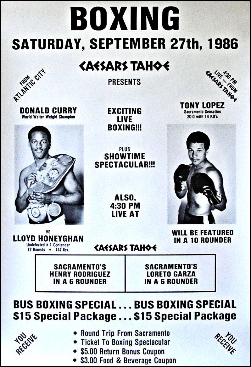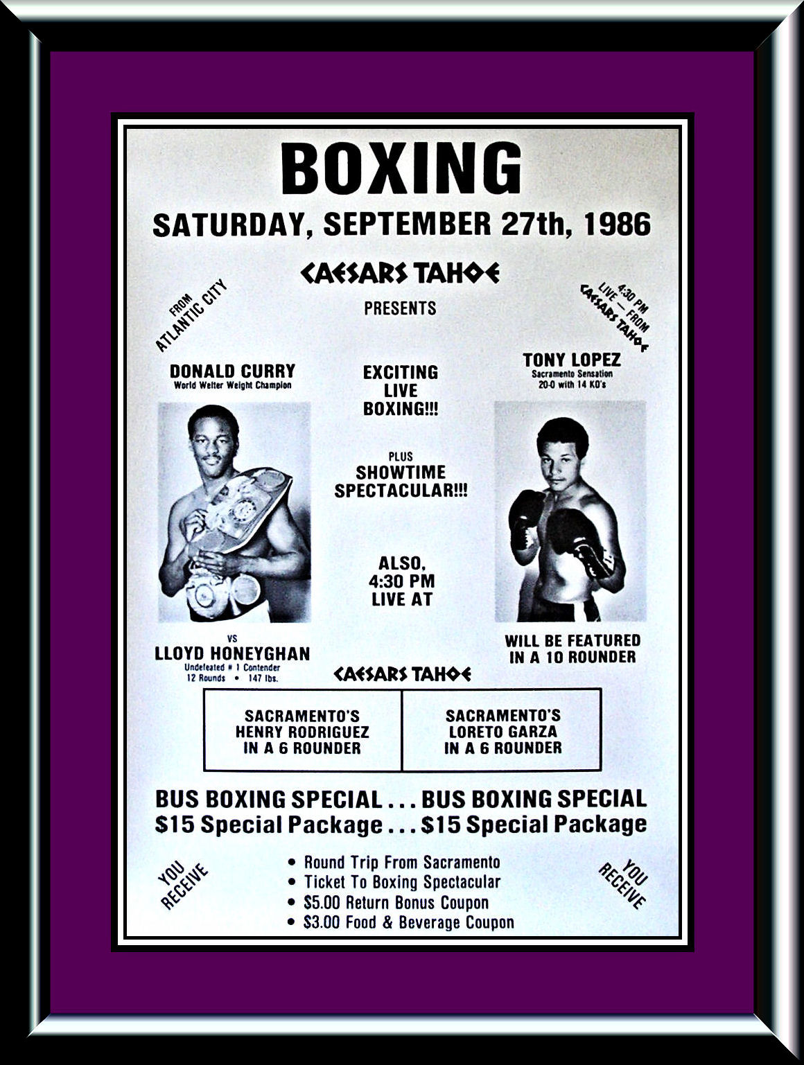 Description : Here we have an original closed circuit poster from Caesars Casino resort, Lake Tahoe Nevada. This has to be the greatest victory overseas by any British boxer, an absolute incredible performance by Lloyd Honeyghan. At the time Don Curry was considered one of the best pound for pound fighters in the world and Honeyghan was given little chance by the majority of the media. He caused a major upset by dominating the fight, nearly dropping Curry in the second round, before a battered, bruised & shell shocked Curry retired on his stool at the end of the six round. Before the fight Curry had himself dismissed his unknown foreign opponent, asking "Who is this ragamuffin?". Honeyghan thereafter adopted the title "ragamuffin" or "Ragamuffin Man" with relish. This is the only poster we have ever seen from this fight! I don't know if an onsite was produced, such was the opinion that this fight was just a time killer for Curry, well what a shock he & his team got when Lloyd started to dismantle the invincible Curry!