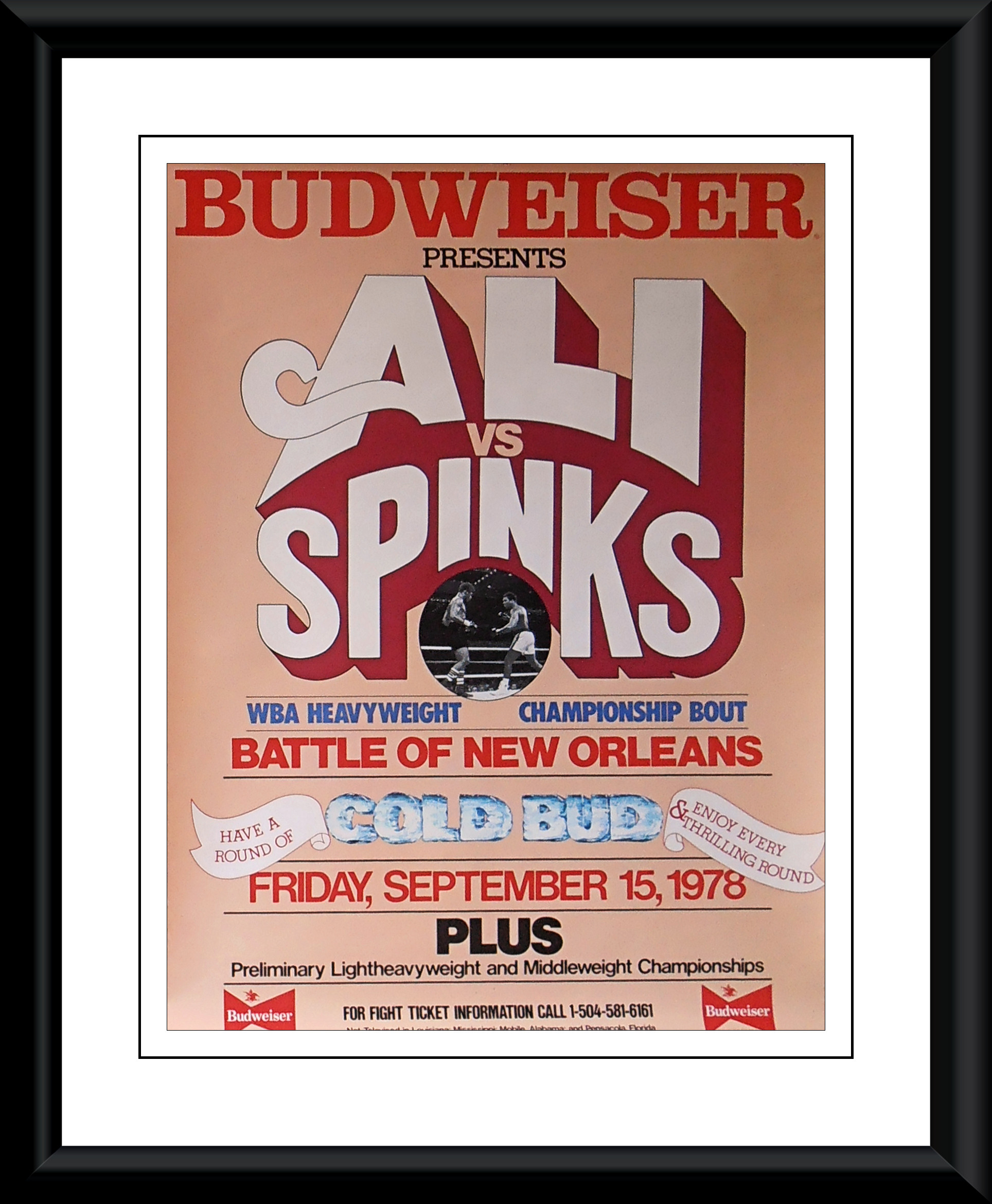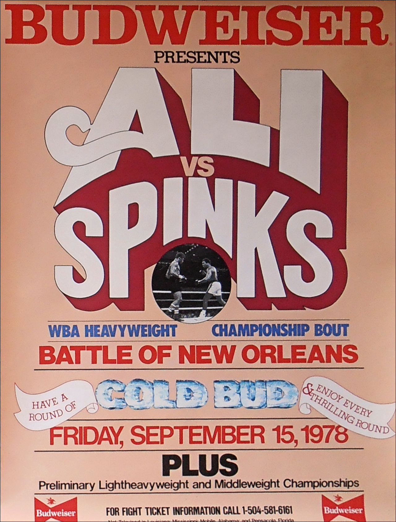 Description : Here we have a super rare original vintage Official fight sponsors on site poster for the super-fight rematch held on September 15th 1978 at the New Orleans Superdome for the WBA World Heavyweight Championship.