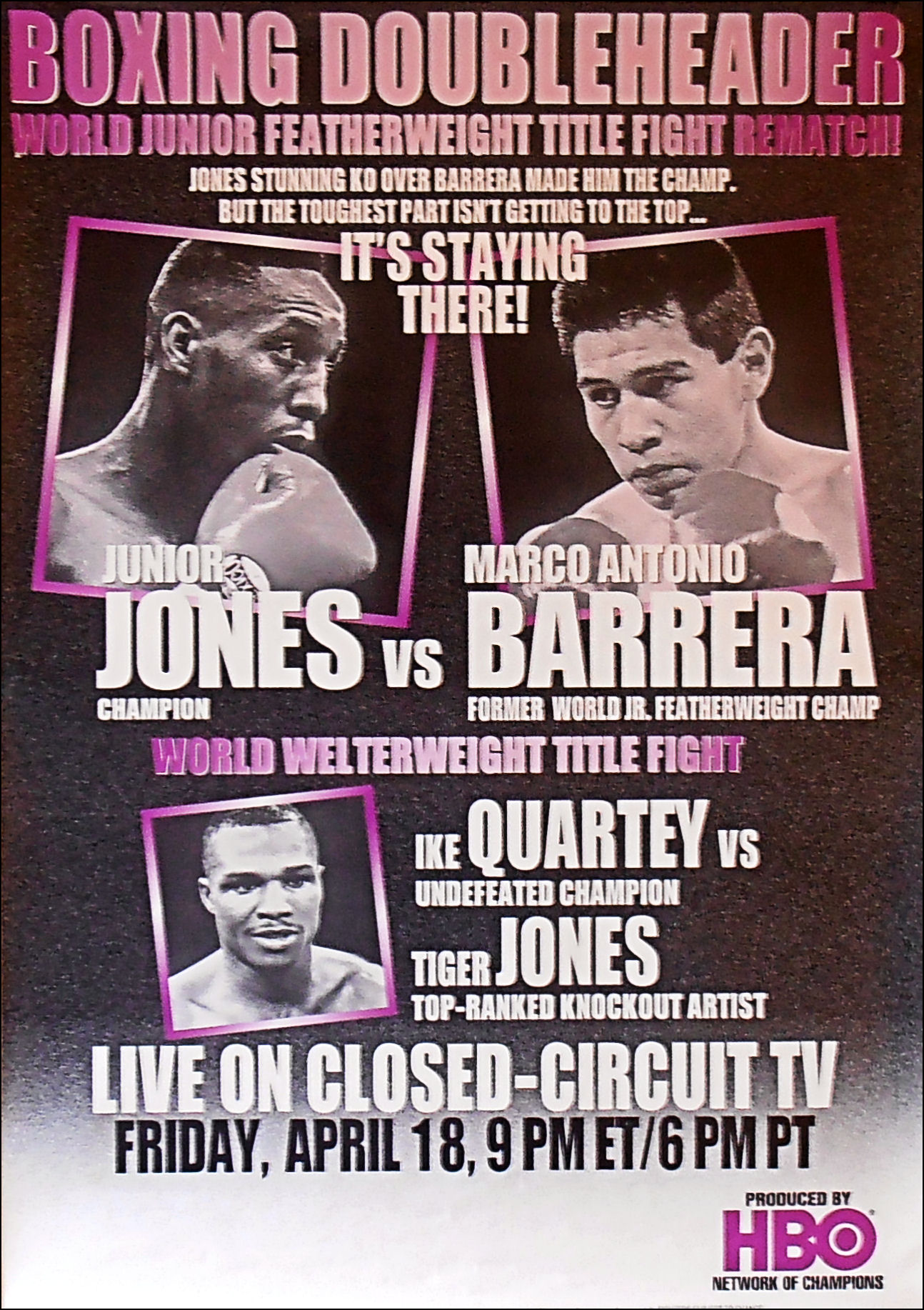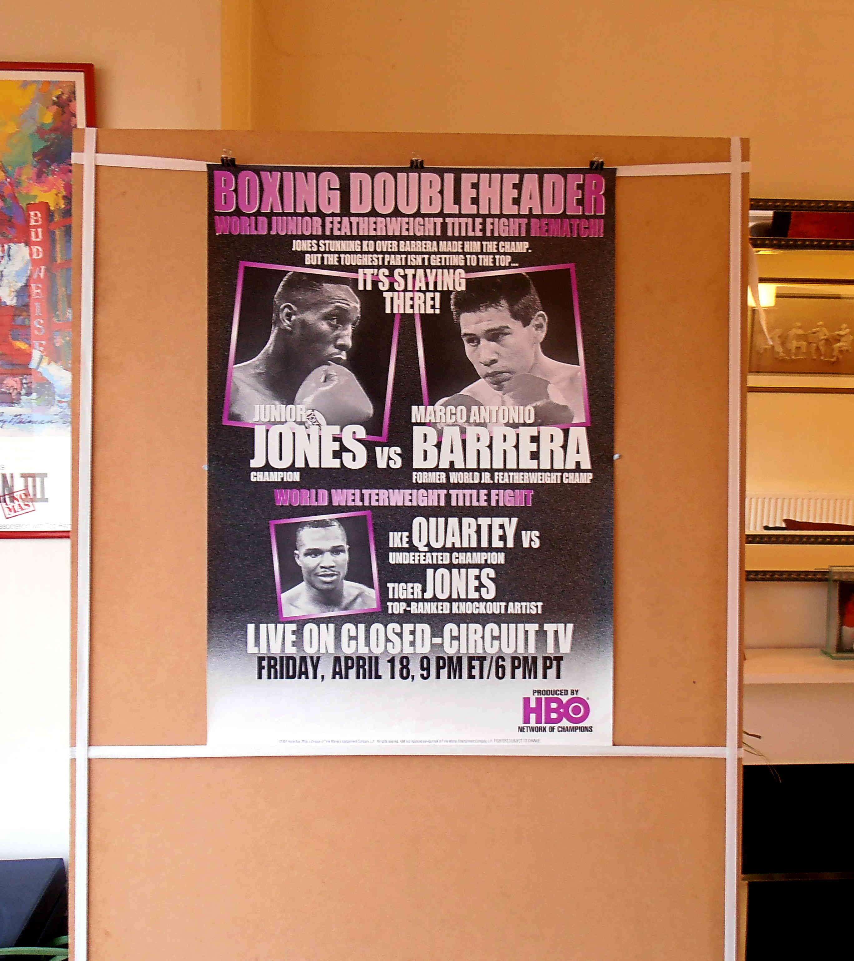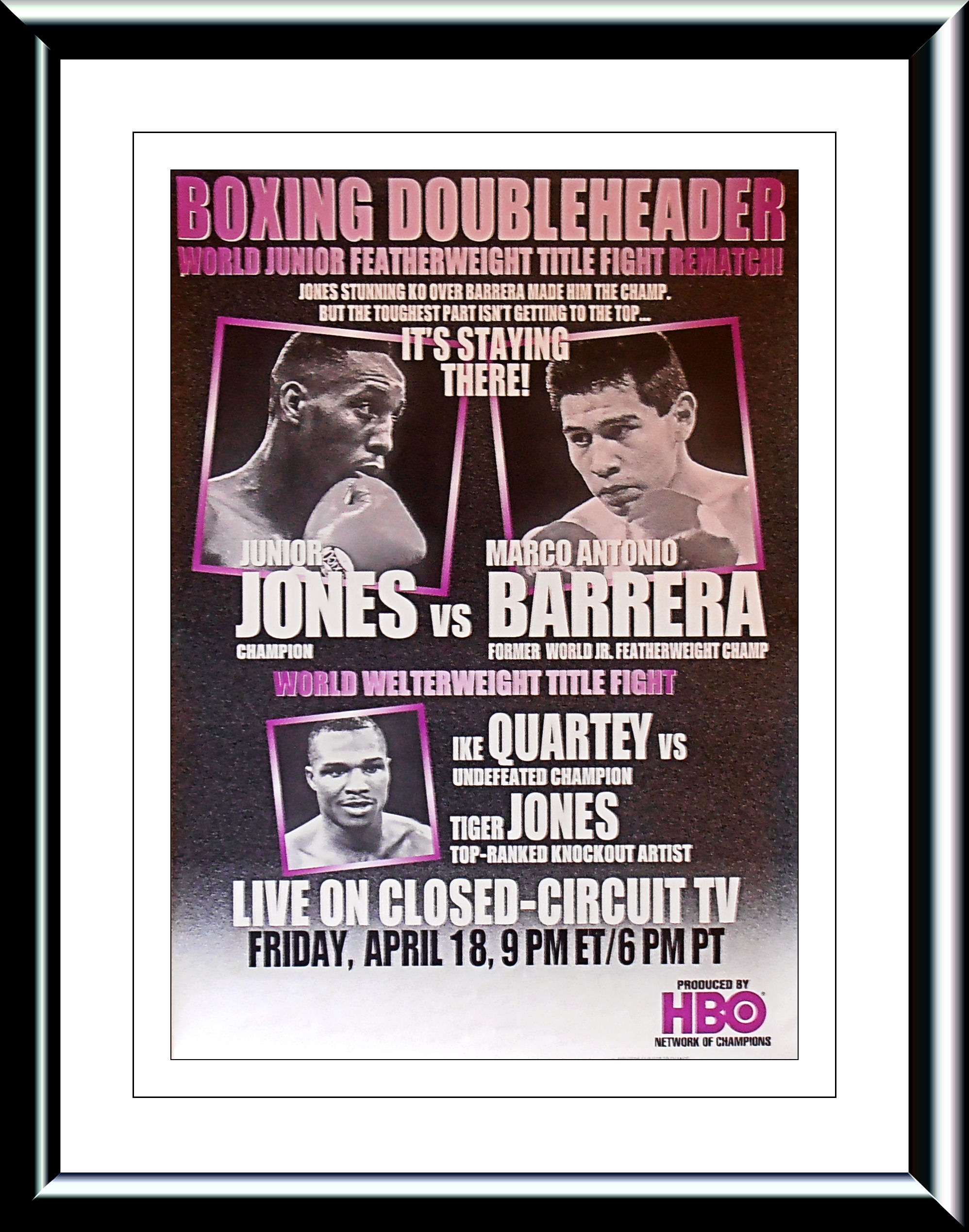 Description : Here we have an original HBO boxing closed circuit poster for the April 17th 1997 rematch........ On November 22, 1996, Marco Antonio Barrera suffered his first career loss and lost his title to American boxer Junior Jones, by a disqualification in round five. Barrera was knocked down in Round 5 by Jones, and was declared the loser by disqualification and not by knockout because Barrera's cornerman climbed onto the ring to stop the fight as Jones was finishing Barrera.......On April 18, 1997, he was given a chance to regain his title, facing Jones in a rematch in Las Vegas. Barrera was defeated by a unanimous decision that pro-Barrera boxing fans thought was controversial. Even great champions have their Nemesis, just as Muhammad Ali had his Ken Norton, Barrera had his Junior Jones.
