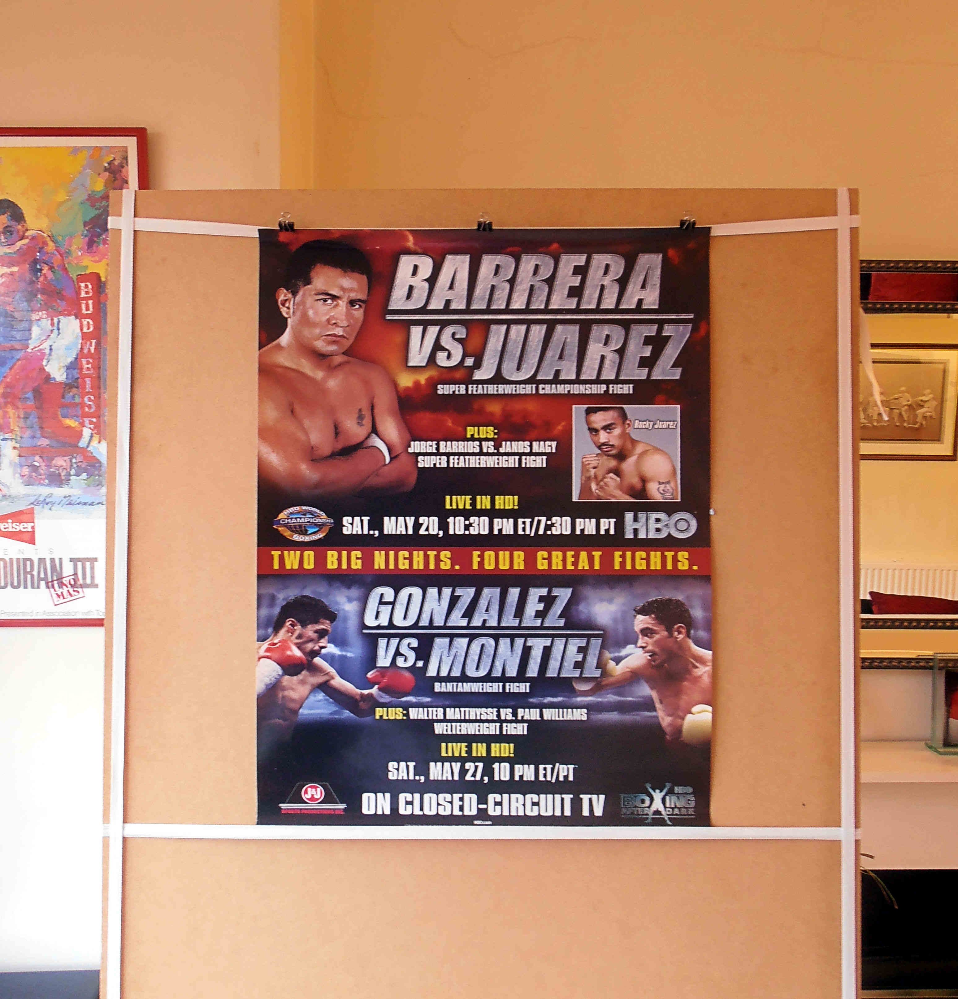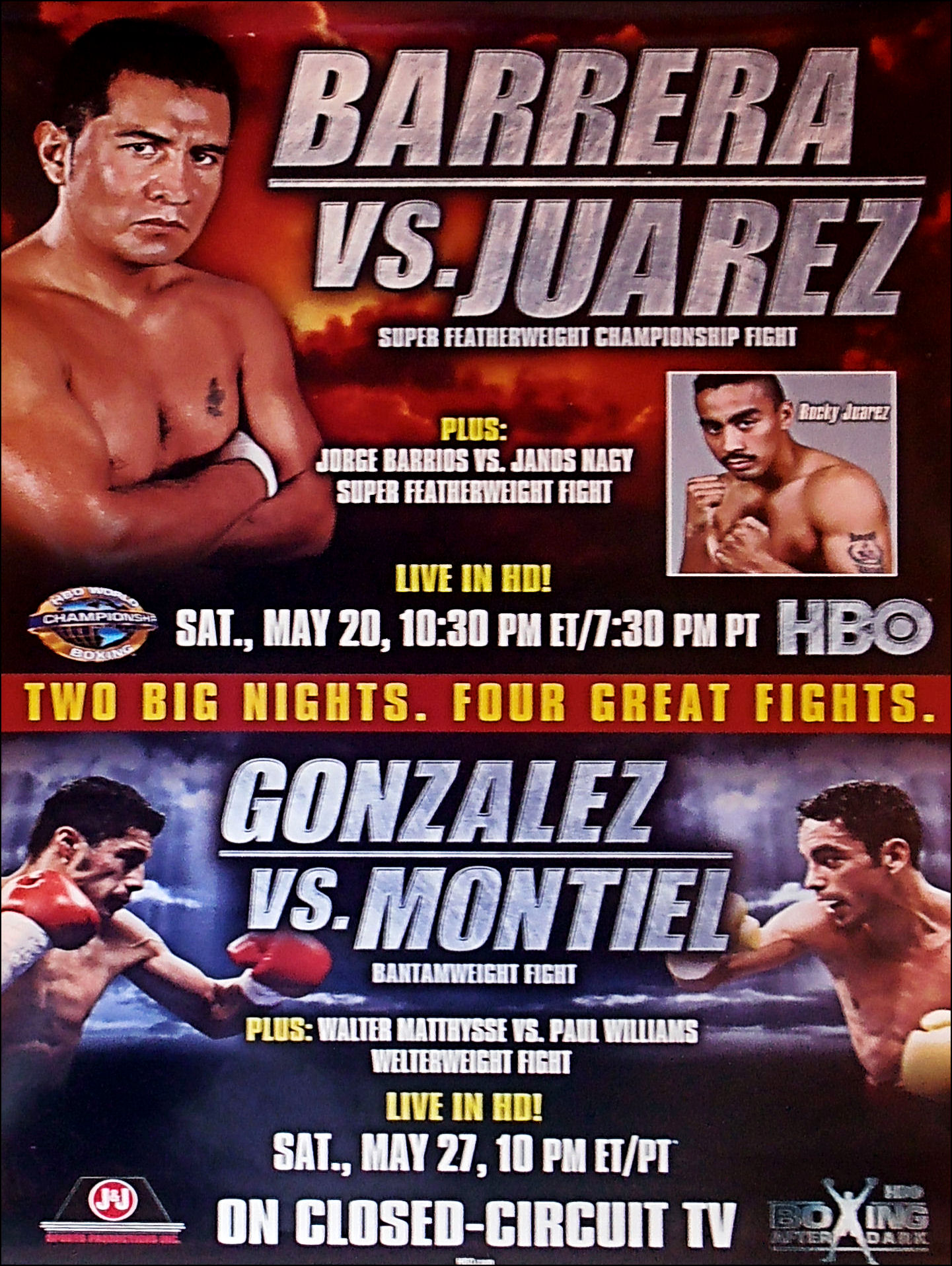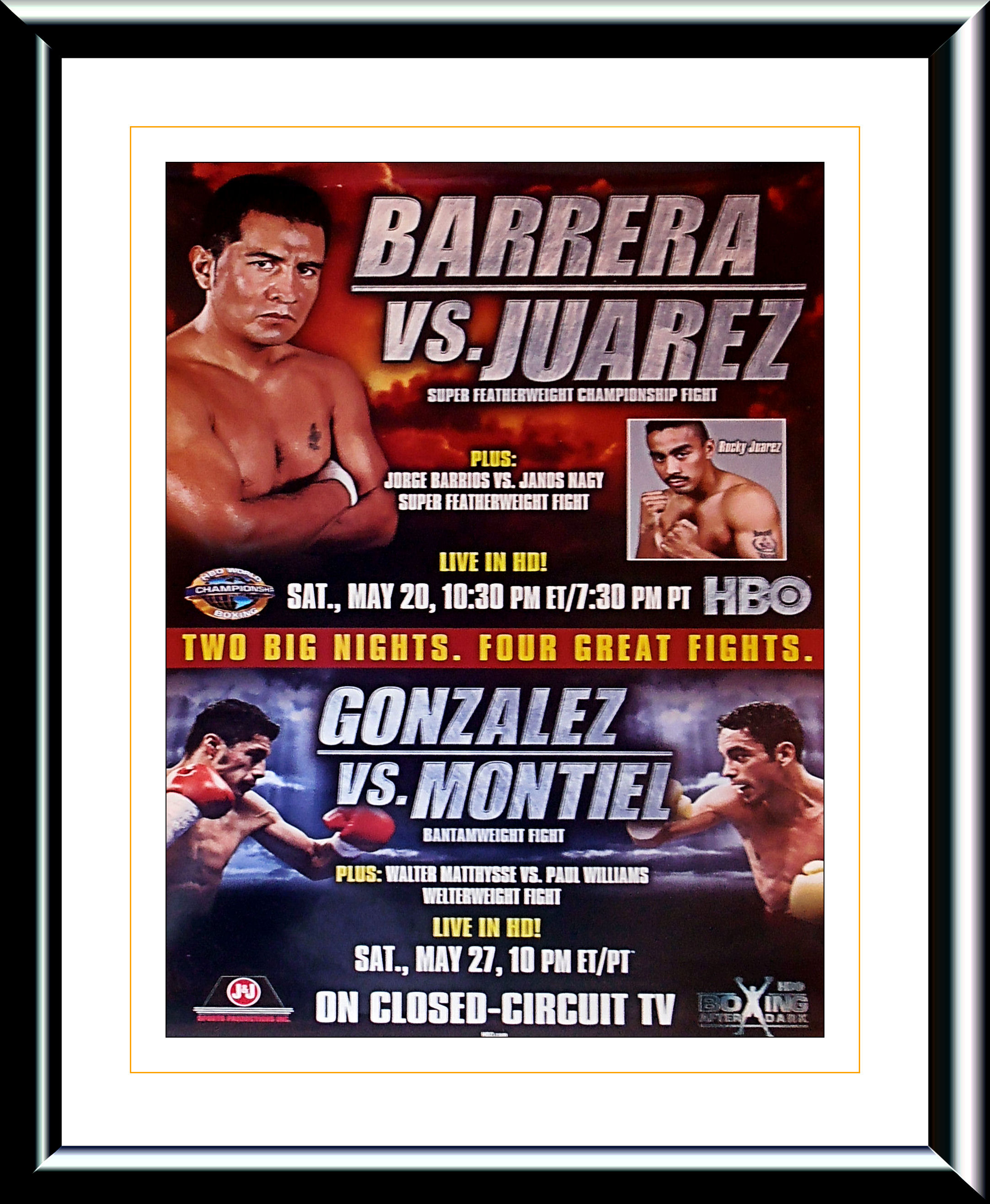 Description : Here we have an original HBO Boxing closed circuit fight poster..... On May 20, 2006, Barrera defended his title against American boxer Rocky Juarez, this was a tough hard battle for Barrera, He had to dig deep to overcome his granite hard Juarez. The fight was announced as a twelve-round draw, which the judges scored 115-113, 113-115 and 114-114. However, tabulation errors were found in the judges' scorecards, leading to a final score of 115-114, 114-115 and 115-114, a split decision in favor of Barerra. He fought Juarez in a rematch bout on September 16, this time Barrera won by a unanimous decision with scores of (117-111, 115-113, 115-113). Rocky Juarez has been one of those unfortunate cursed fighters to have been around when the division was stacked with top quality champions & contenders, till this day he has been on the short end of 6 championship attempts.