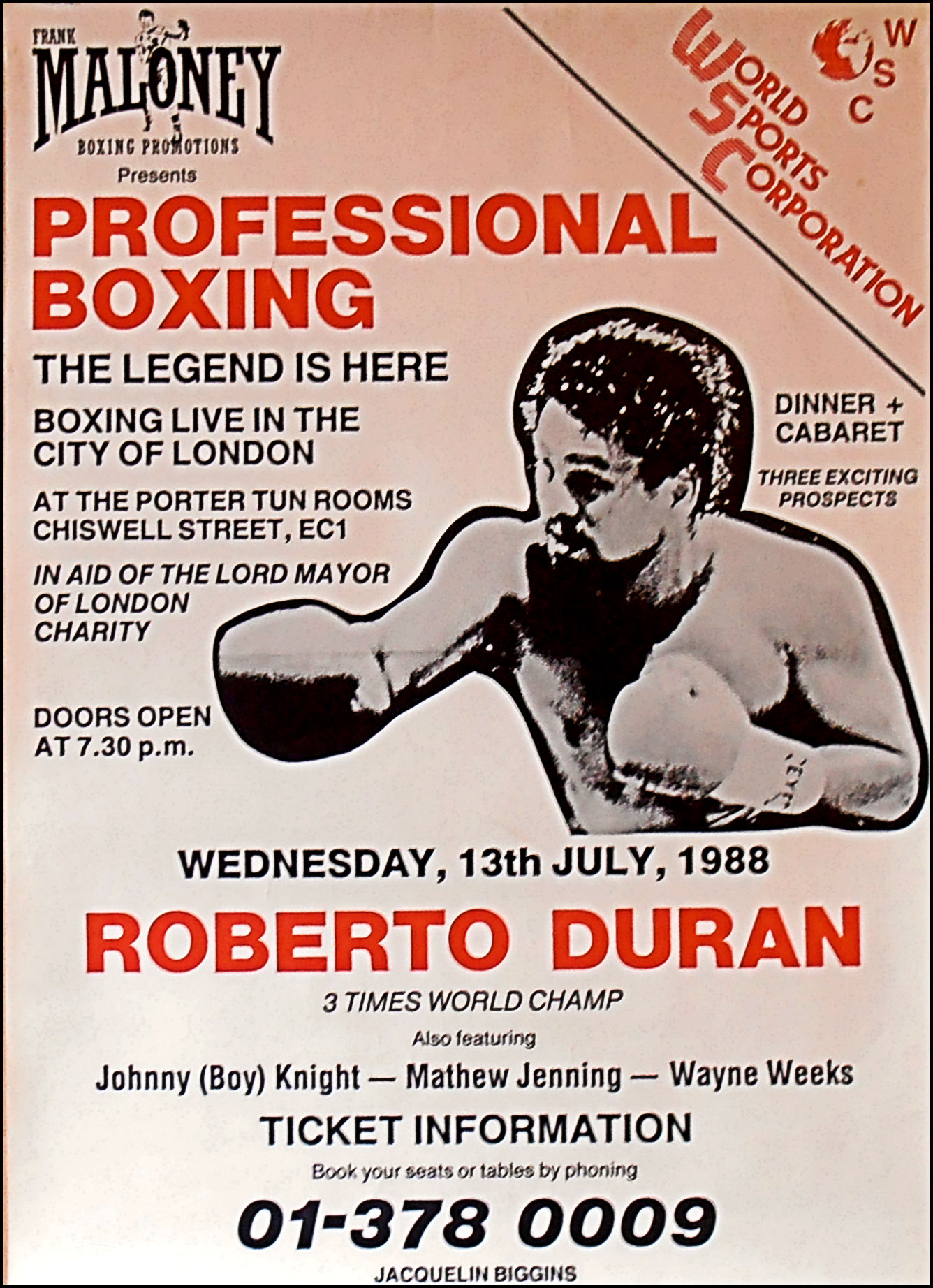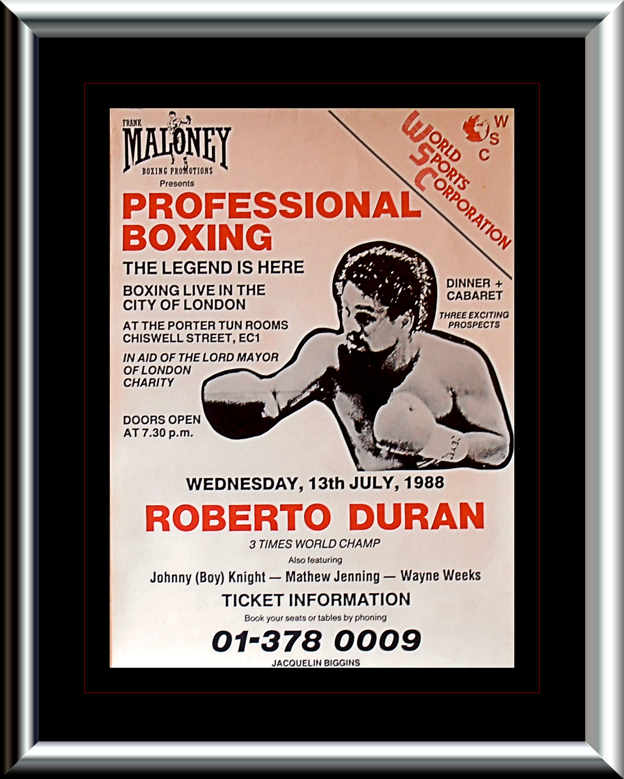 Description : Here we have a super rare poster from 1988 when DURAN the GREAT visited England for the 1st time at the behest of Frank Maloney the London boxing promoter. The visit caused a frenzy of excitement as legions of duranimal fanatics packed out every square inch of space at the venue the living legend visited. Roberto was stunned by the level of support & adulation shown to him from the fanatical turn out as disciples from all over the UK & Europe descended in the hope of even a glimpse of one of the greatest fighters that has ever lived.