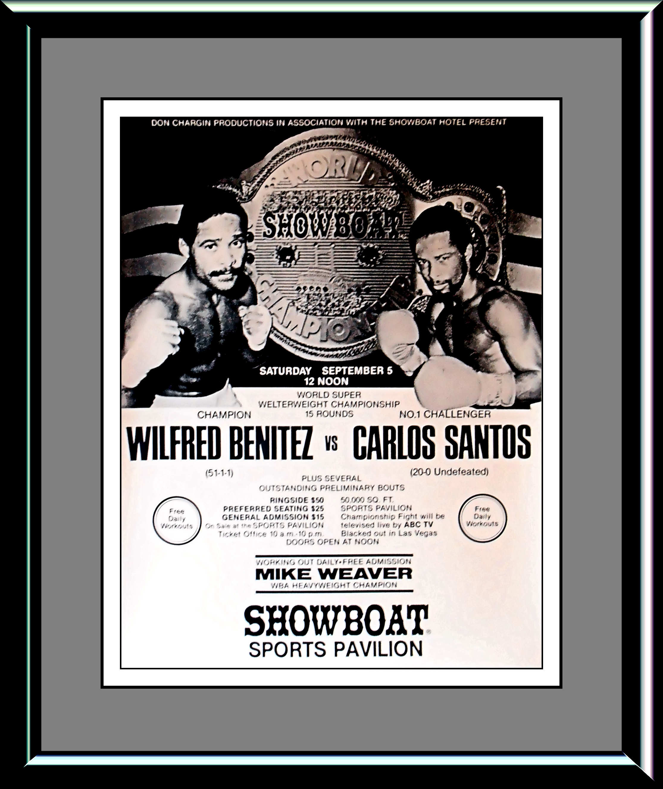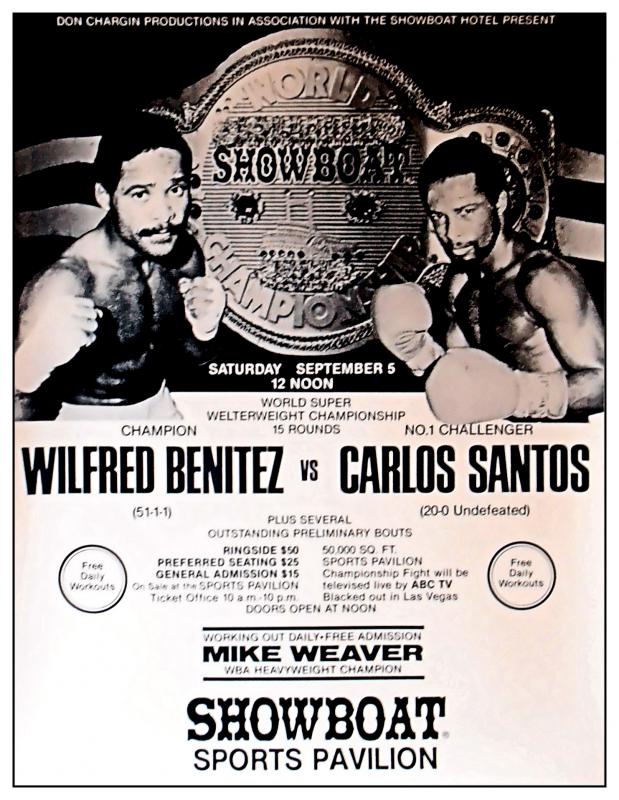 After winning the 154LB title in devastating fashion against Englans Maurice Hope, his next fight became a historic bout. On November 14, 1981, he fought future world champ Carlos Santos of Ceiba, Puerto Rico. It was the first world championship fight between two Puerto Ricans in boxing history. Ironically, the fight was fought 3,000 miles away from Puerto Rico, at the 'Showboat Casino in Las Vegas. Benitez successfully defended his crown winning by unanimous decision, judges scores are as follows: | judge: Paul Smith 147-138 | judge: Hal Miller 145-140 | judge: Dave Moretti 145-139
