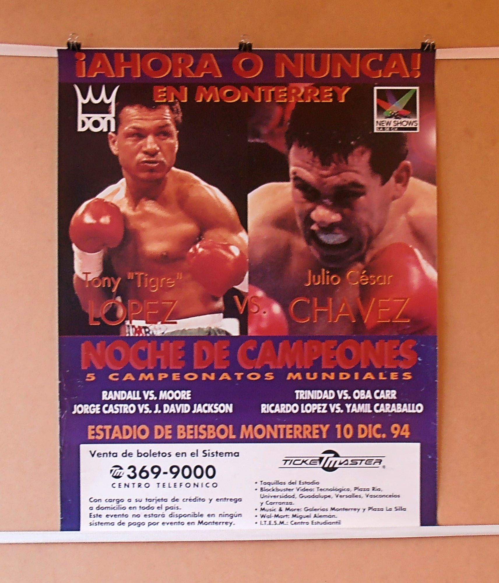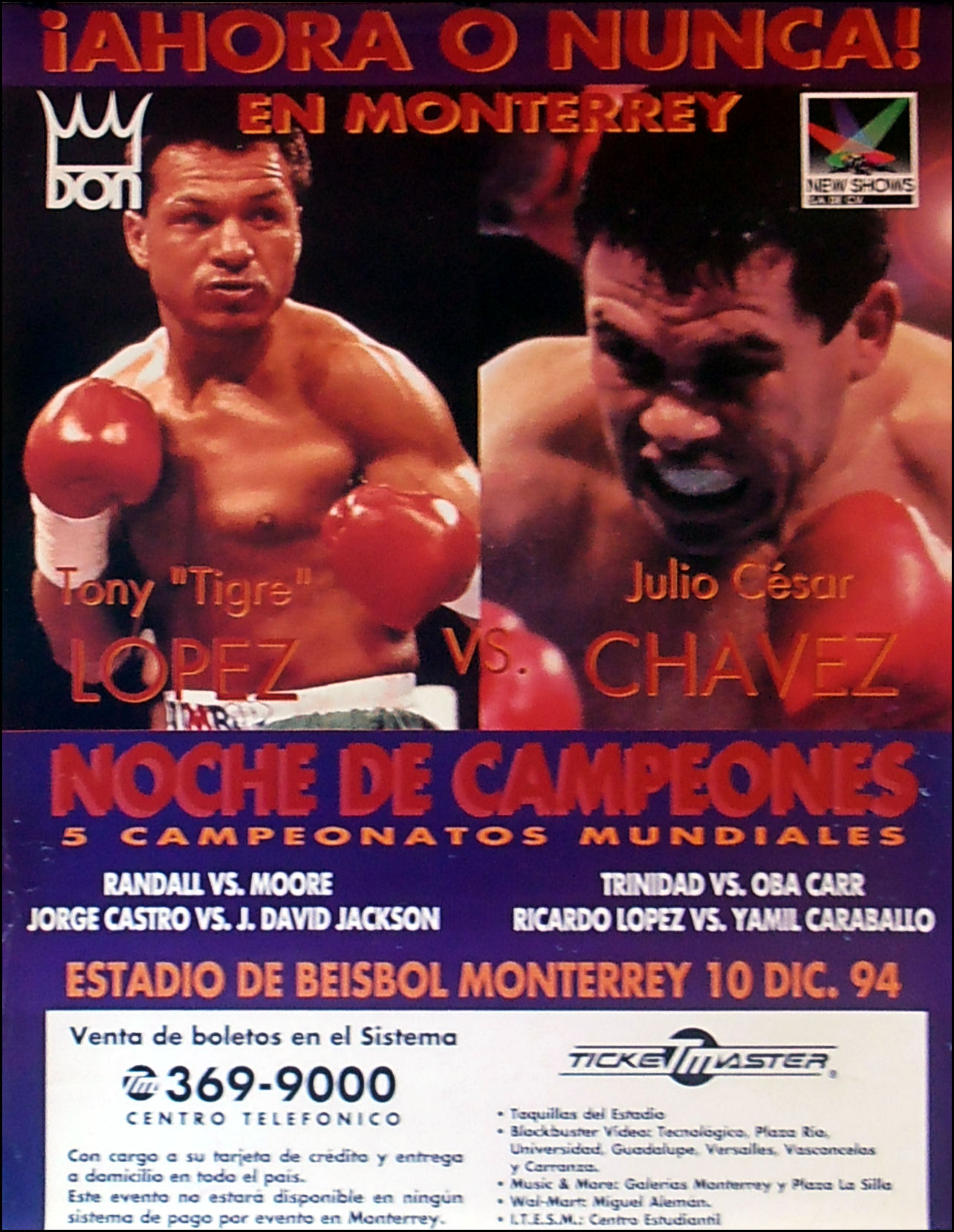 Description : Here we have an official Don King Promotions main event poster for the WBC World Light/Welterweight Championship battle held at Estadio de Beisbol, Monterrey, Nuevo Len, Mexico.