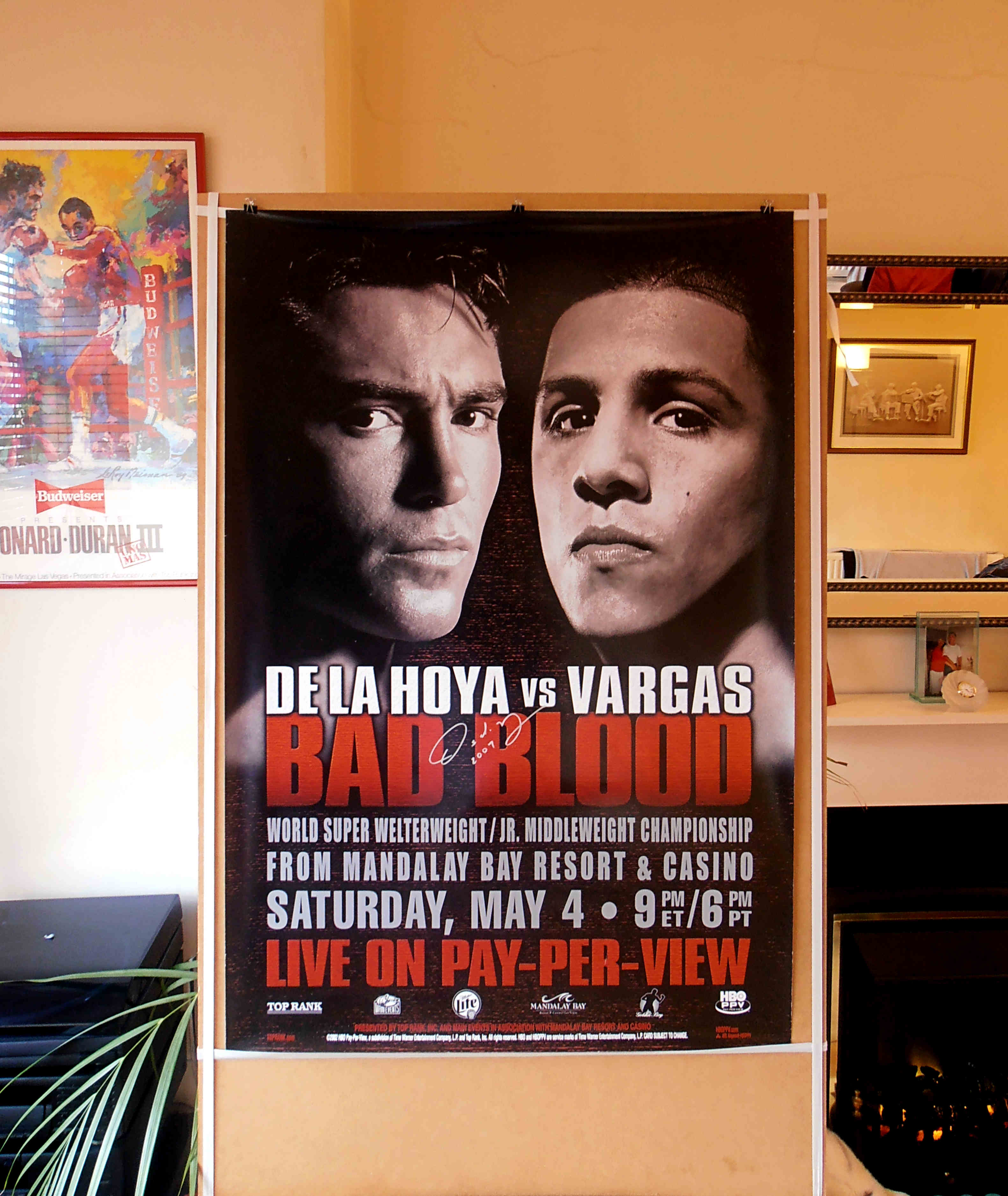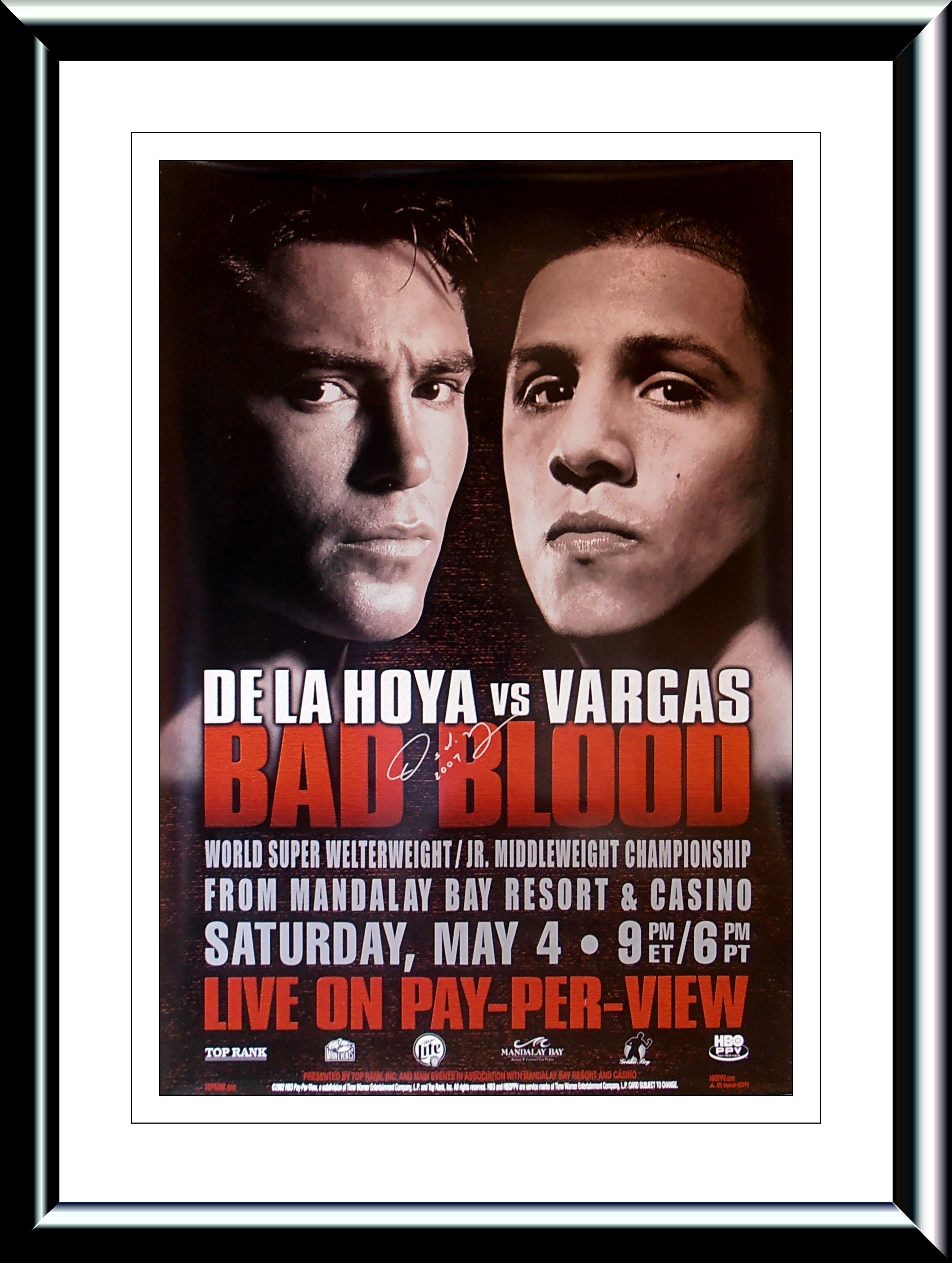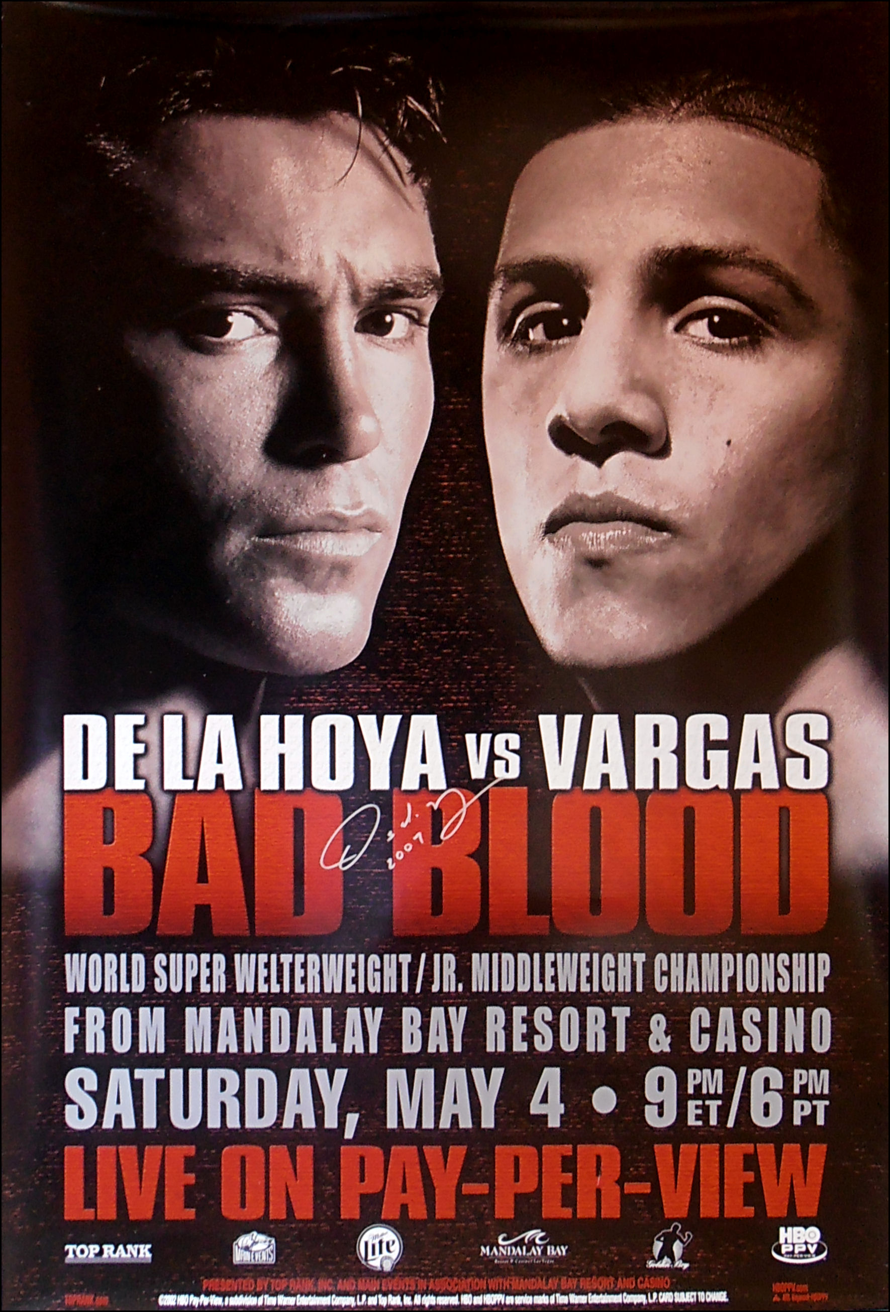 Description : Here we have an original (cancelled date) full-size HBO Boxing fight poster for the long awaited showdown between WBC Light/Middleweight Champion Oscar De La Hoya & WBA Light/Middleweight title holder Fernando Vargas. This was for the unified WBC/WBA titles..... This poster has been autographed by Oscar De La Hoya.