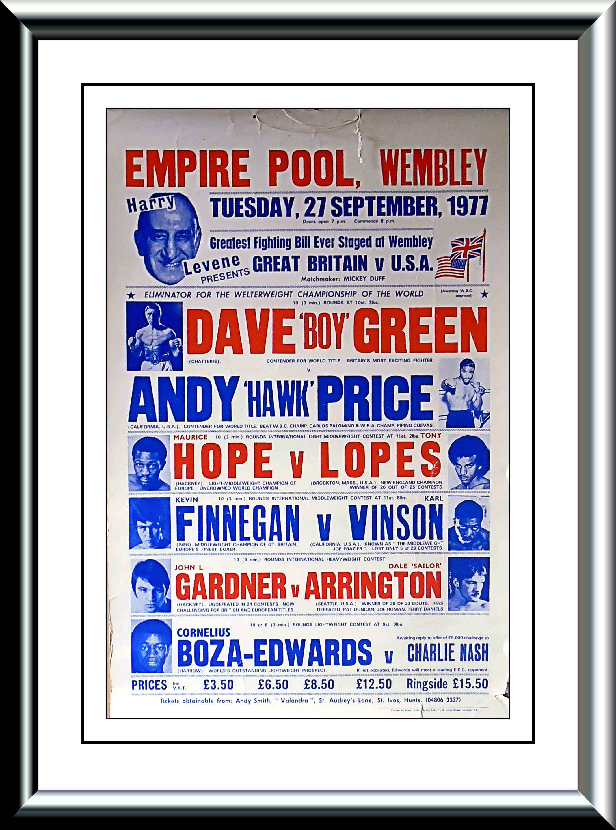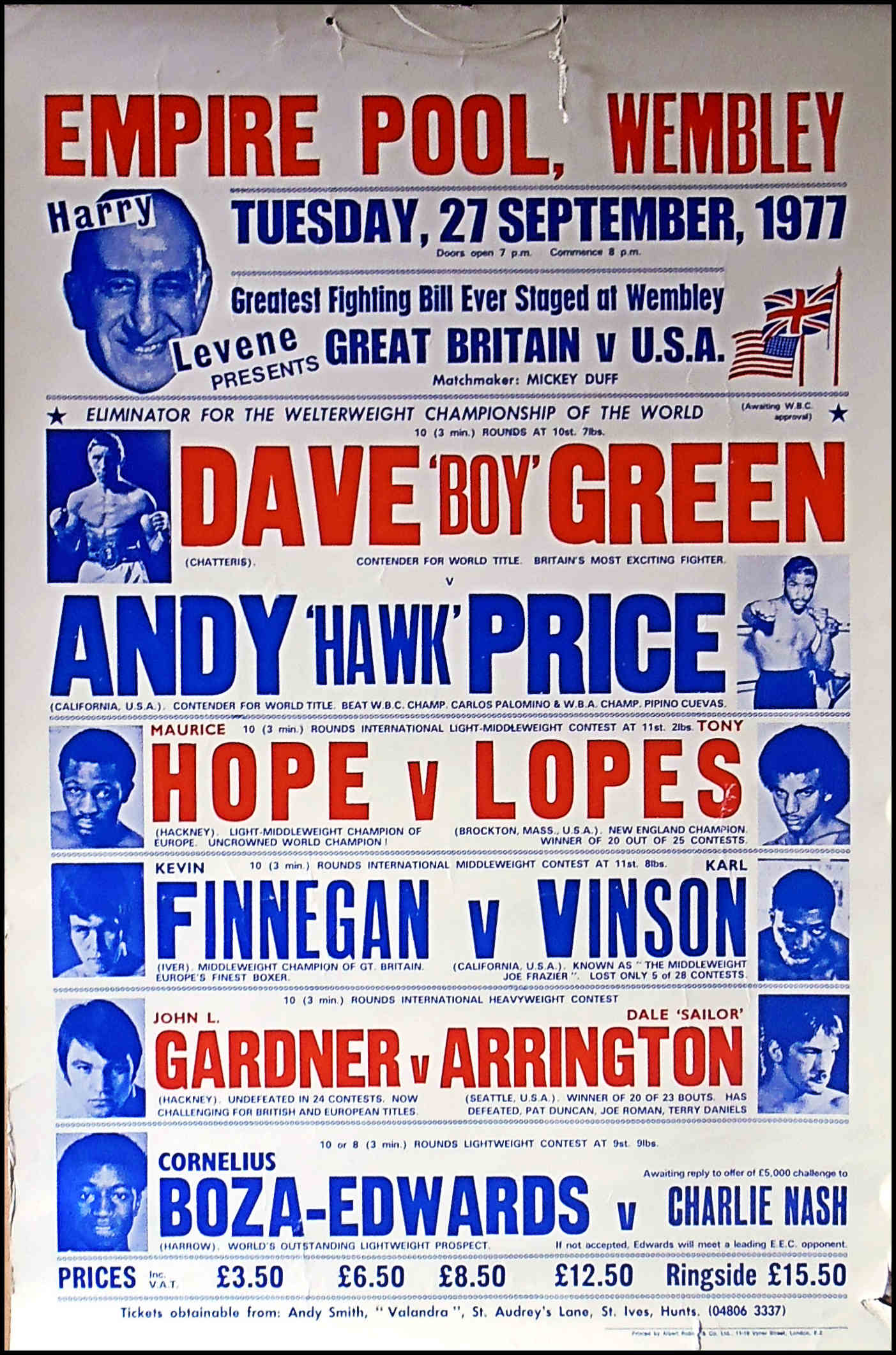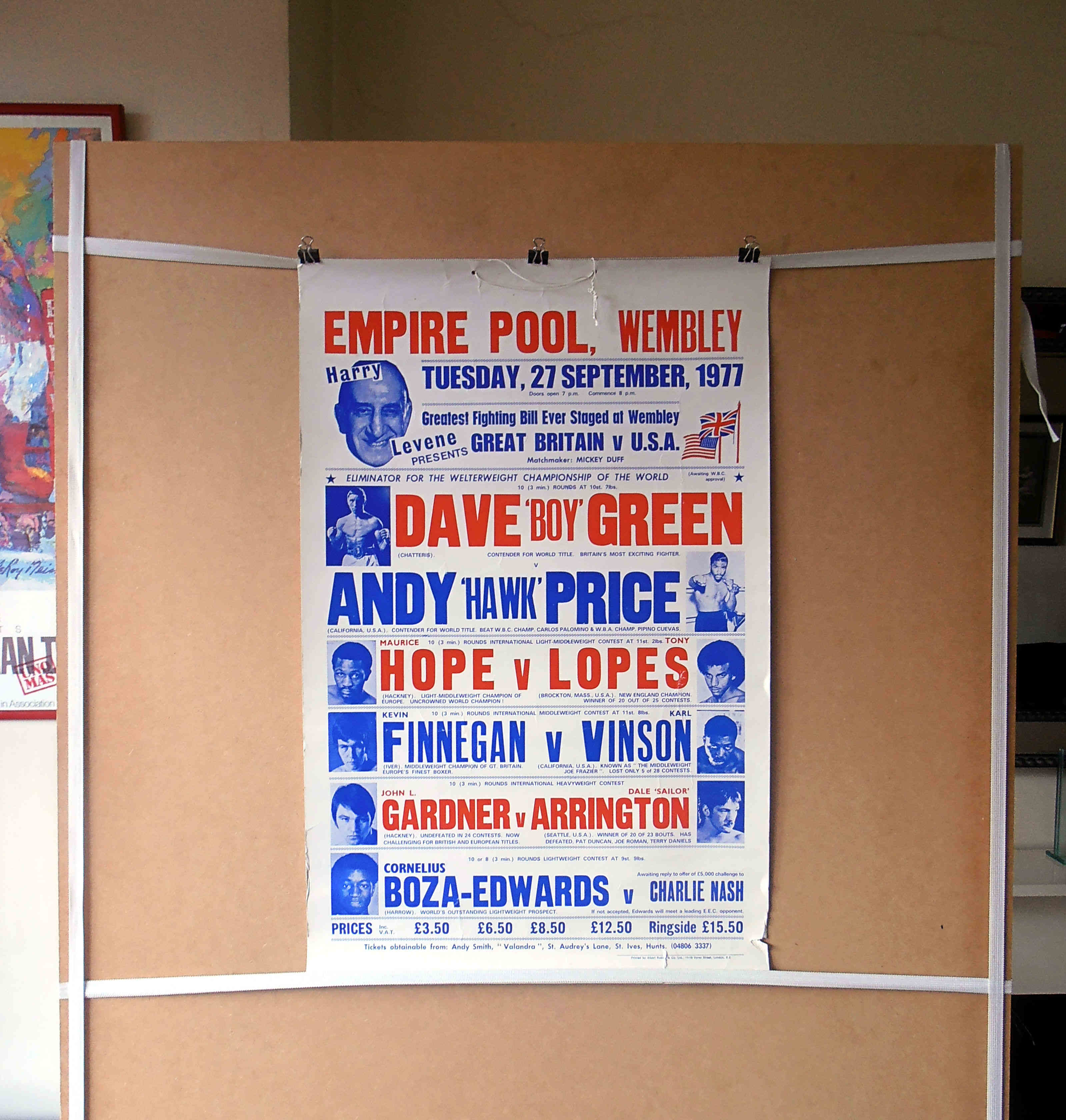 Description : Here we have a vintage onsite poster from the old Empire Pool at Wembley, this was just next door to the old stadium & a major venue for world title fights. We have top 10 contender Britains Dave Boy Green headlining against another top 10 contender in American Andy "Hawk" price, this is how it was done back then, everyone fought each other on there way to the top of the tree & their shot at the Champion. There was only 2 governing bodies around then in the WBA & WBC. No ducking & dodging as Floyd Mayweather has perfected, you had to face the next ranked man on the ladder. Dave green won on points in a 10 rounder, losing back then did your career no real harm, Dave Boy Green was just coming off his unsuccessful challange against Carlos Palomino's WBC Welterweight Crown.