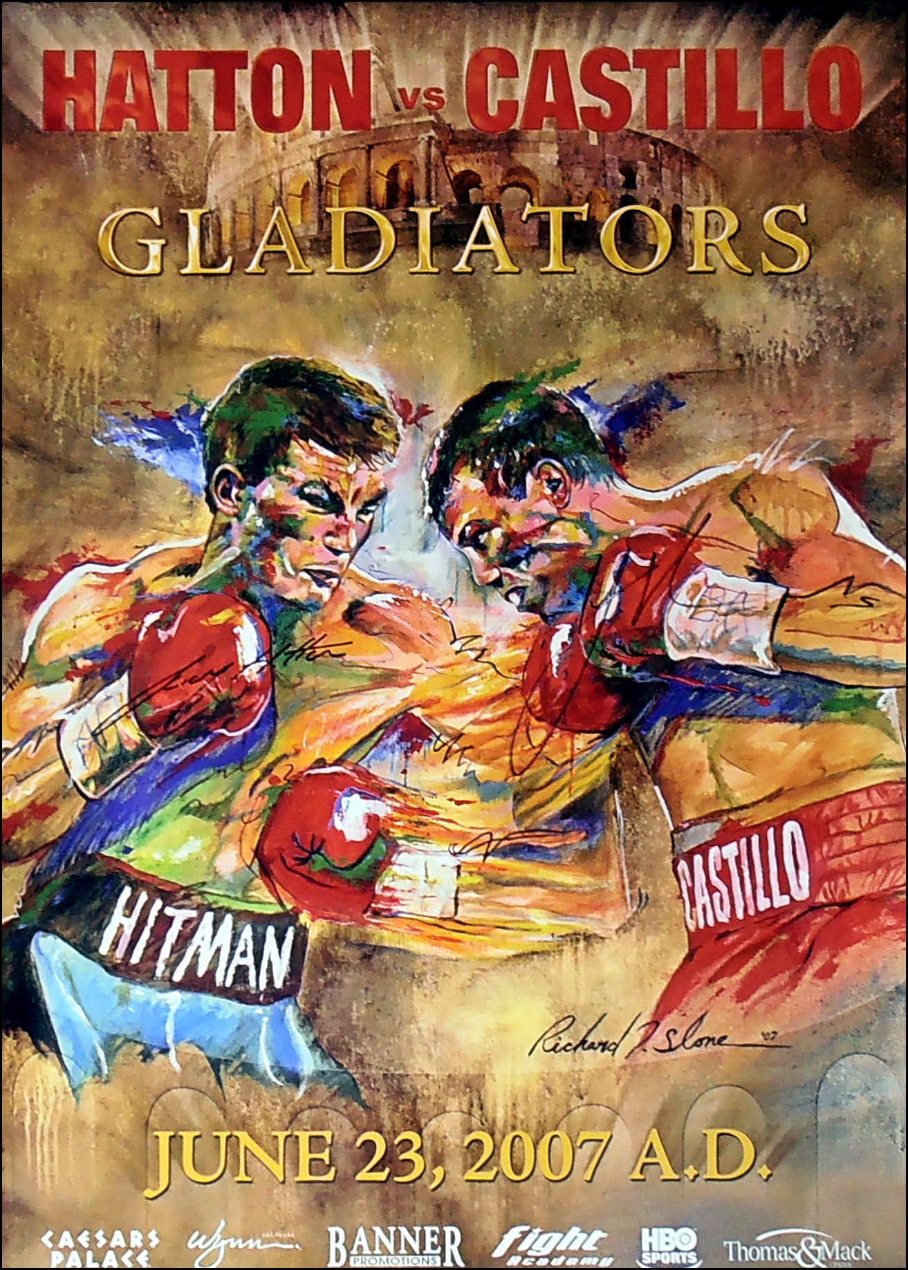 Description : Here we have a superb original onsite poster produced by the world famous sports artist Richard T Slone that has been dual signed by Ricky Hatton & Jose Luis Castillo.