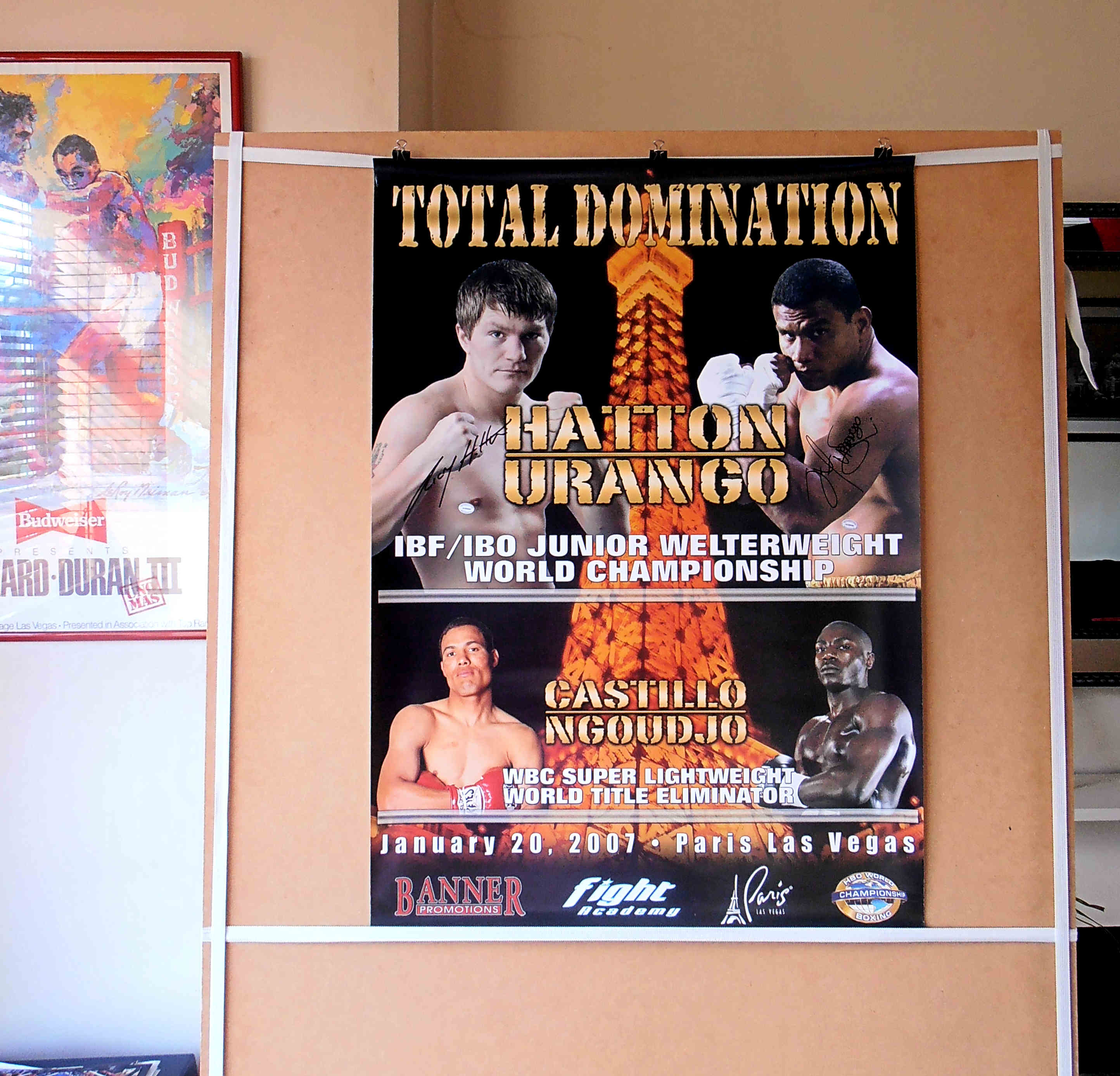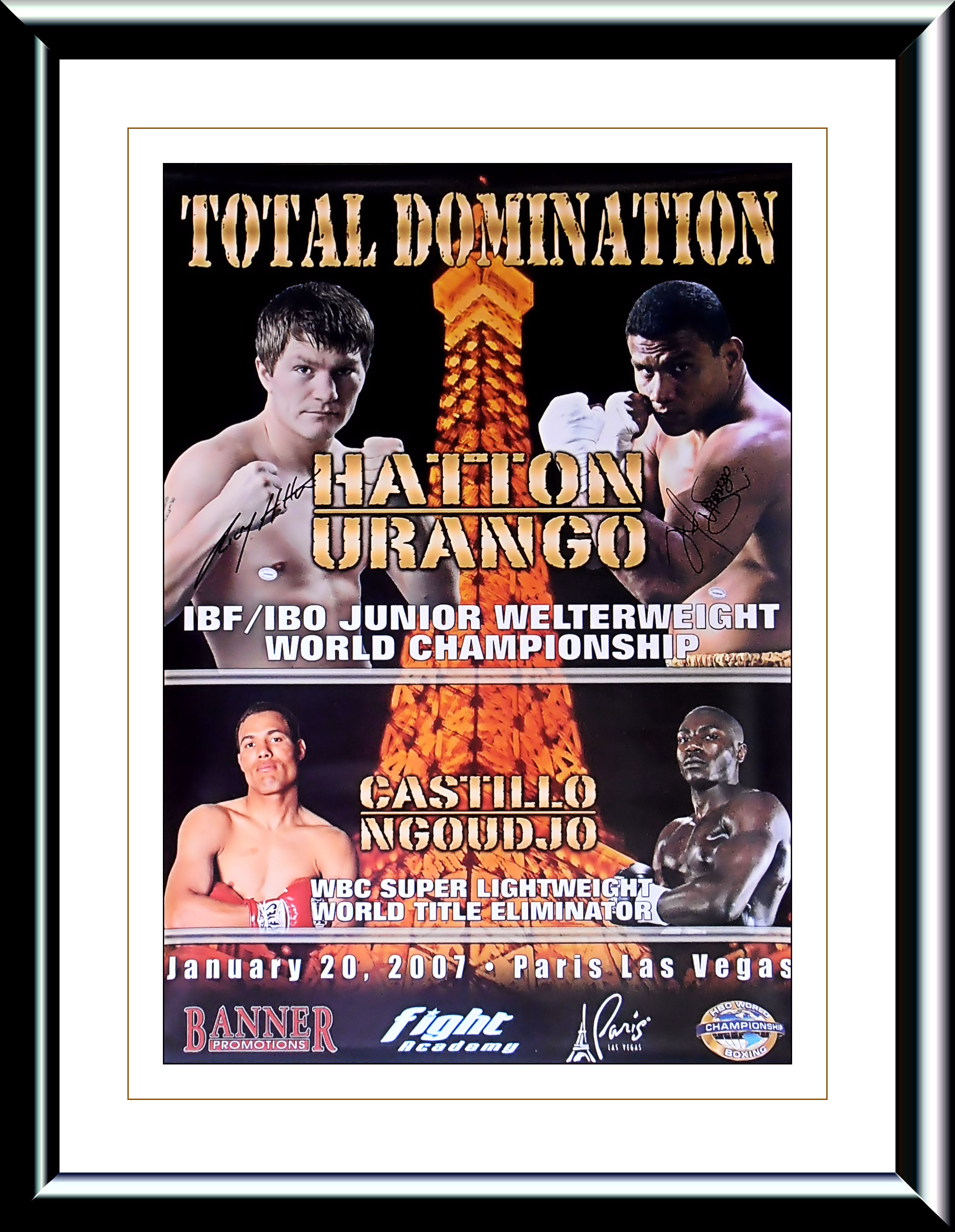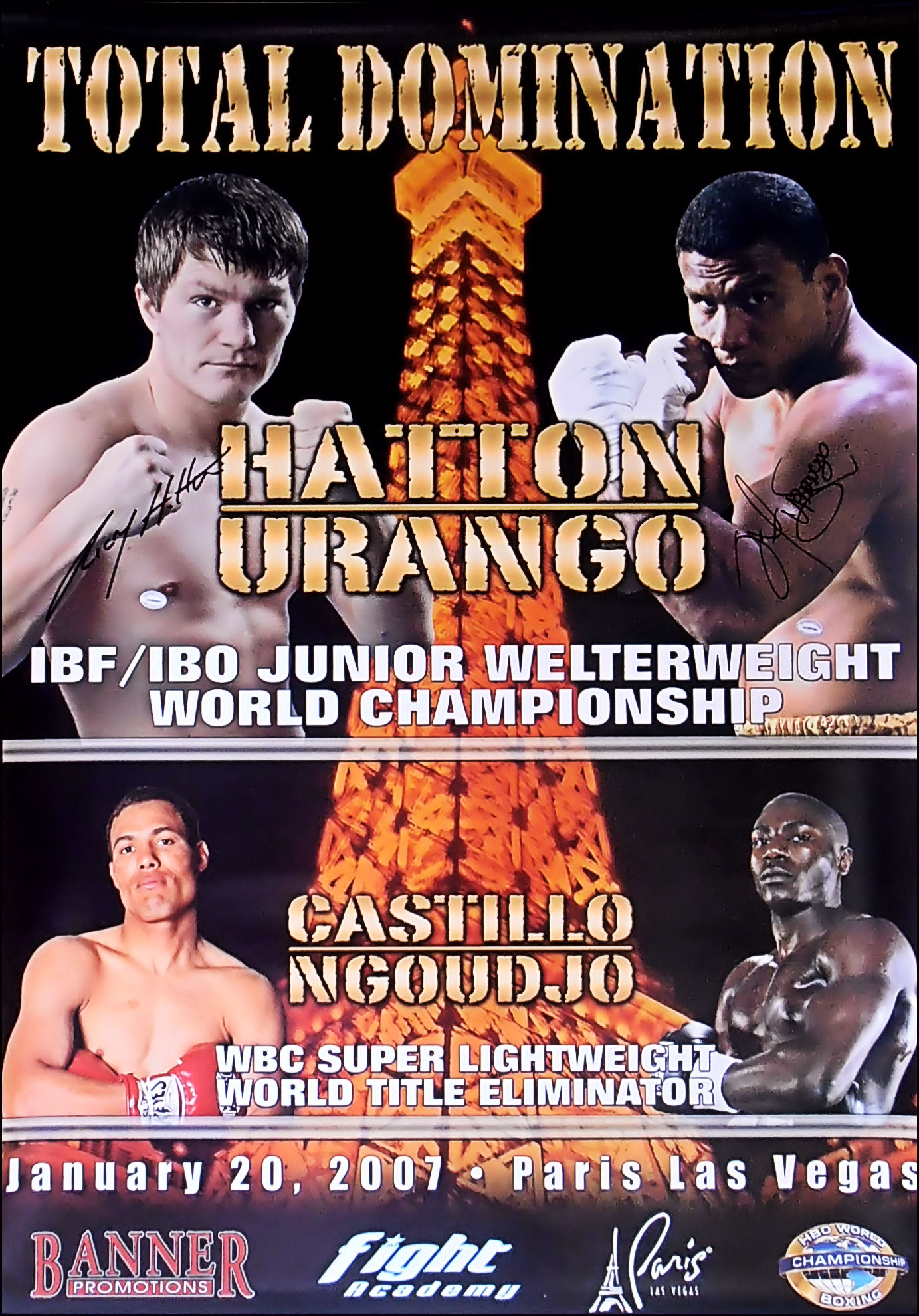 Description : Here we have an authentic Dual Signed onsite poster from Las Vegas for Ricky Hatton's first fight back at light welterweight after stepping up to Welterweight & defeating WBA Champion Luis Collazo. This fight was against the current IBF Light Welterweight Champion Juan Urango and the vacant IBO Light Welterweight title on 20 January 2007 in Las Vegas, Nevada.