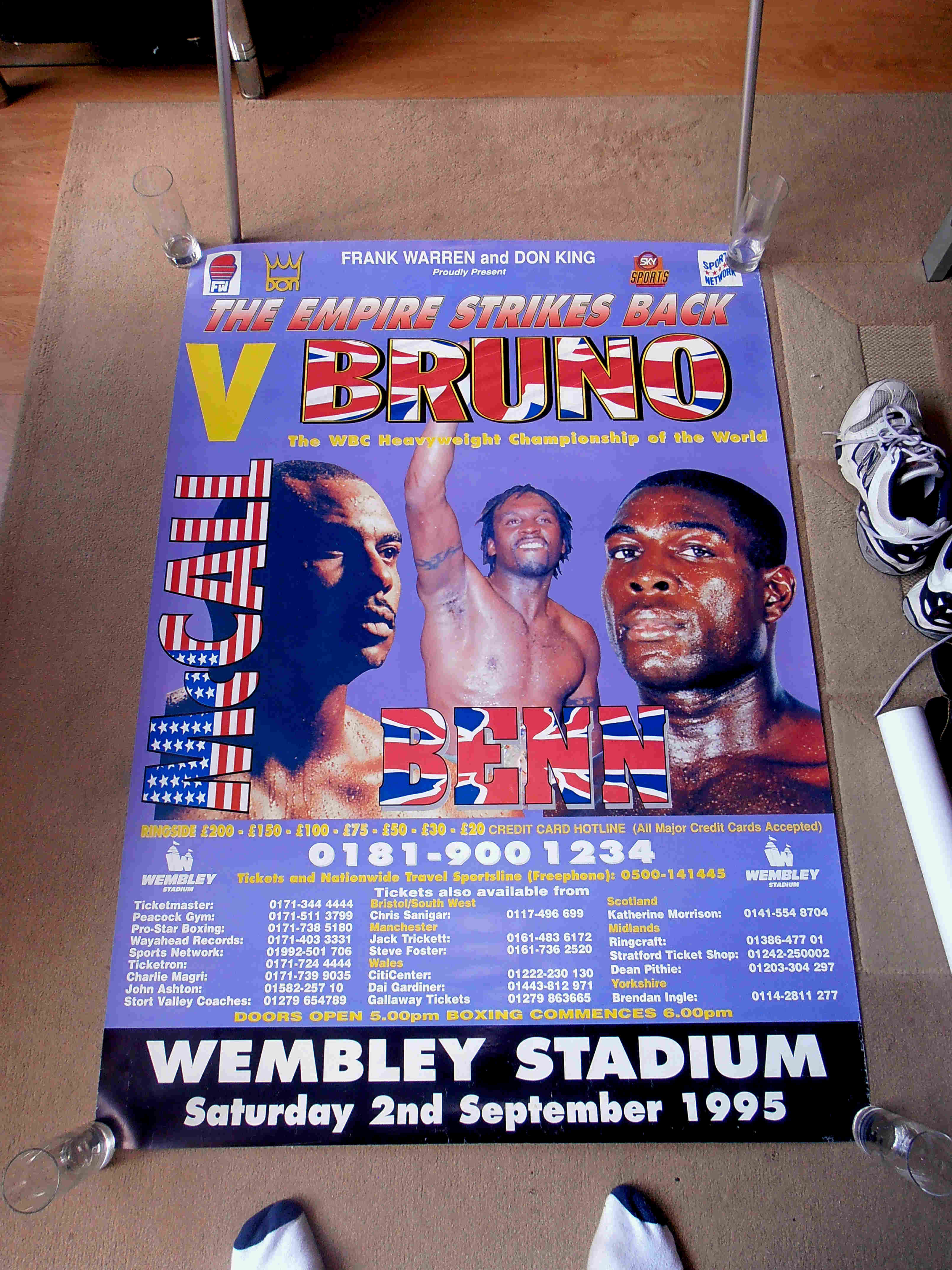 Description : Here we have a fantastic Frank Warren & Don King productions promotional SUPER-Sized billboard poster from that momentous night when Frank Bruno finally succeeded in achieving what now many thought impossible after 3 failed attempts and finally win the Heavyweight World Crown. It's a real rare job getting yer hands on one of these.
