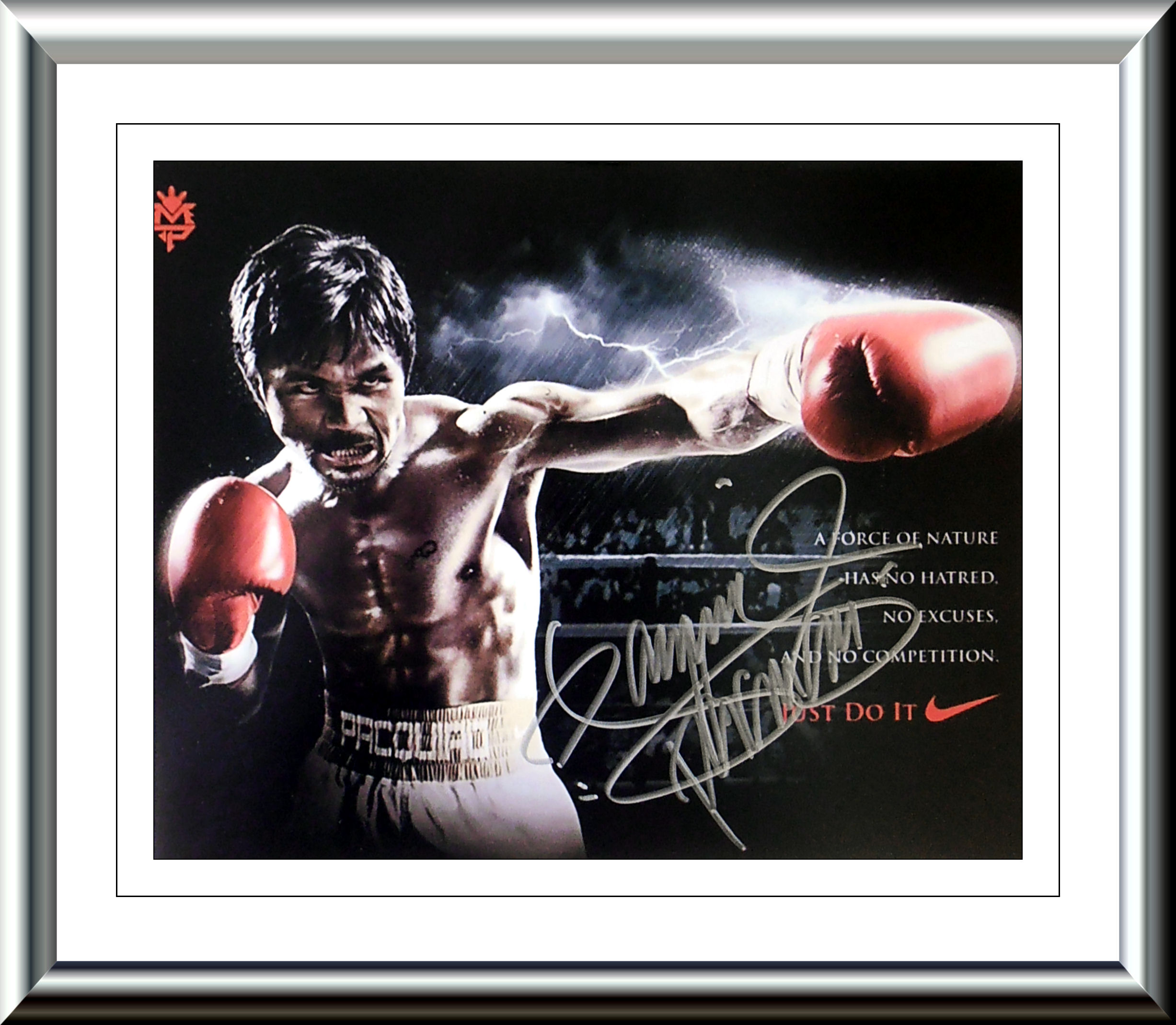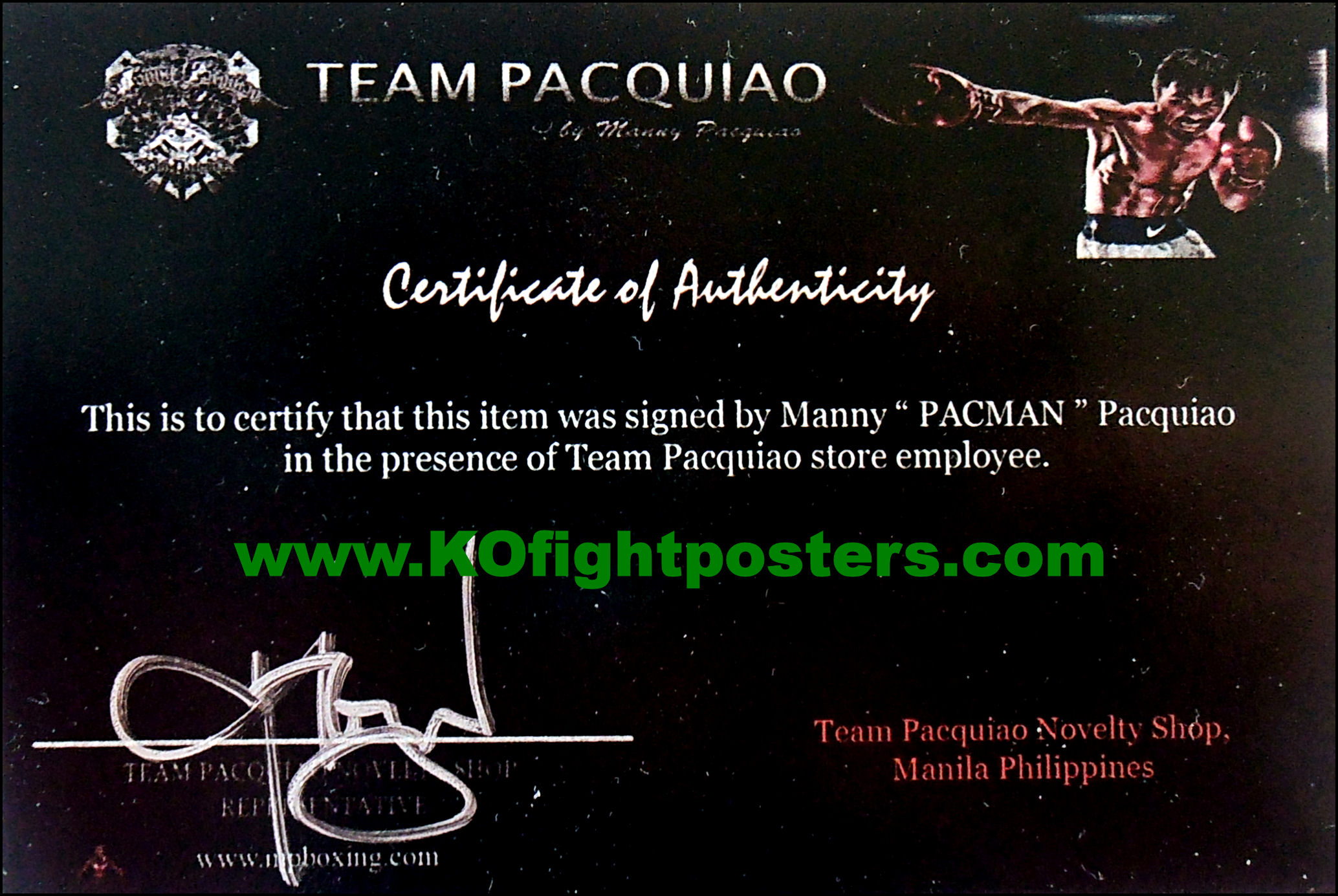 Description : Here we have a fabulous 10in x 8in official Nike brand image photo of Manny Pacquiao. This is Manny in his iconic Nike 'JUST DO IT' pose. This picture has been signed by Manny Pacquiao in silver sharpie pen at one of his many sports concessions in Manilla, Philippines. This Manny Pacquiao autographed item was signed in the presence of one of his 'Team Pacquiao' store employees. This autographed Manny Pacquiao item will come with a covering letter of guarantee of authenticty from KOfightposters along with the 'Team Pacquiao' cert.