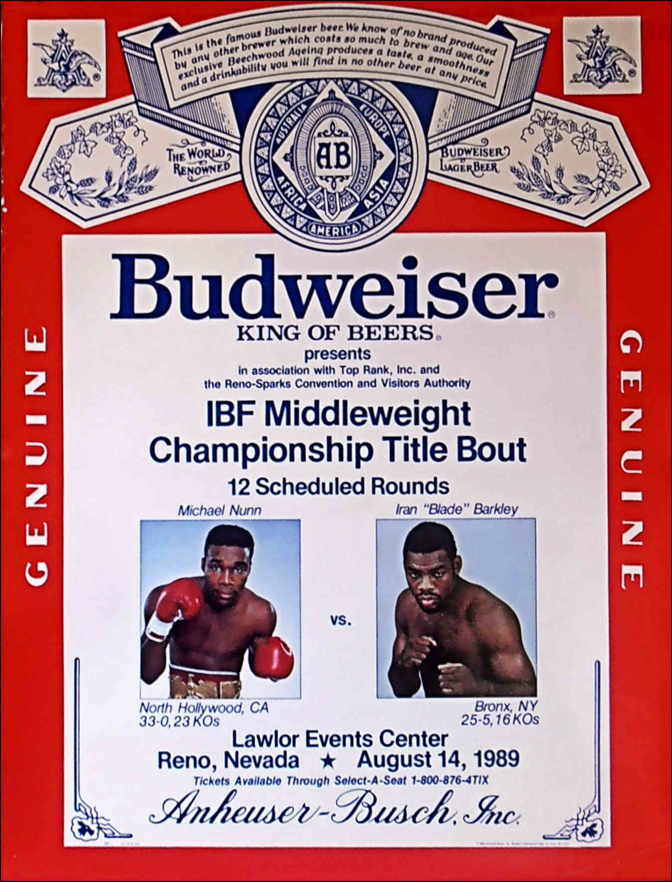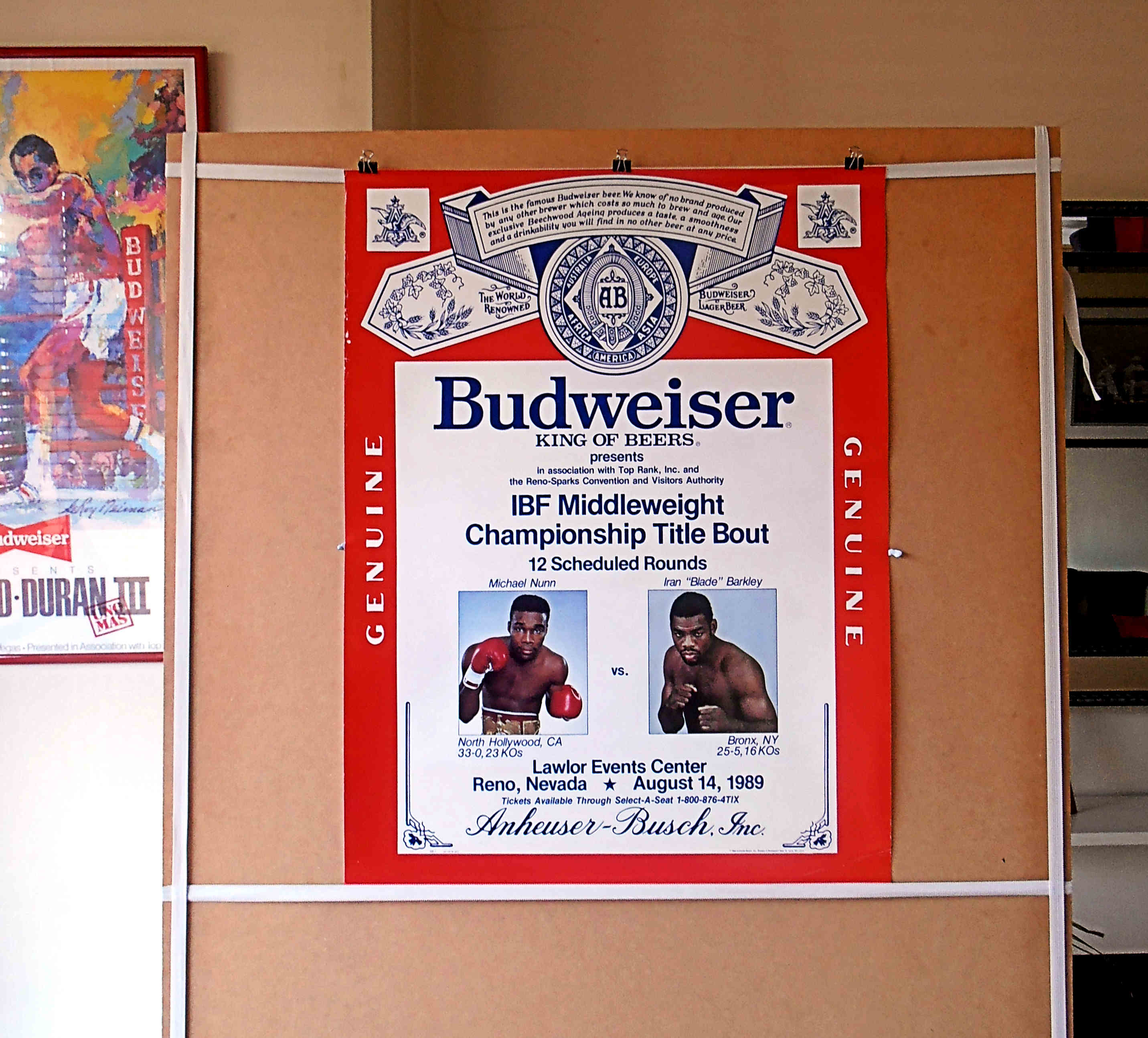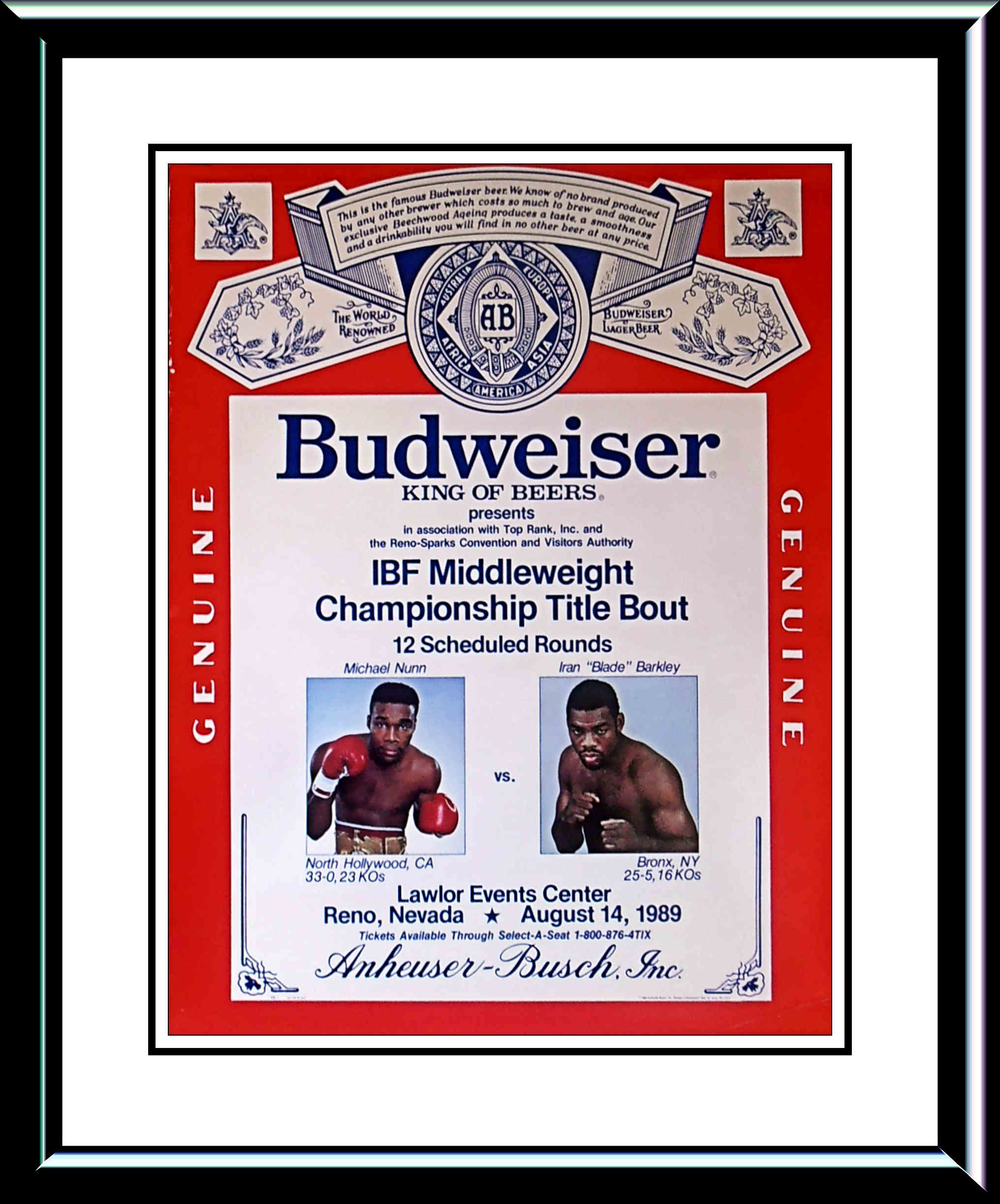 Description : Here we have a vintage Budweiser fight sponsors onsite poster for the IBF Middleweight Championship. Defending champion & slickster Michael Nunn v Iran "The Blade" Barkley who had just lost his WBC Middleweight belt to the Great Roberto Duran in Atlantic City.