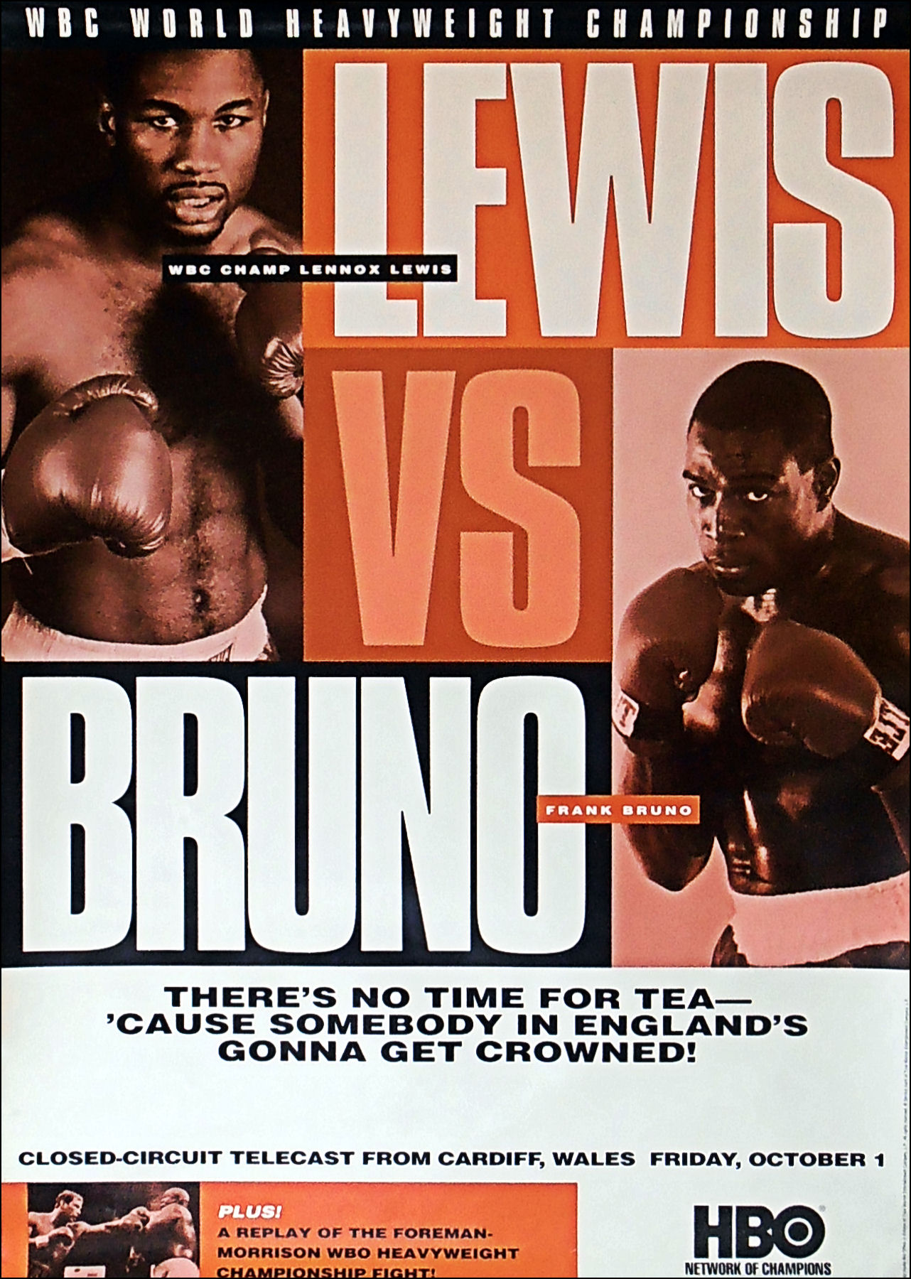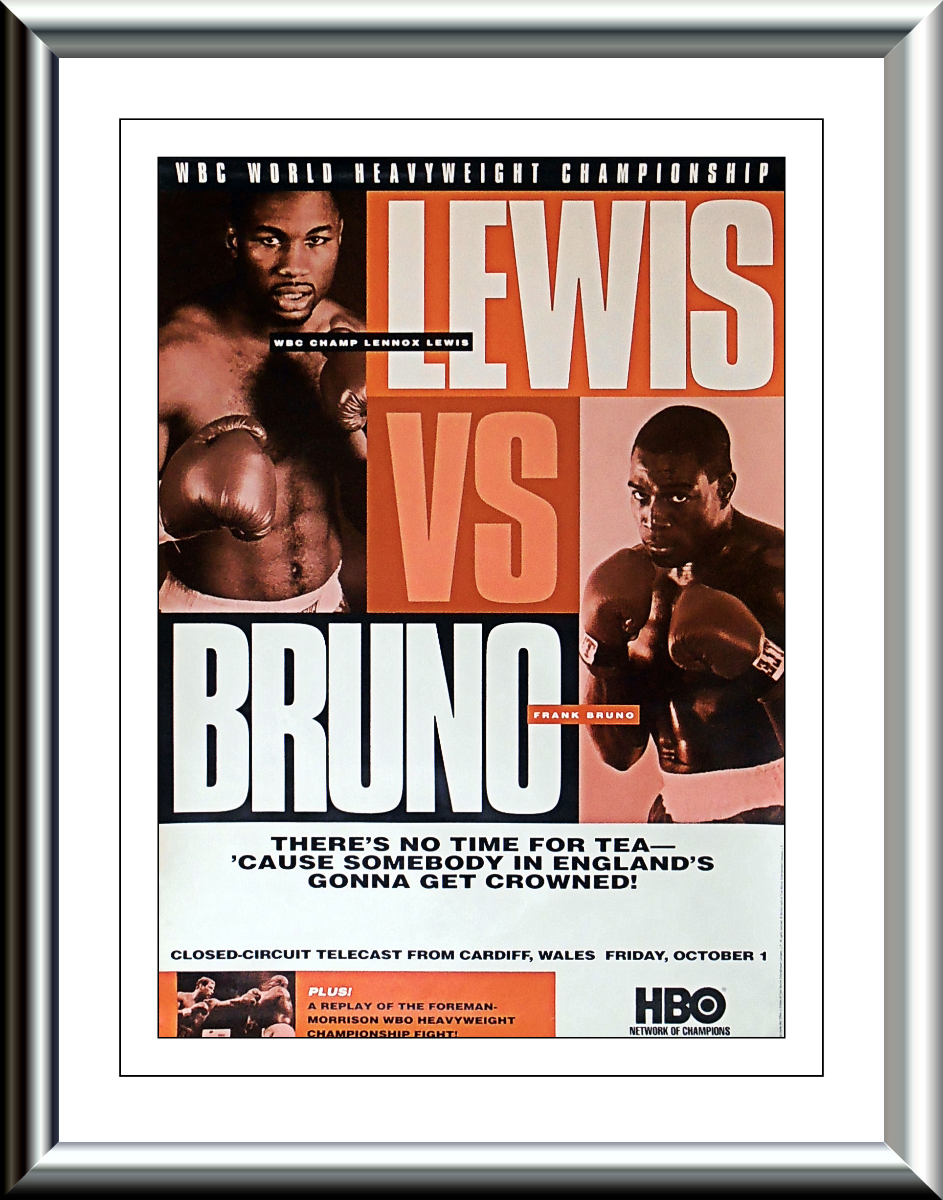 Description : This all British affair got the handle of "The Battle of Britain" This fight took place on 1 October 1993, at the National Stadium, Cardiff Arms Park, Cardiff, Wales. It was between WBC Heavyweight Champion Lennox Lewis, who was making the second defence of his title and Frank Bruno, who was fighting in his third world title bout, his two previous title attemps where against Tim Witherspoon & Mike Tyson.