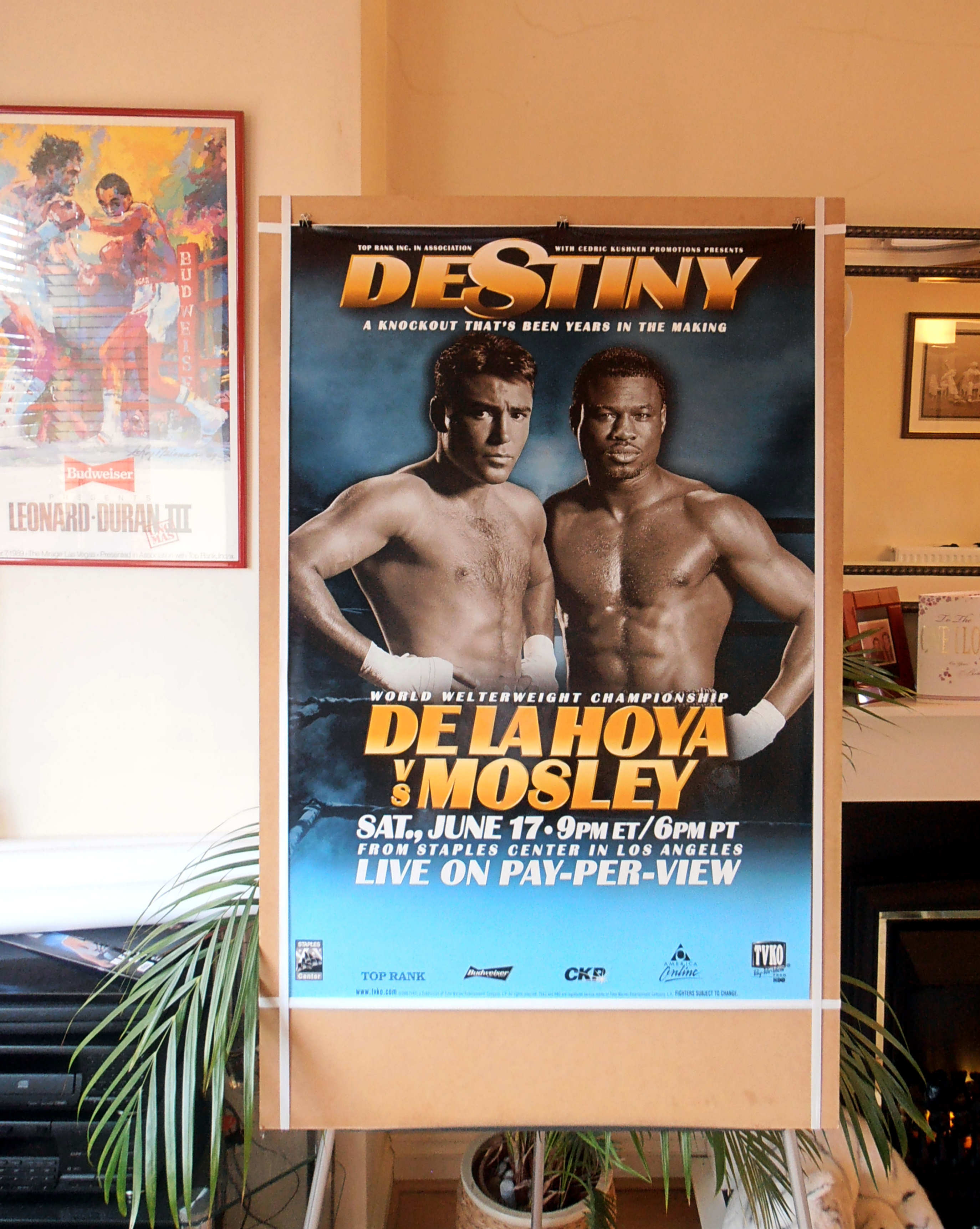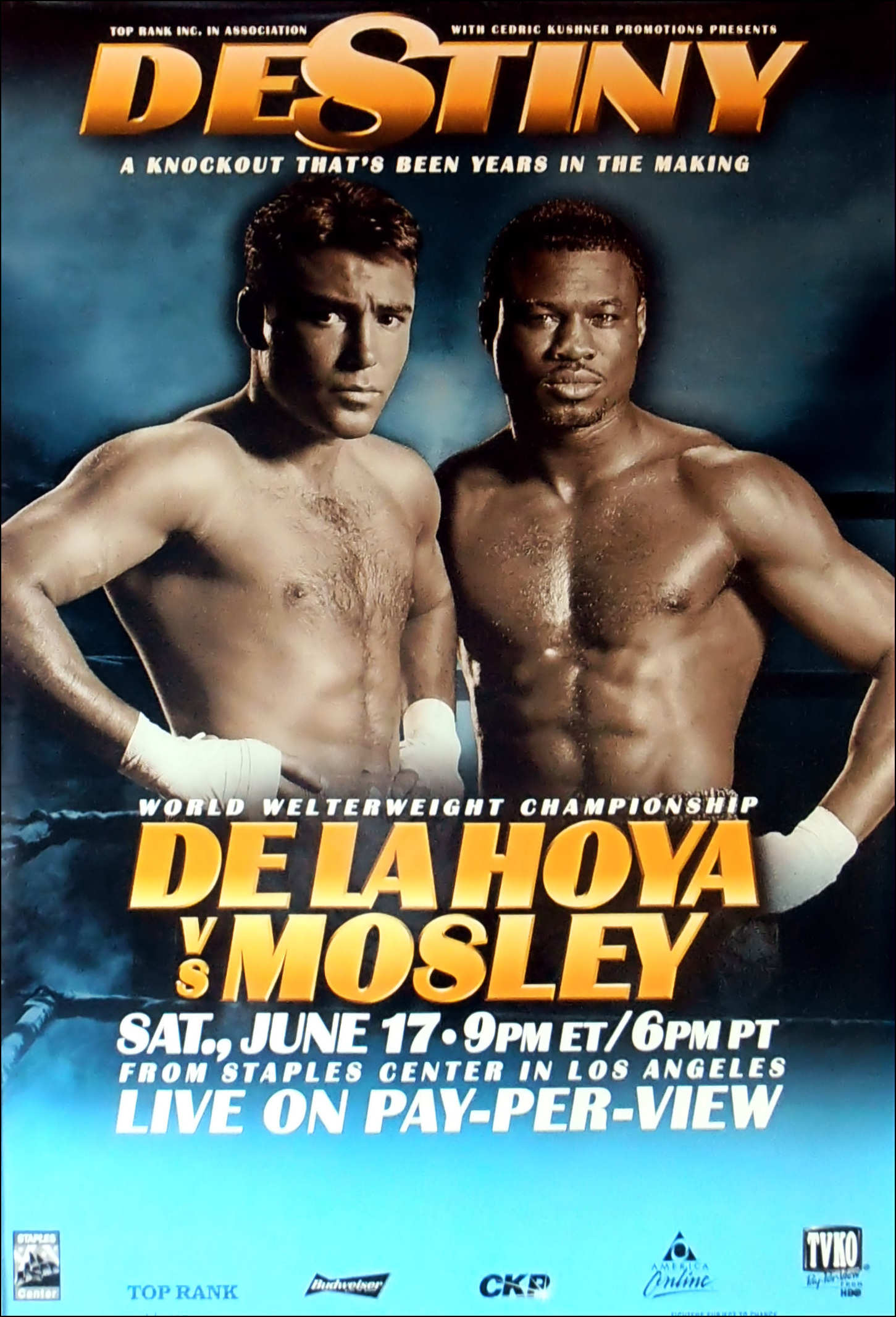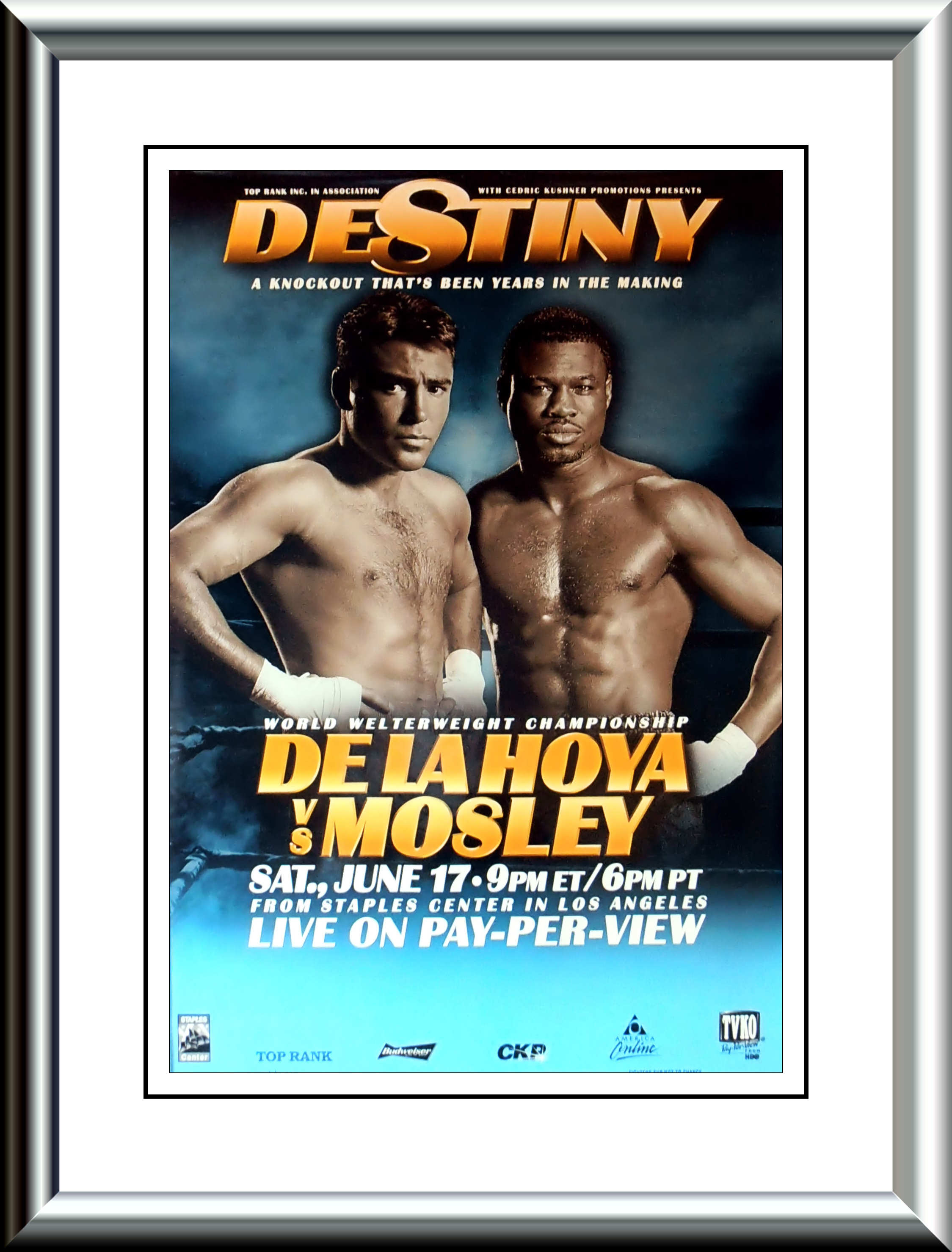 Description : Here we have a Super Scarce full-size Official Top Rank Boxing PPV poster for the Super fight of early 2000. On February 26, 2000, De La Hoya knocked out Derrell Coley (34-1-2) in a WBC eliminator. The WBC awarded De La Hoya their welterweight title, which he lost, to Sugar Shane Mosley the former IBF lightweight Champion(34-0) by a split decision on 17 June 2000, giving De La Hoya the first sound defeat of his pro career. The fight was a disputed decision, with one judge scoring the fight 115-113 for De La Hoya, and the other two scoring it 116-112 and 115-113 for Mosley.