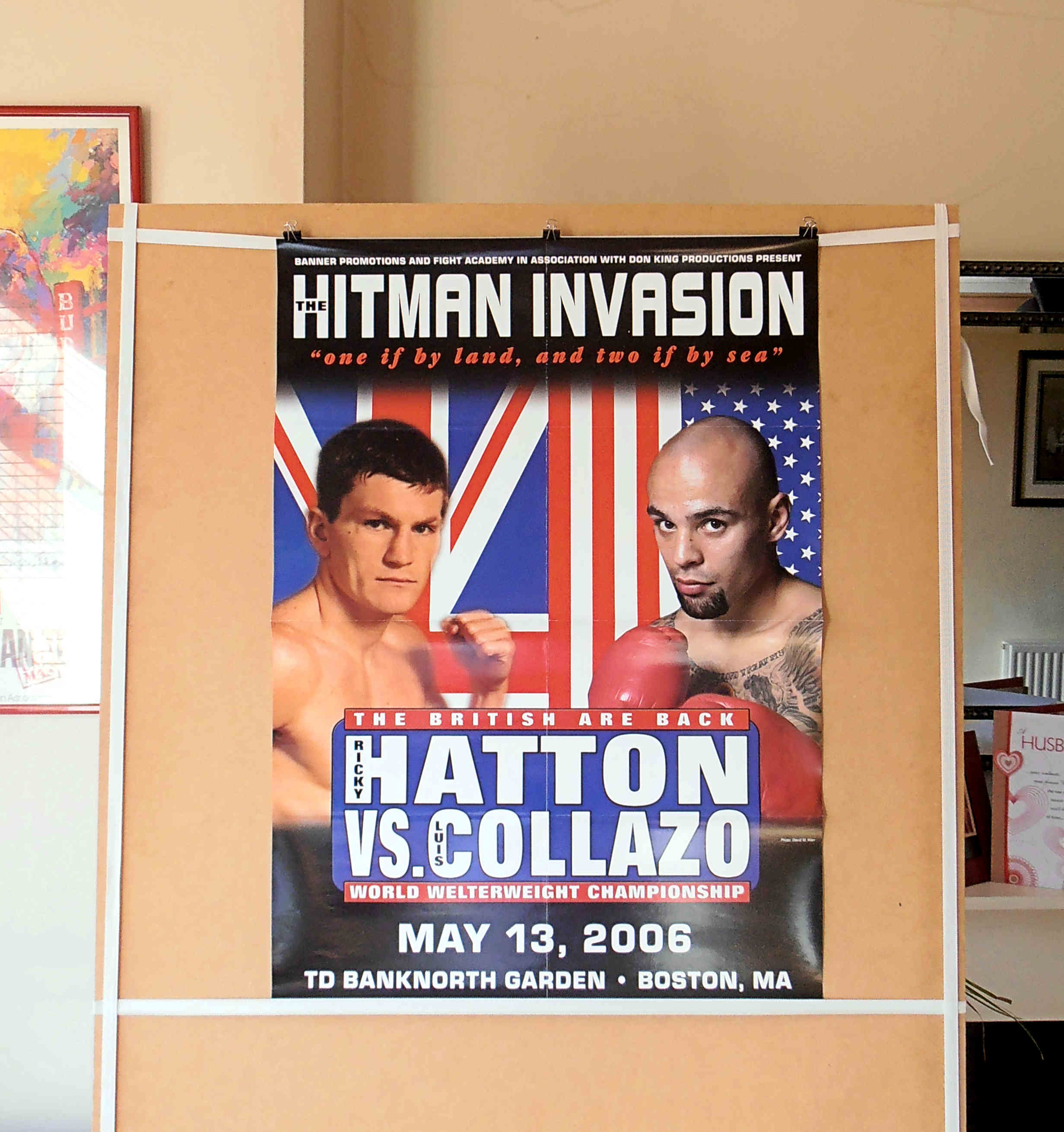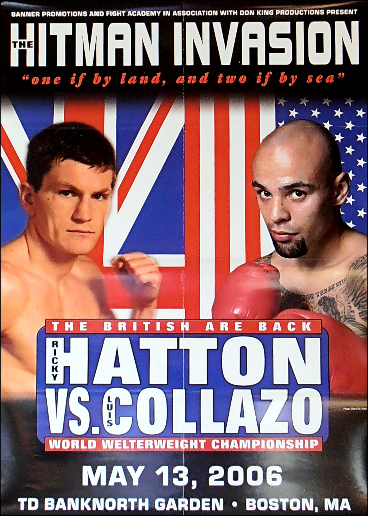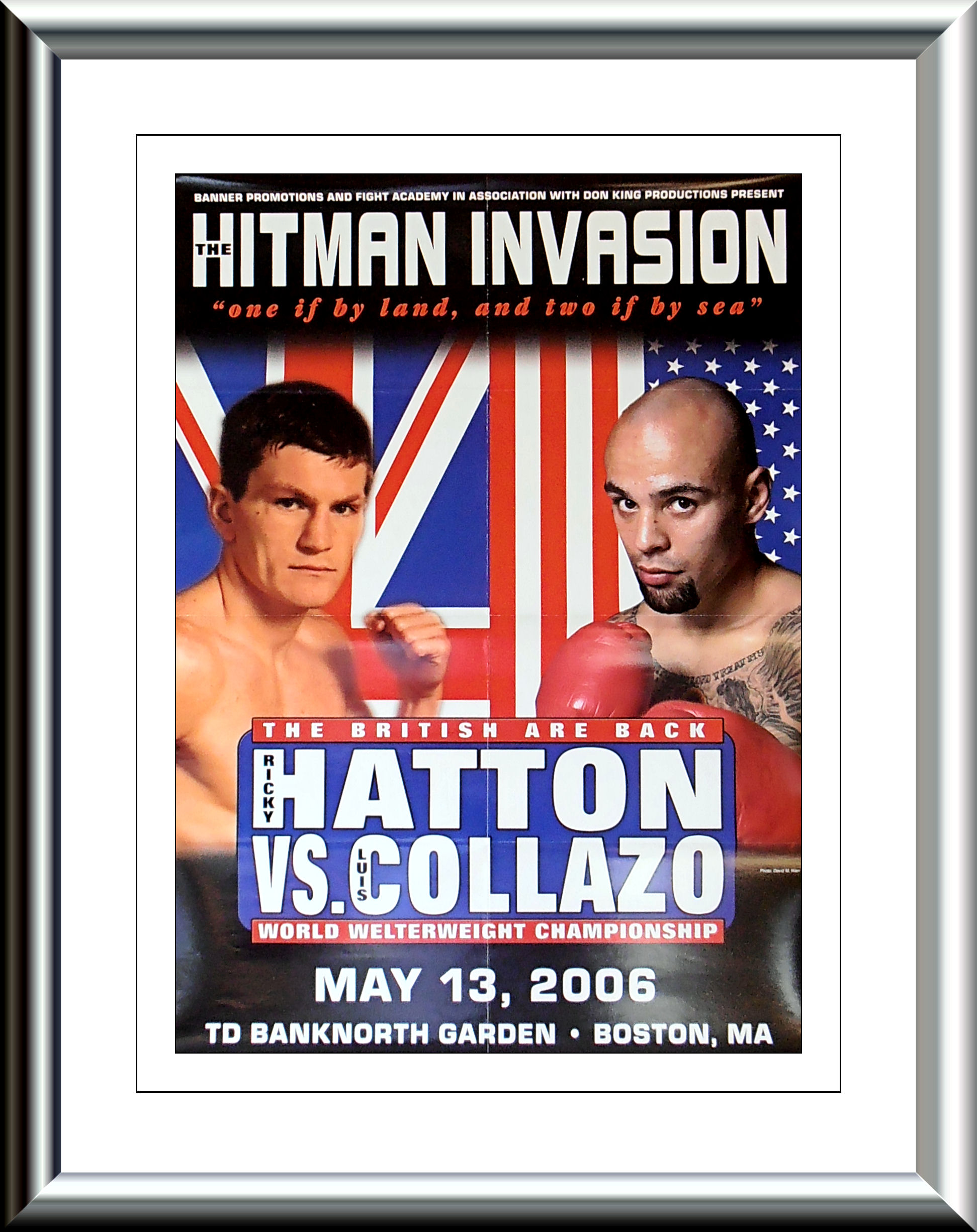 Description : Here we have an original onsite poster from Hatton's 1st fight stateside. Hatton moved up a division to meet American Luis Collazo for the WBA Welterweight Championship crown which took place on 13 May 2006. Hatton won the WBA crown from Collazo but struggled. Hatton started well, knocking Collazo down in the very first few seconds of the first round, it looked all over, but it turned out to be one of the toughest fights of his career, Collazo slowly dragged himself back into contention & rocked Ricky right down to his toenails in the last & final round. It looked a close call in my eyes, plenty of boxing pundits ringside thought Collazo won the fight, but just as many thought Hatton had done enough early on to secure victory, with the knockdown a pivotal point in the fight.