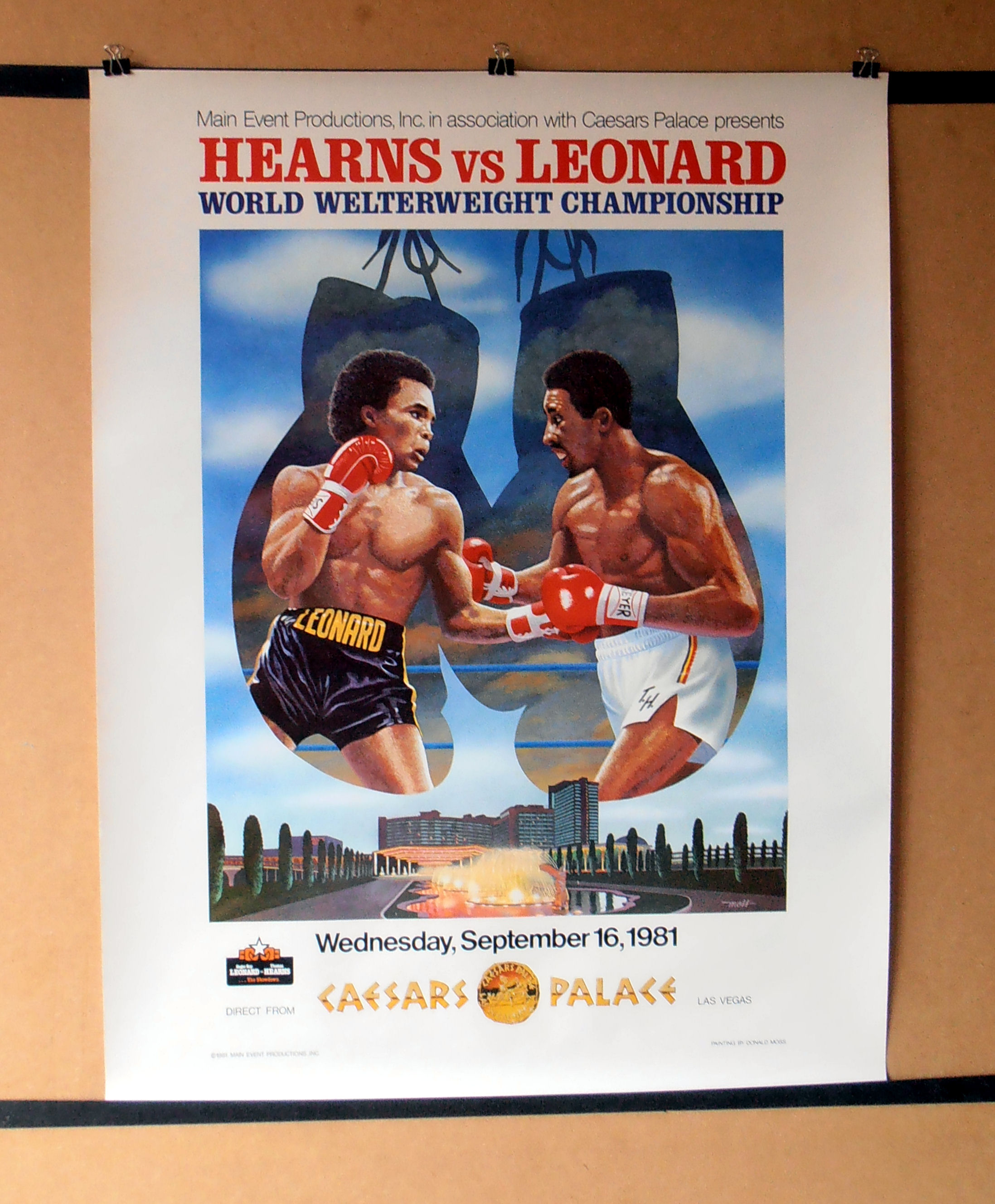 Description : Here have a fabulous vintage official Caesars Palace Las Vegas closed circuit fight poster for the Undisputed Welterweight Championship of the world. Promoted as "The Showdown," Leonard (30-1 with 21 KO) fought Hearns (32-0 with 30 KO) on September 16, 1981 at Caesars Palace Las Vegas, Nevada to unify the world welterweight championship in a scheduled fifteen-rounder. They fought before a live crowd of 23,618 and a worldwide TV audience of some 300 million.