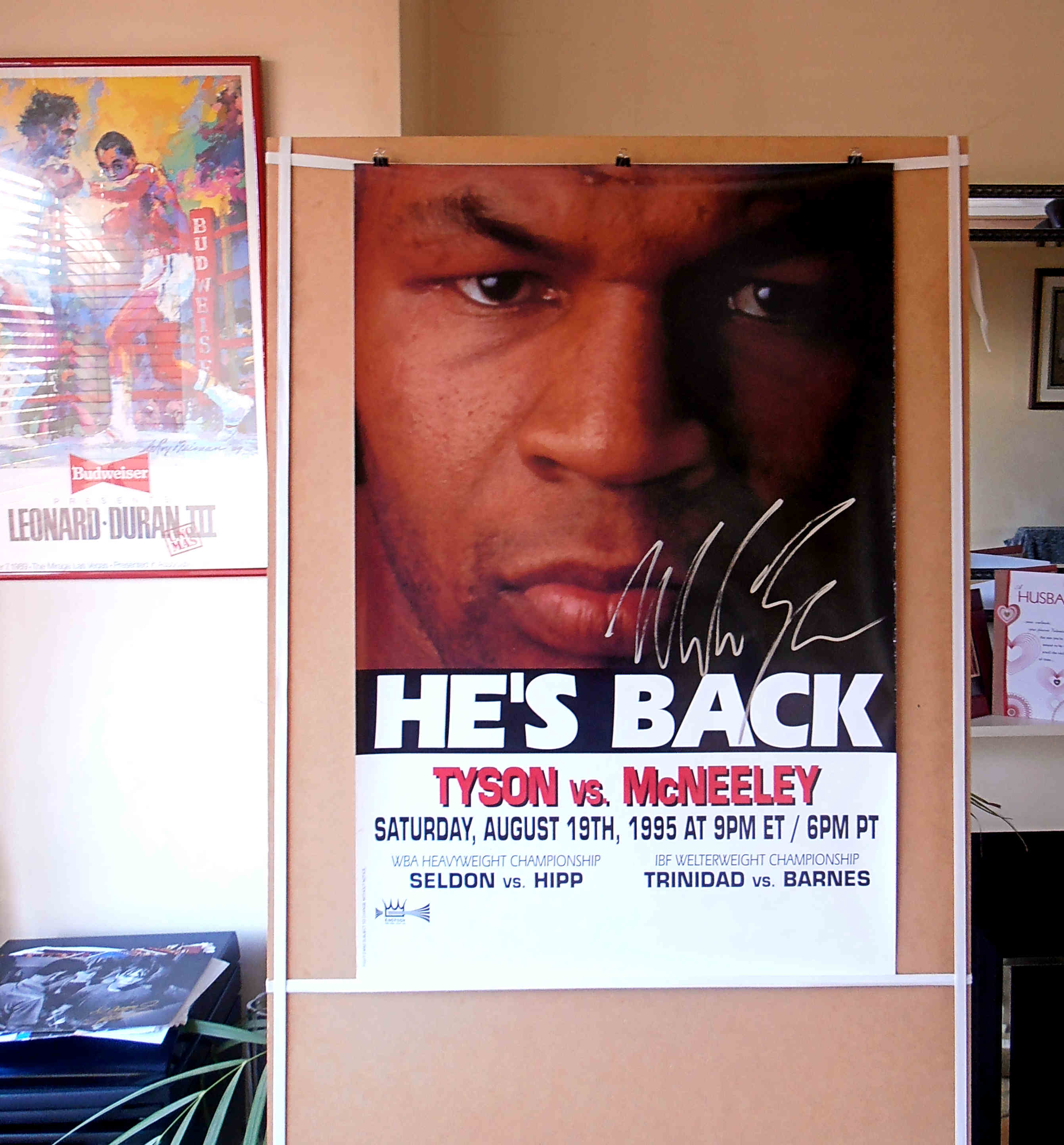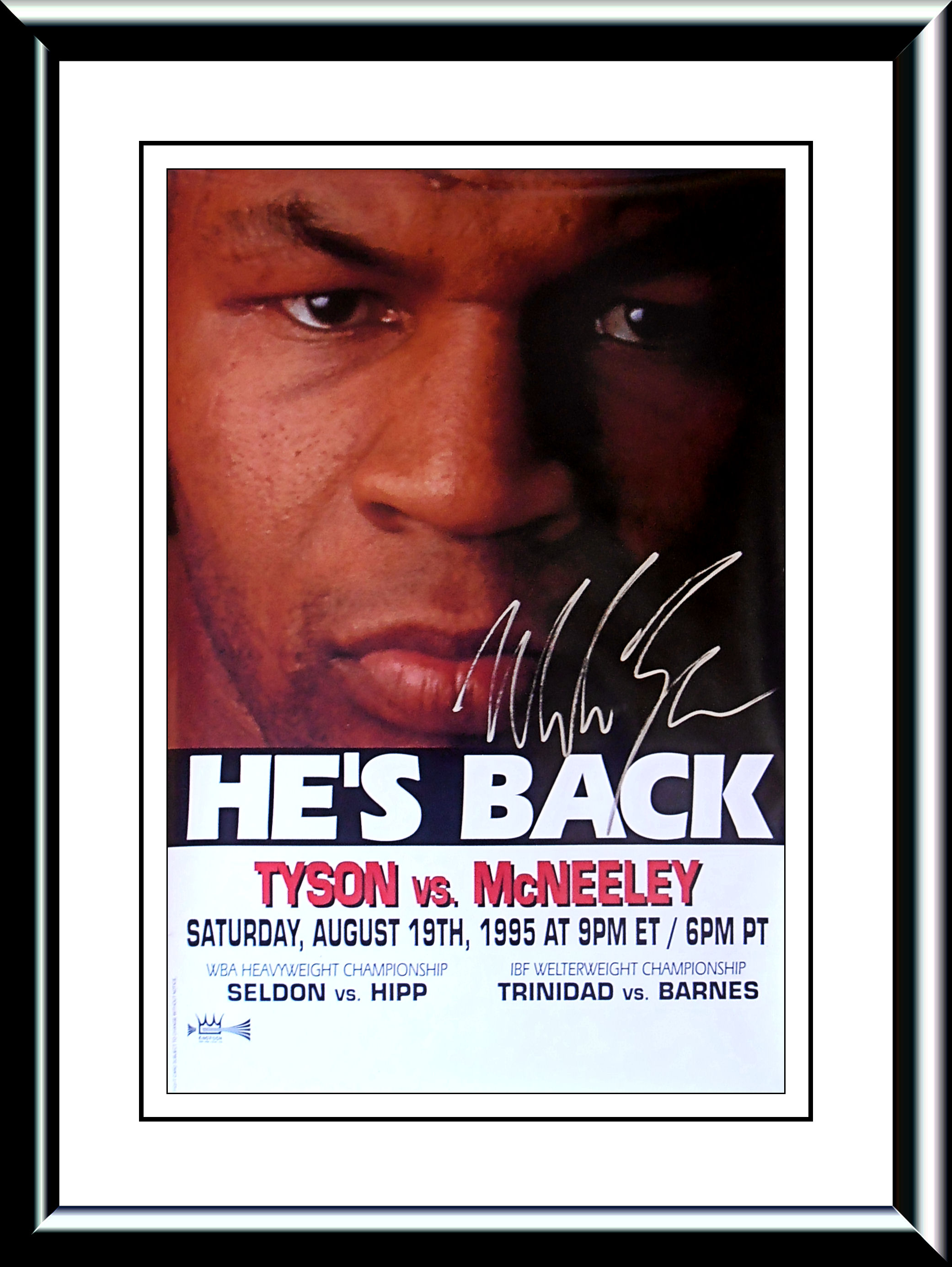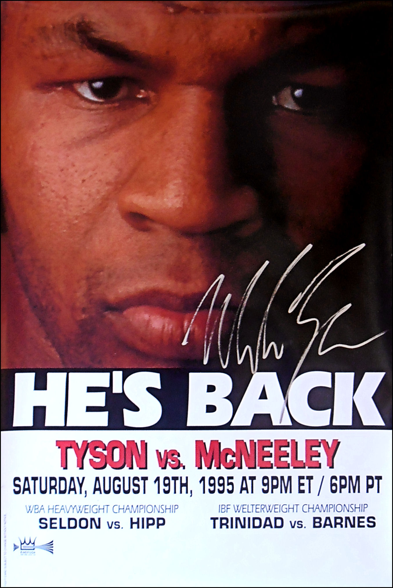 Description : Here we have an original Kingvision' (Don King) PPV poster for his comeback fight at the MGM Grand Las Vegas, this poster was signed by Mike Tyson at the Golden Gloves Gym, North Las Vegas in 2000.......Mike Tyson vs. Peter McNeeley, billed as "He's Back", took place on August 19, 1995 at the MGM Grand. The match marked the return of Mike Tyson to professional boxing after over four years away due to his 1991 arrest and subsequent conviction for rape in 1992 which led to Tyson serving three years in prison. Tyson was paroled on March 25, 1995 and on March 29, he would hold a short press conference that would announce his return to boxing as well as that Don King would remain his promoter. After much debate over who would be Tyson's first opponent in his comeback, including talks about a potential superfight with George Foreman, it was announced that Tyson would face little-known Peter McNeeley on August 19, 1995.