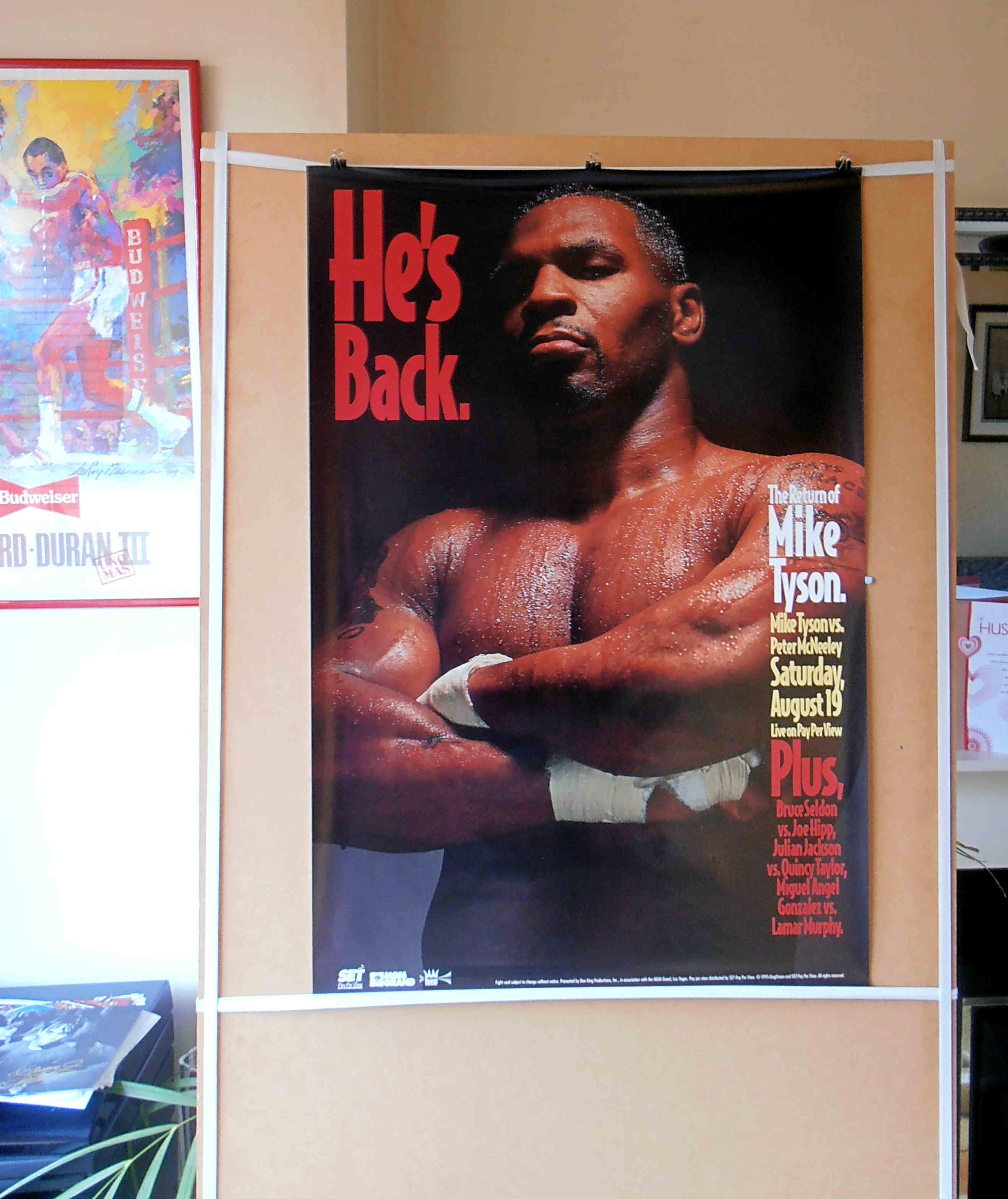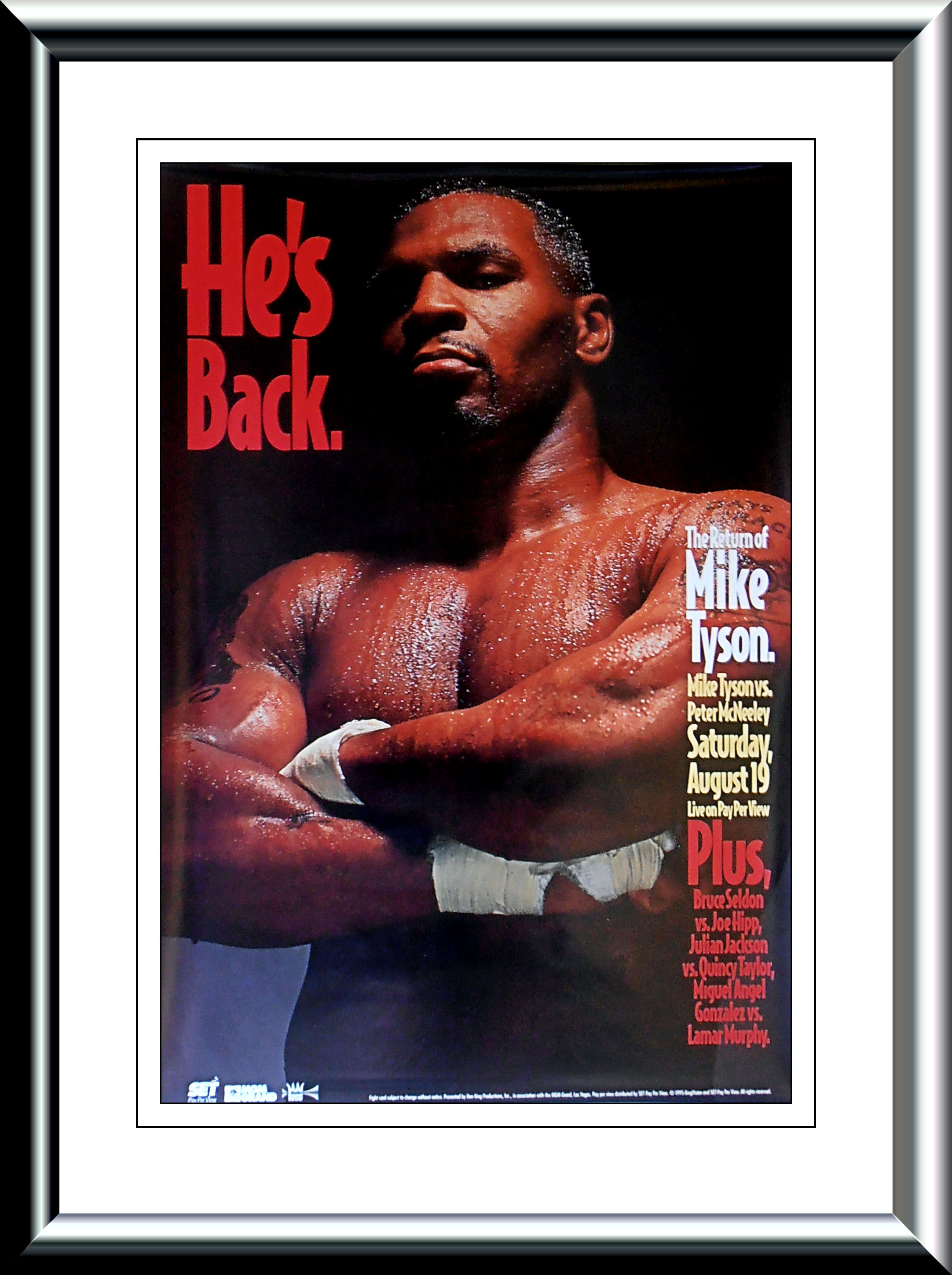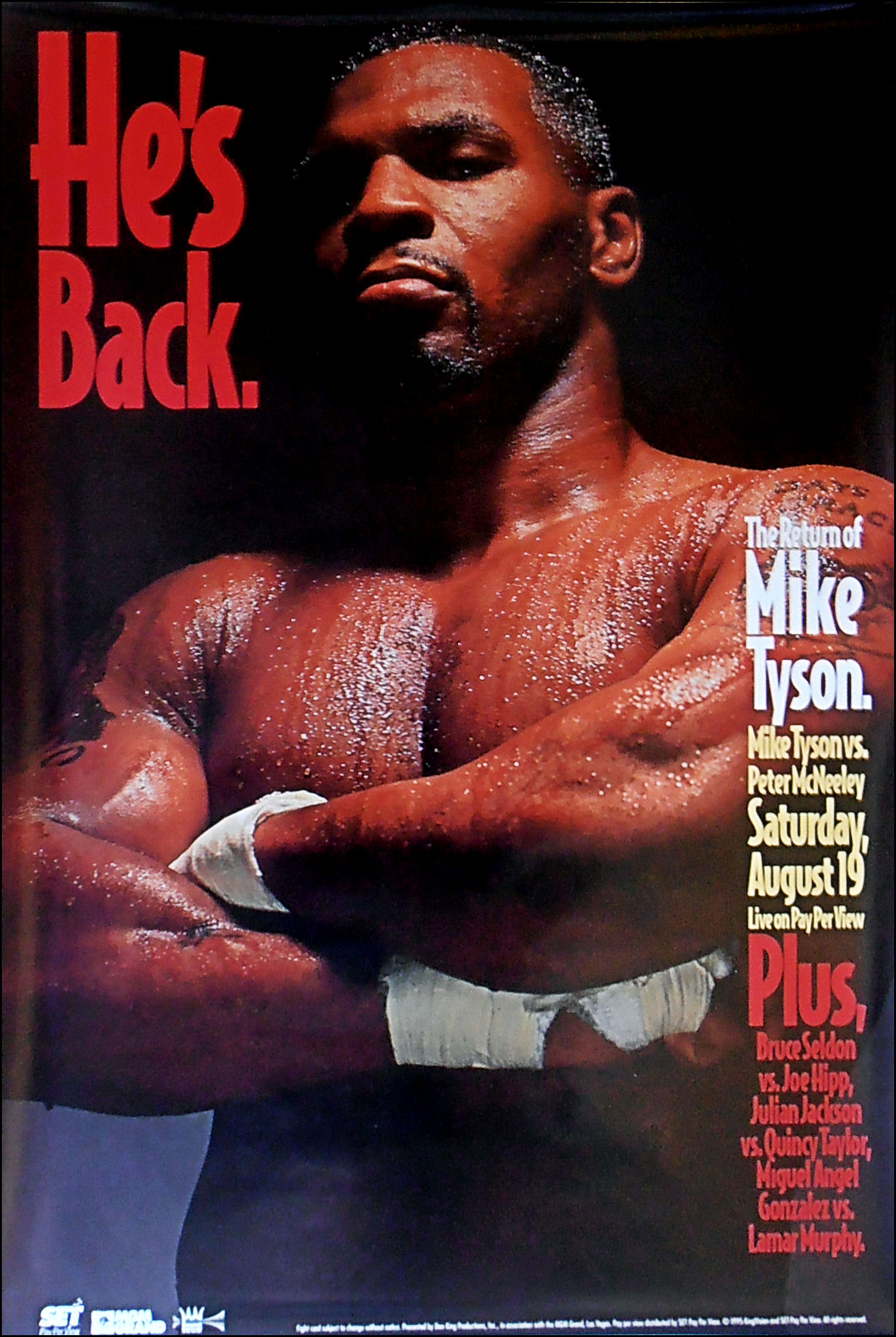 Description : Here we have an original official MGM Grand boxing Pay per view poster for the upcoming comeback fight.......Mike Tyson vs. Peter McNeeley, billed as "He's Back", took place on August 19, 1995 at the MGM Grand. The match marked the return of Mike Tyson to professional boxing after over four years away due to his 1991 arrest and subsequent conviction for rape in 1992 which led to Tyson serving three years in prison. Tyson was paroled on March 25, 1995 and on March 29, he would hold a short press conference that would announce his return to boxing as well as that Don King would remain his promoter. After much debate over who would be Tyson's first opponent in his comeback, including talks about a potential superfight with George Foreman, it was announced that Tyson would face little-known Peter McNeeley on August 19, 1995.