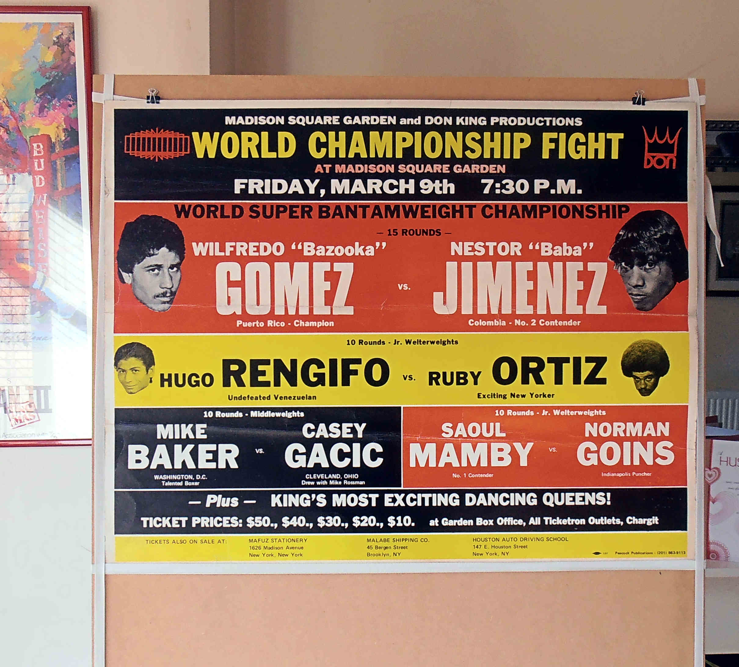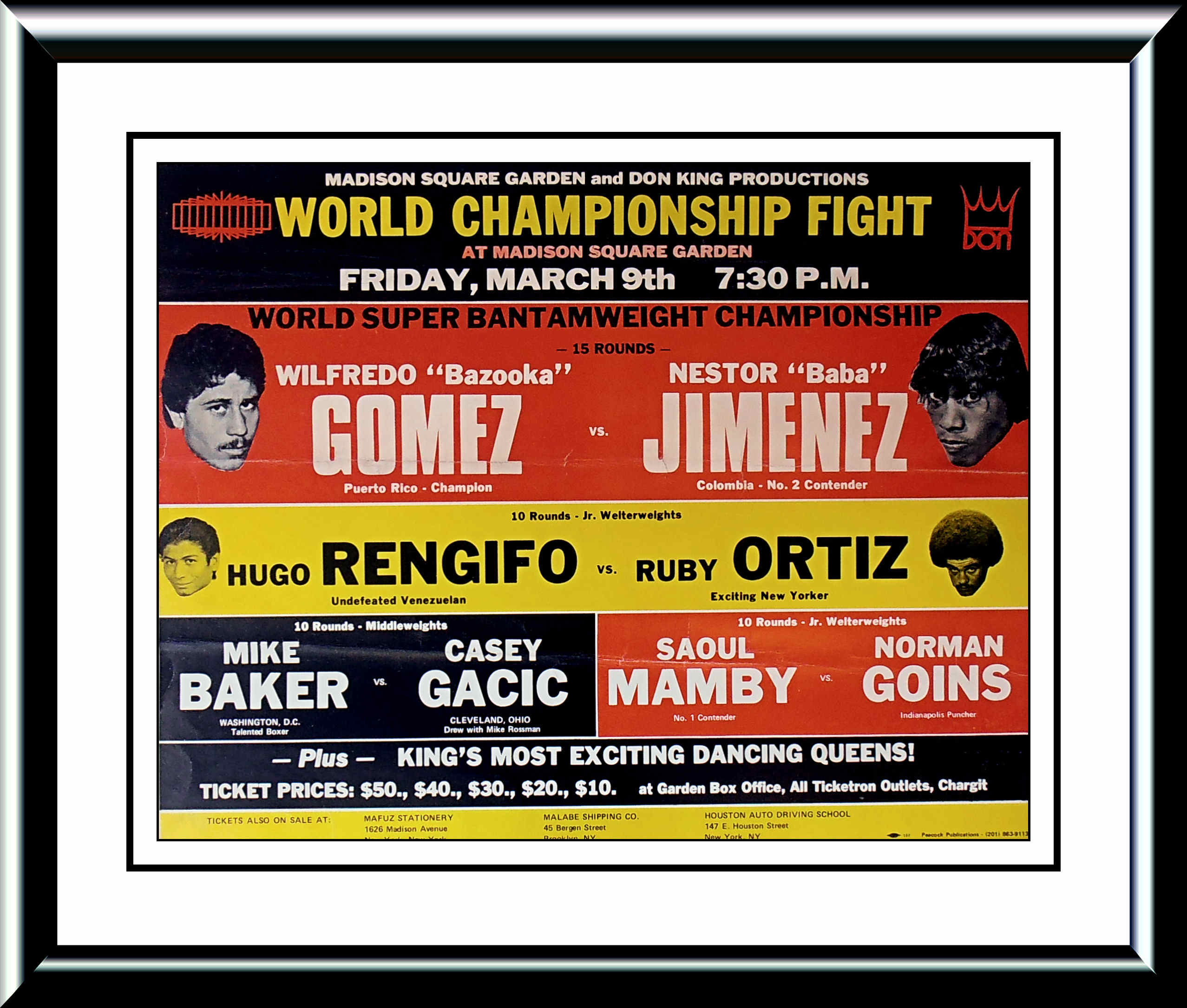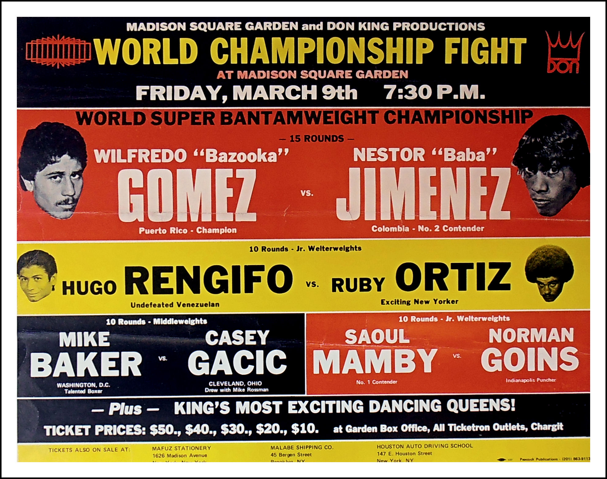Description : Here we have a vintage onsite poster from Don King productions for the 1st appearance in America of the Puerto Ricon phenomenon Wilfredo "Bazooka" Gomez the WBC World Super Bantamweight Champion.