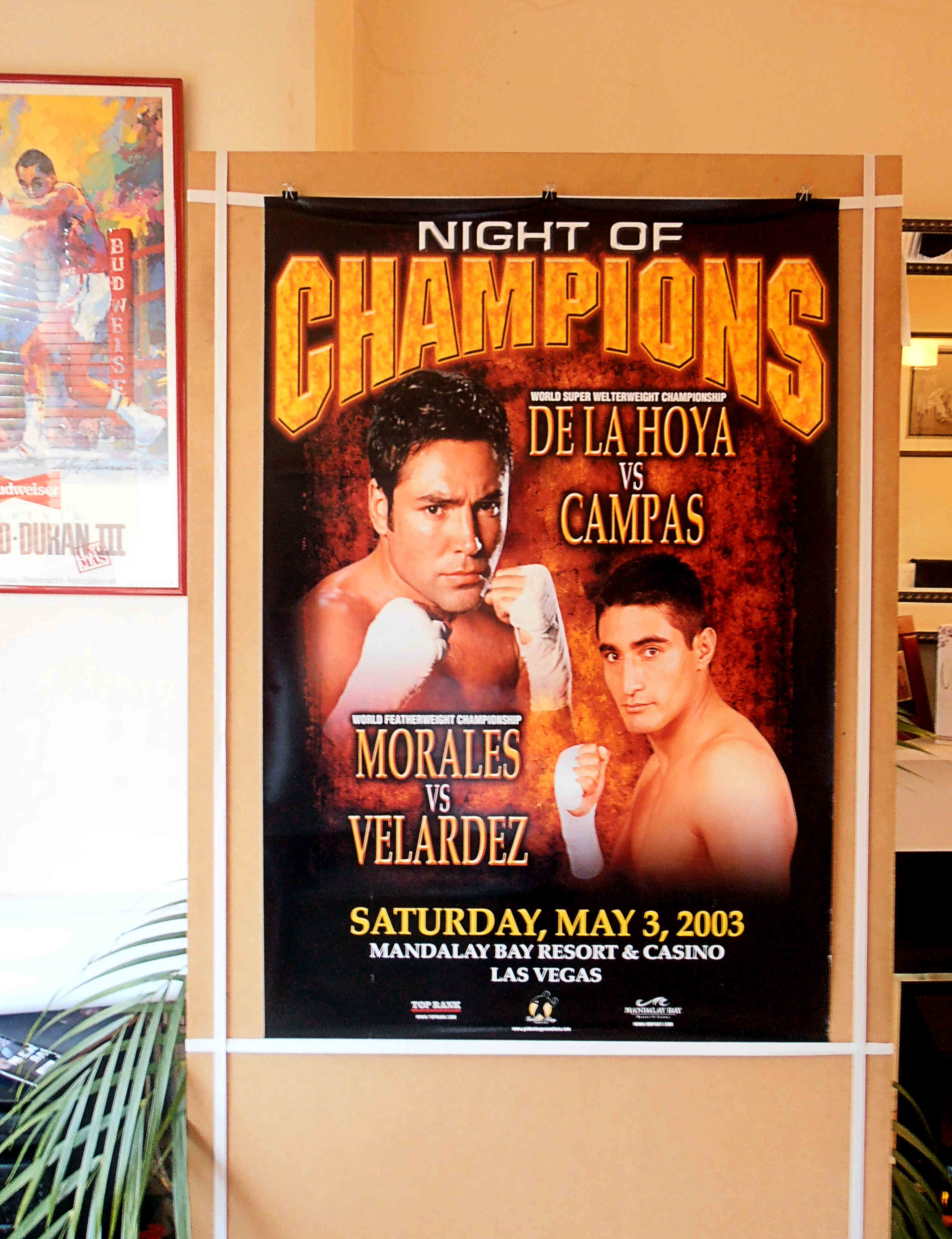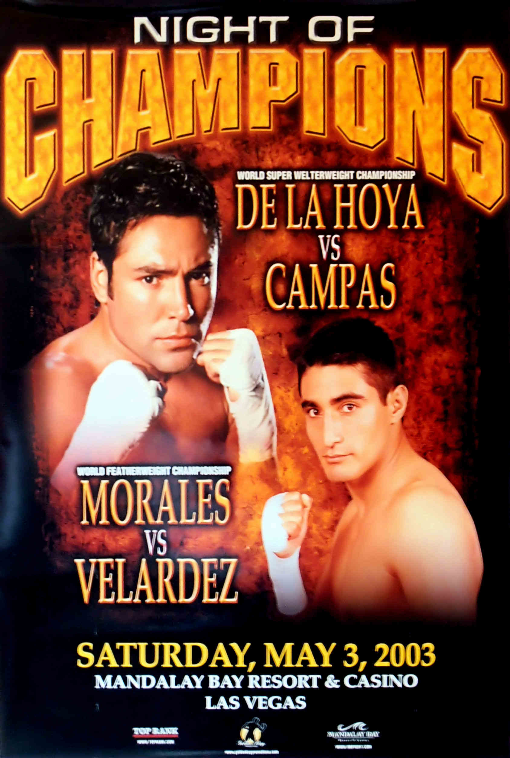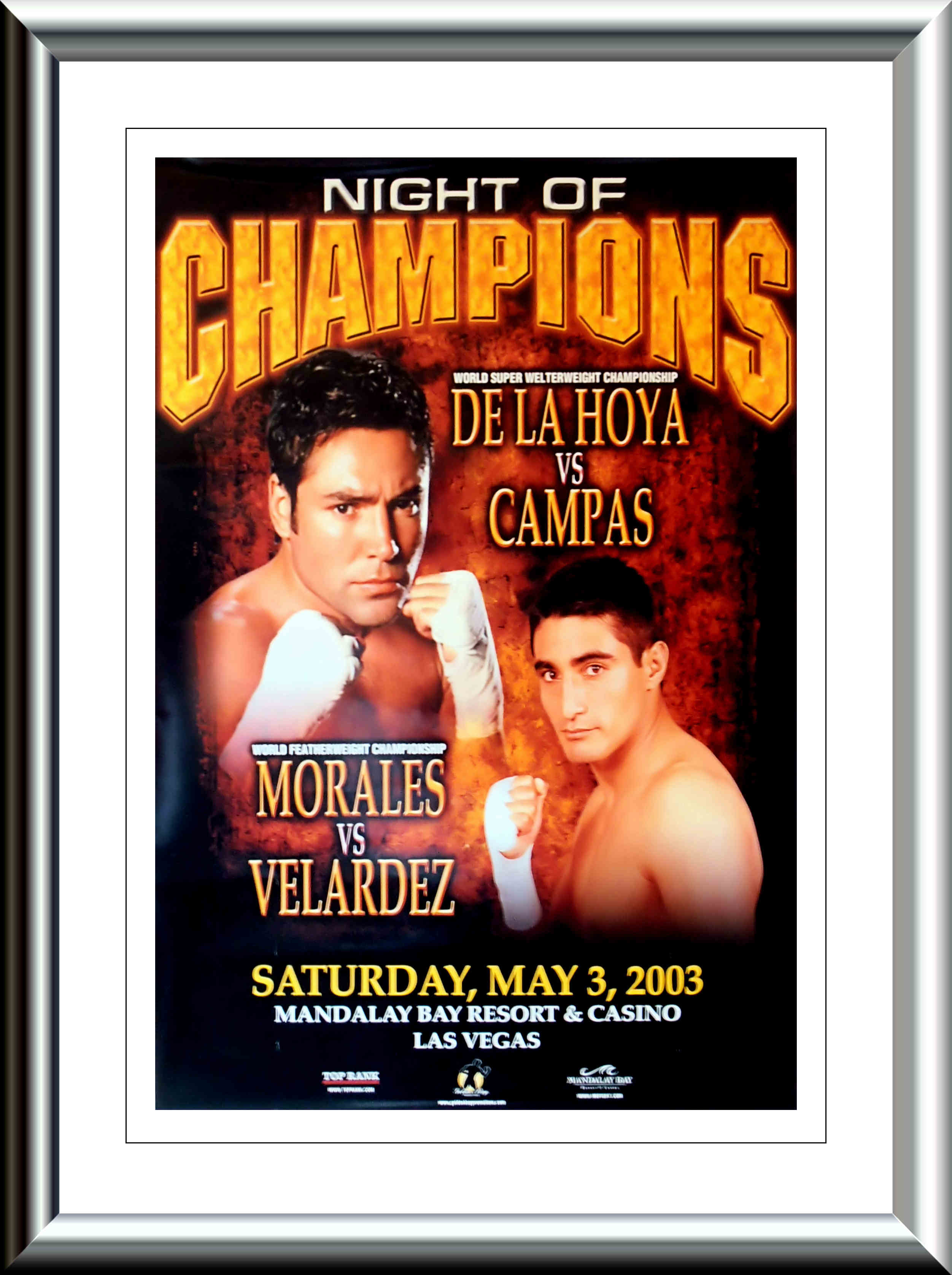 Description : Here we have an original onsite event poster for the Oscar De La Hoya Super/Welterweight title defence at the Mandalay Bay Las Vegas. Also on the bill was Eric Morales defending his WBC featherweight Title against Fernando Veladez. Oscar De la Hoya stopped Yori Boy Campas in 7 rounds so setting up the long awaited rematch with Sugar Shane Mosley.