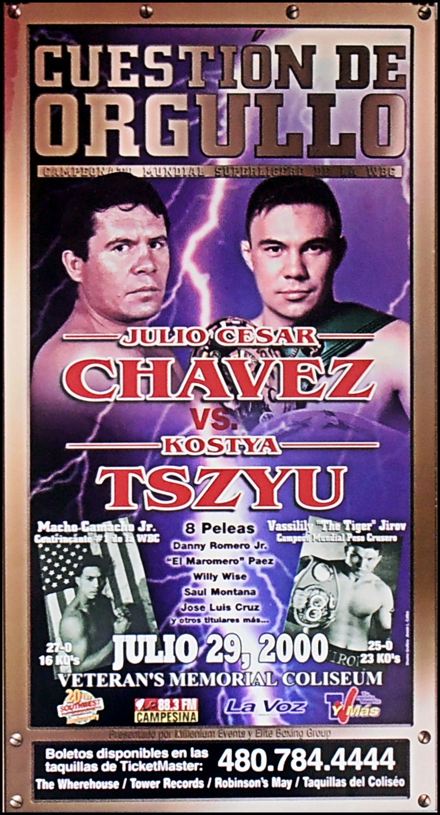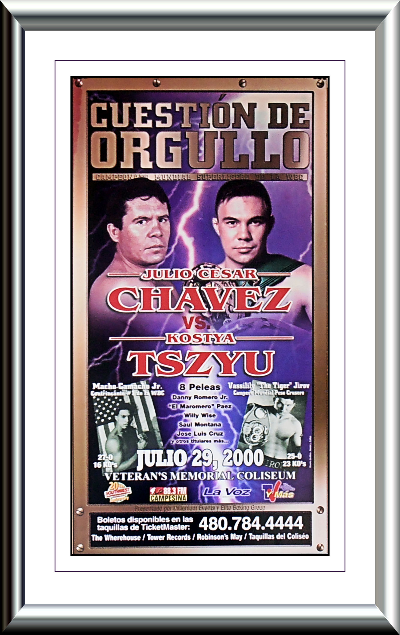 Description : Here we have the super rare original onsite poster from the Light/Welterweight championship match where Julio Cesar Chavez was hoping to turn back the clock at the age of 38 against the reigning defending champion from Russia via Australia the superb Kostya Tszyu. No turning back the clock here I'm afraid, as the aging Mexican legend Chavez lost the bout via 6th round TKO.