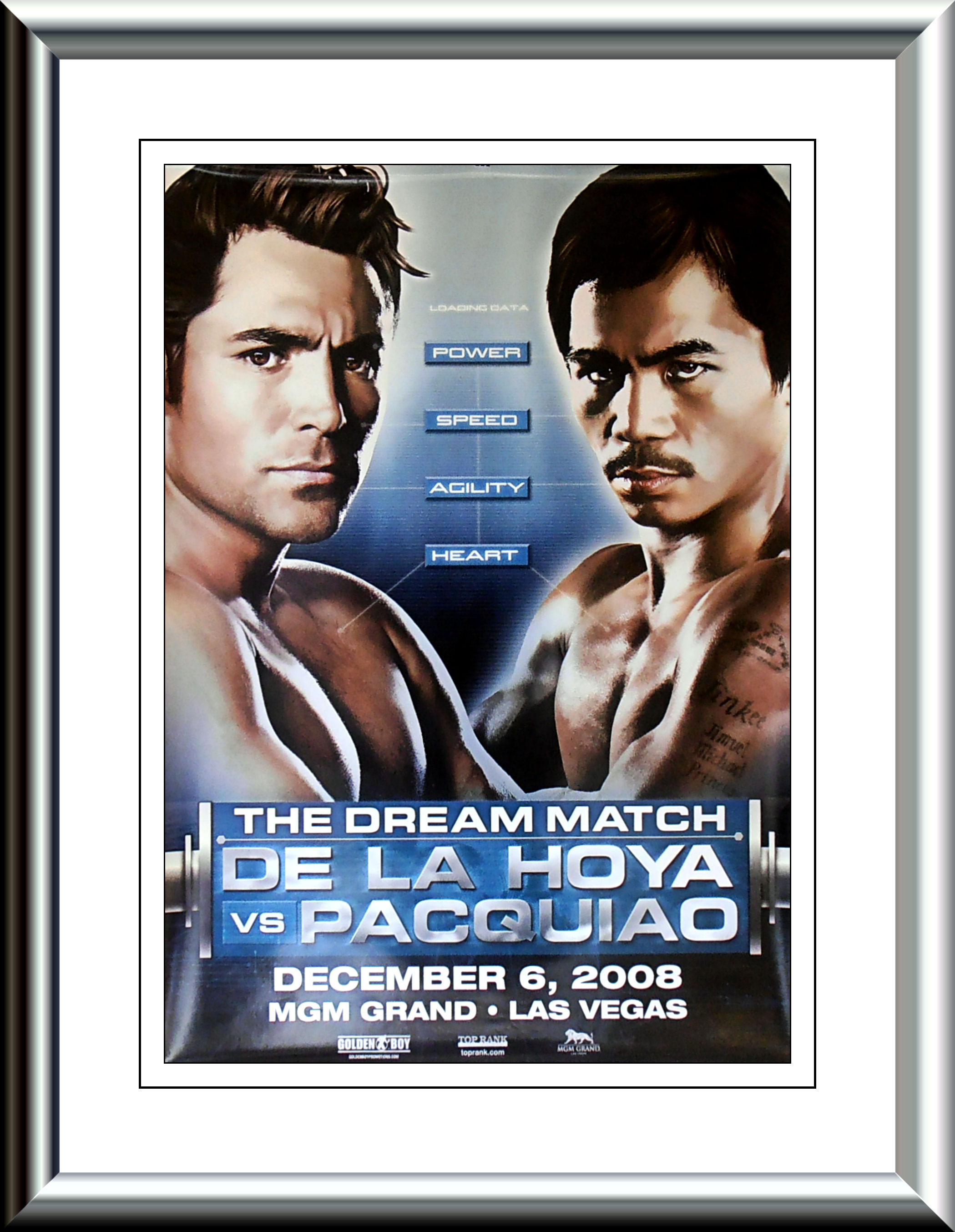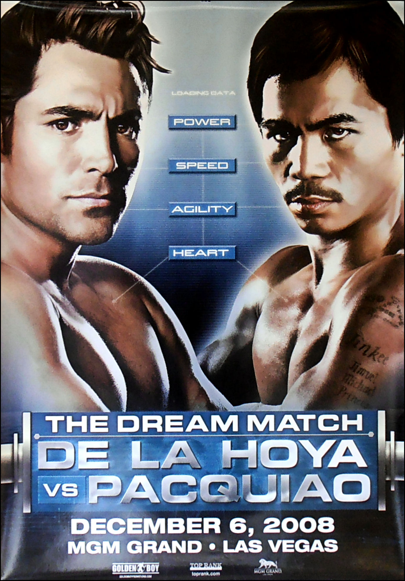 Description : Here we have the official MGM Grand Las Vegas main event onsite poster. This fight was billed as The Dream Match. The bout took place on December 6, 2008 at the MGM Grand Garden Arena, Las Vegas, Nevada, United States. Pacquiao defeated De La Hoya via technical knockout when De La Hoya decided not to continue with the fight before the start of the ninth round.