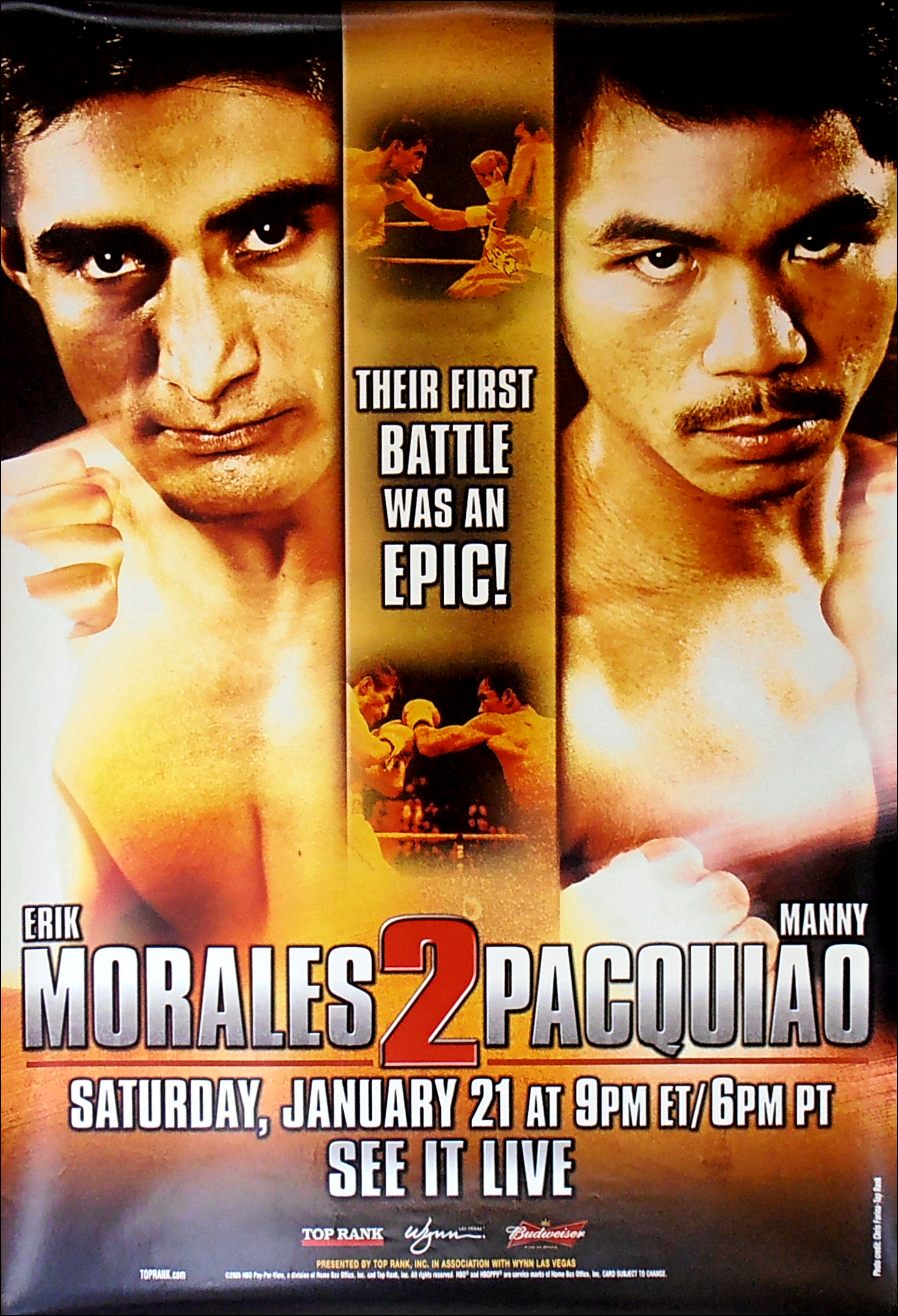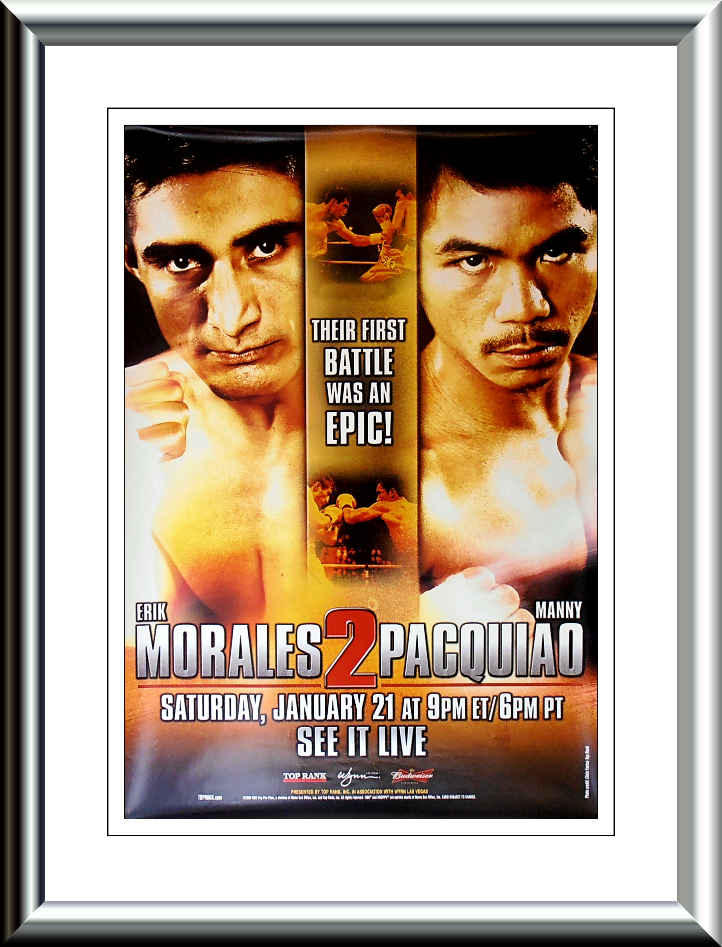 Description : Here we have the official Top Rank closed circuit/PPV poster for the 2nd meeting in an incredible trilogy between the great Mexican 3 division champion Eric Morales & 3 division champion Manny Pacquiao.
