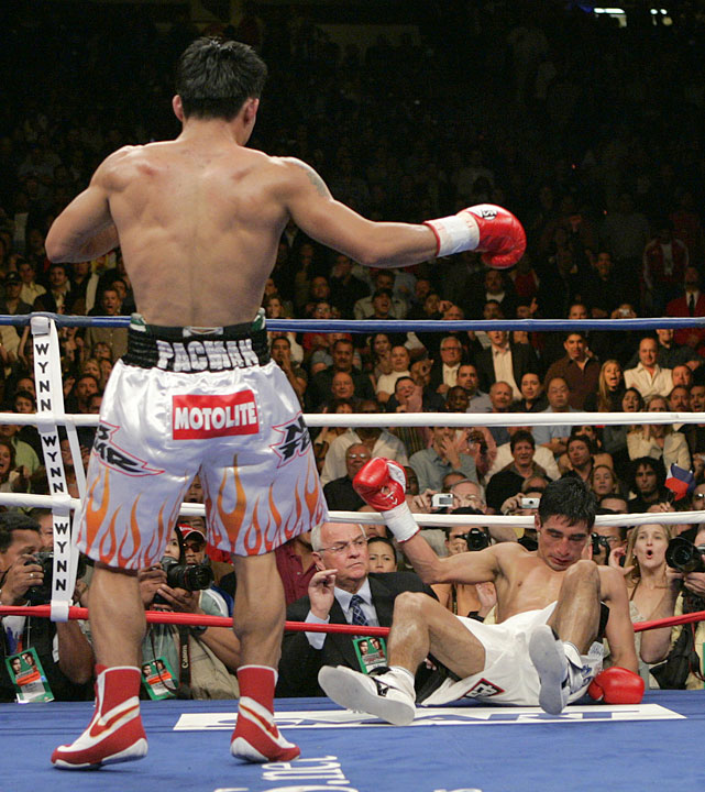 Pacquiao got matched up against Morales in a rematch which took place on January 21, 2006 at the Thomas and Mack Center in Las Vegas. Pacquiao had polished up his act since his defeat at the hands of Morales in their 1st encounter & now took boxing a bit more seriously having turned into a box/fighter rather than an all out tear-up merchant. During the fight, Morales escaped being knocked down twice, once in the second round by holding onto the ropes and once in the sixth by falling on the referee. Pacquiao eventually knocked Morales out in the tenth, the first time Morales was knocked out in his boxing career.